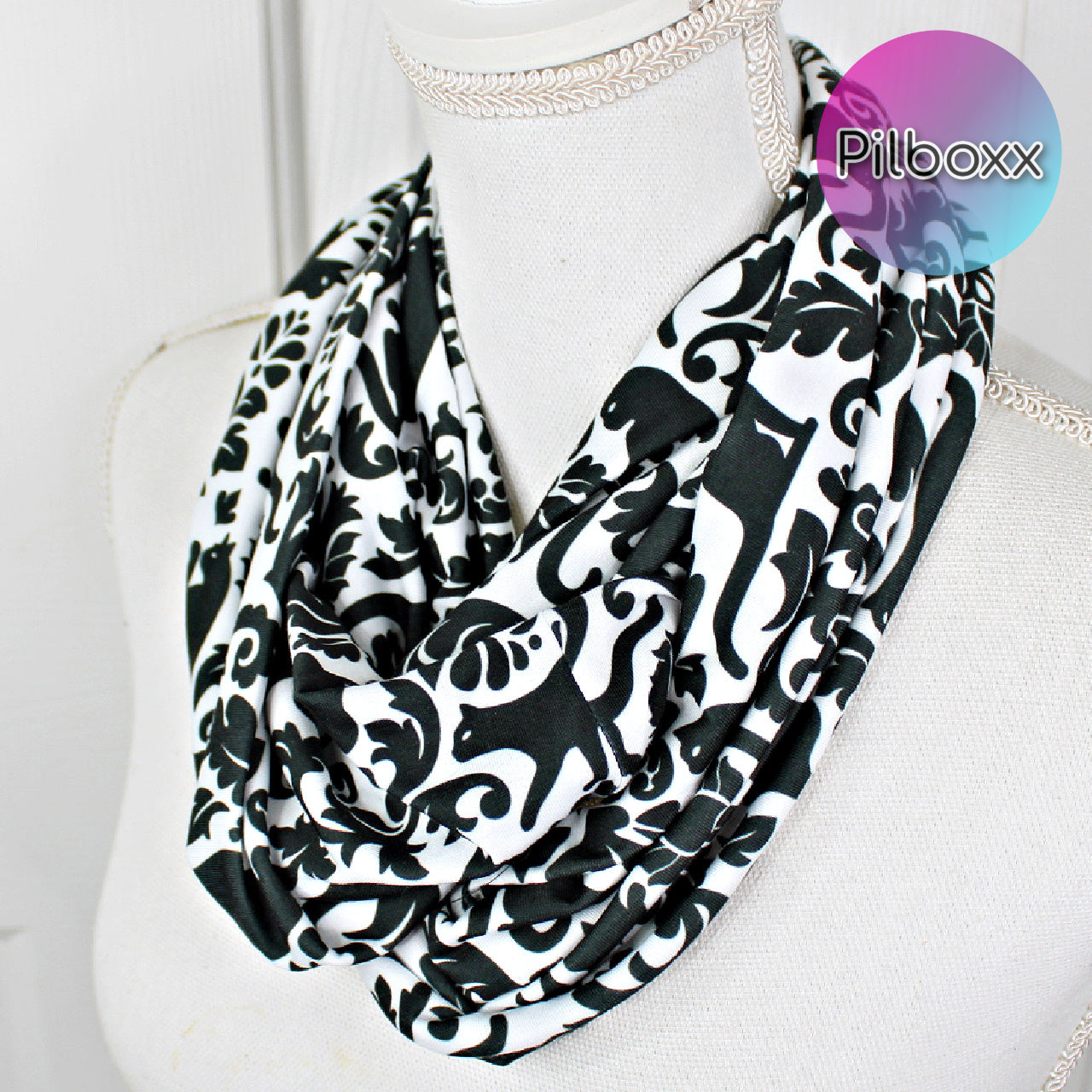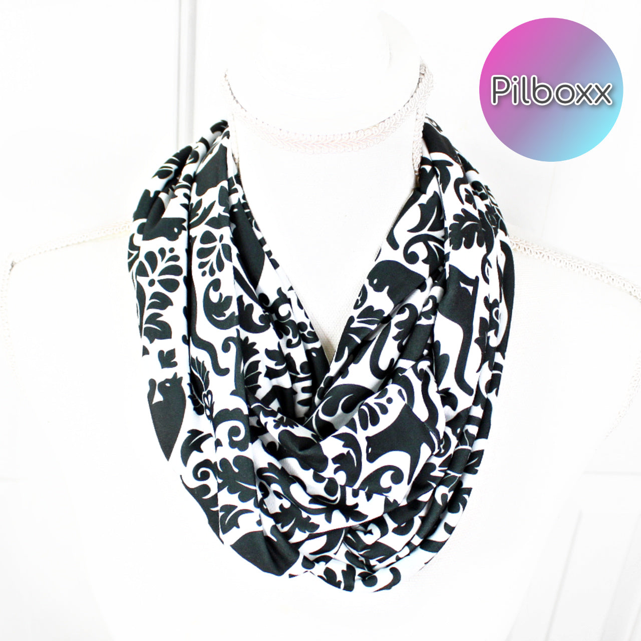 Black and white cat scroll print infinity scarf. Handmade with soft jersey knit fabric, it won't fade, shrink, or pill. Versatile and cozy, wear it long or double it up for extra warmth. Perfect gift for any occasion.