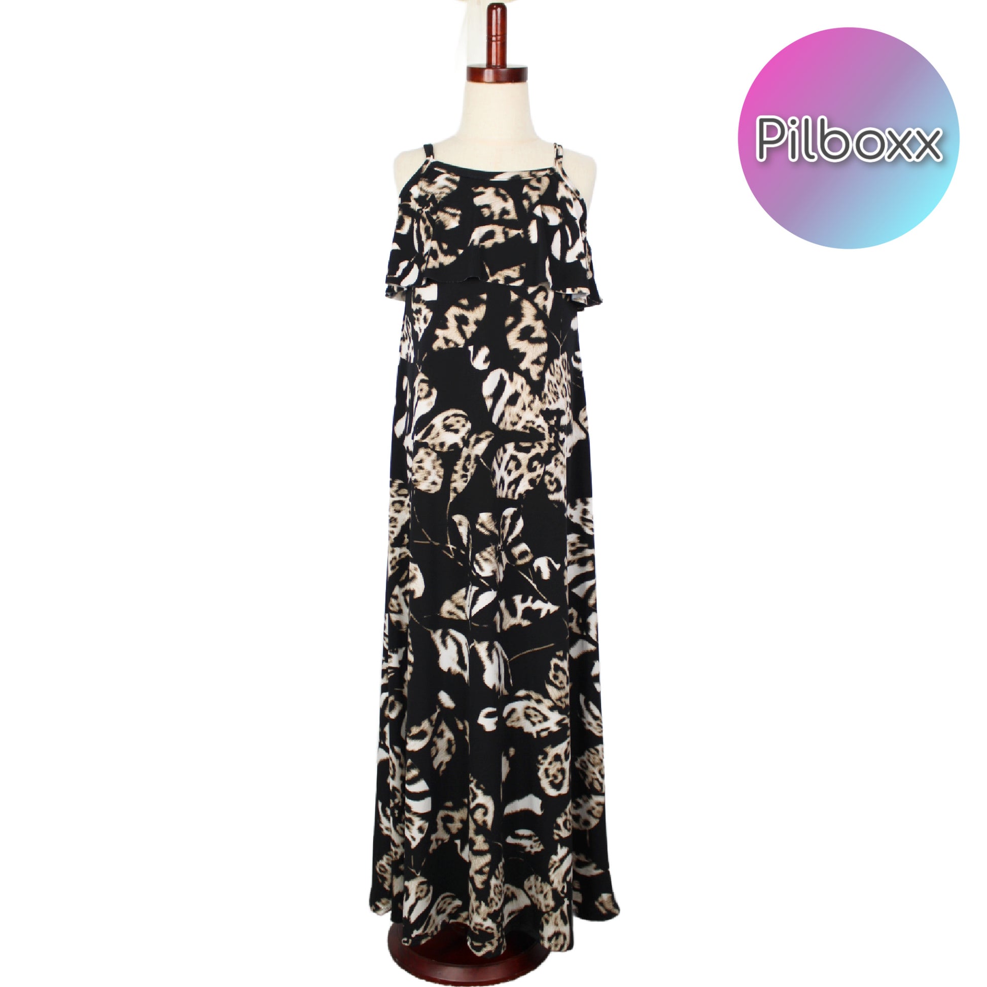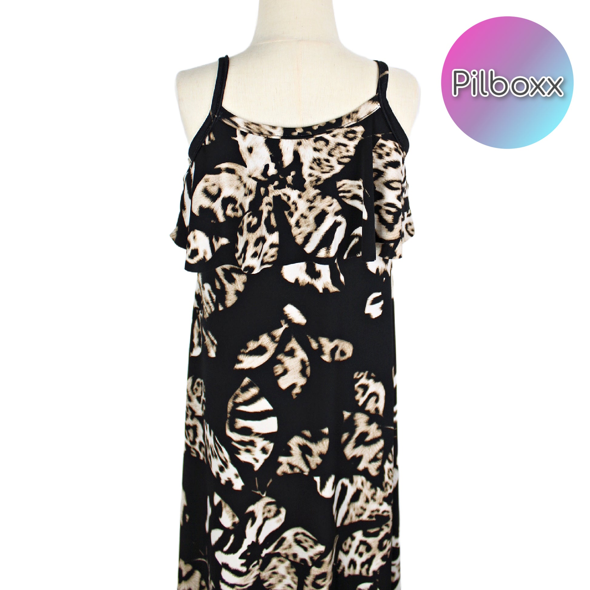 Let your little one shine in this handmade black maxi dress, featuring bold Hawaiian-inspired leopard print flowers for a fun, tropical vibe. Designed with spaghetti straps and adorable front and back ruffle, this dress brings effortless beachy charm. Perfect for sunny adventuretropicals, vacations, or casual days out, its flowy silhouette ensures comfort and style—all crafted with care and attention to detail.