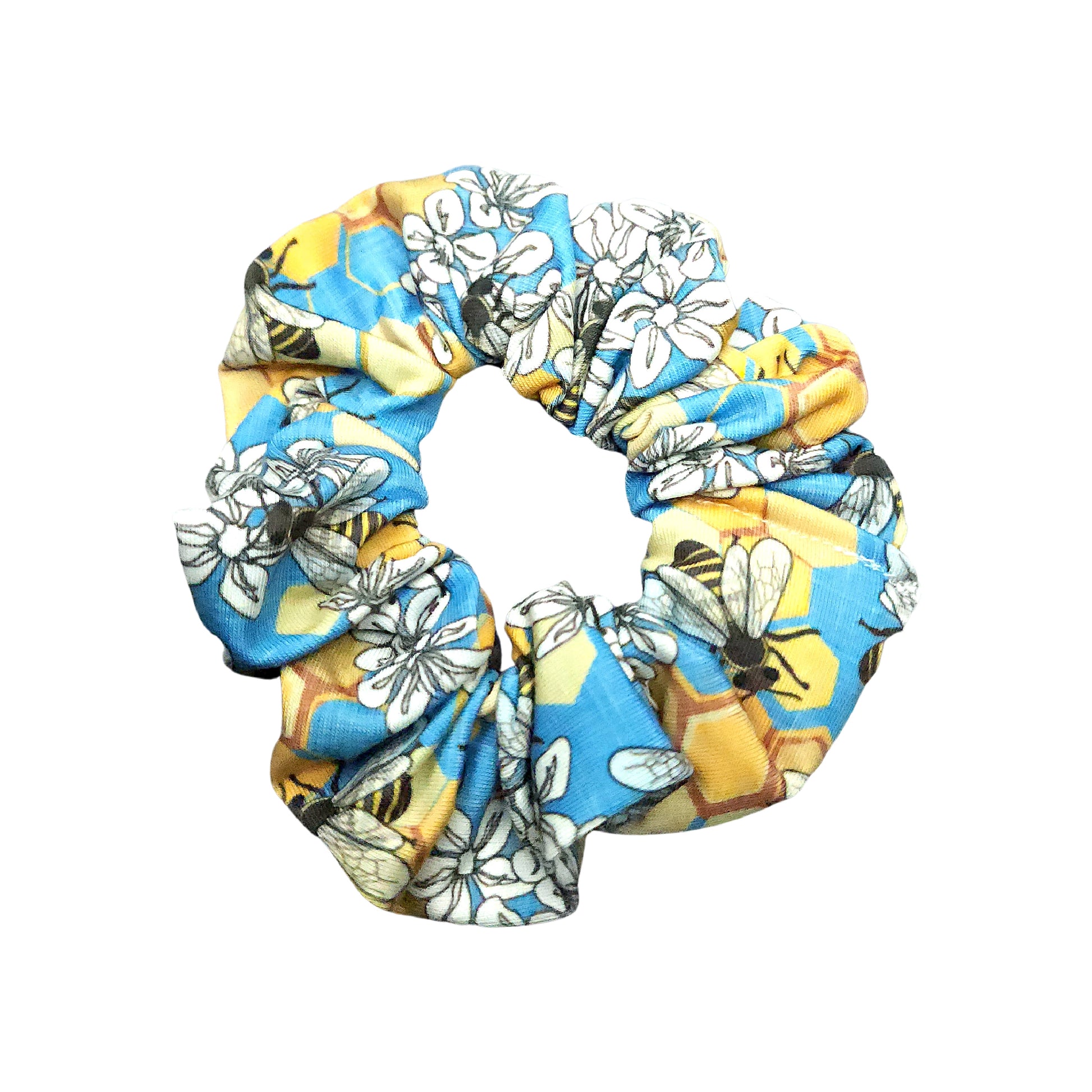 Blue bee print scrunchie, handmade from soft and stretchy knit fabric. Wear your hair up with confidence that it won't break off your beautiful strands. The inside of my hair ties is made securely with flat, quality knit elastic sewn together inside, giving it a long life! These are all completely machine washable and can go in the drier, so throw it in with your regular clothing. They won't stretch, fade or lose their shape. And when you're not wearing it in your hair, it looks great on your wrist.