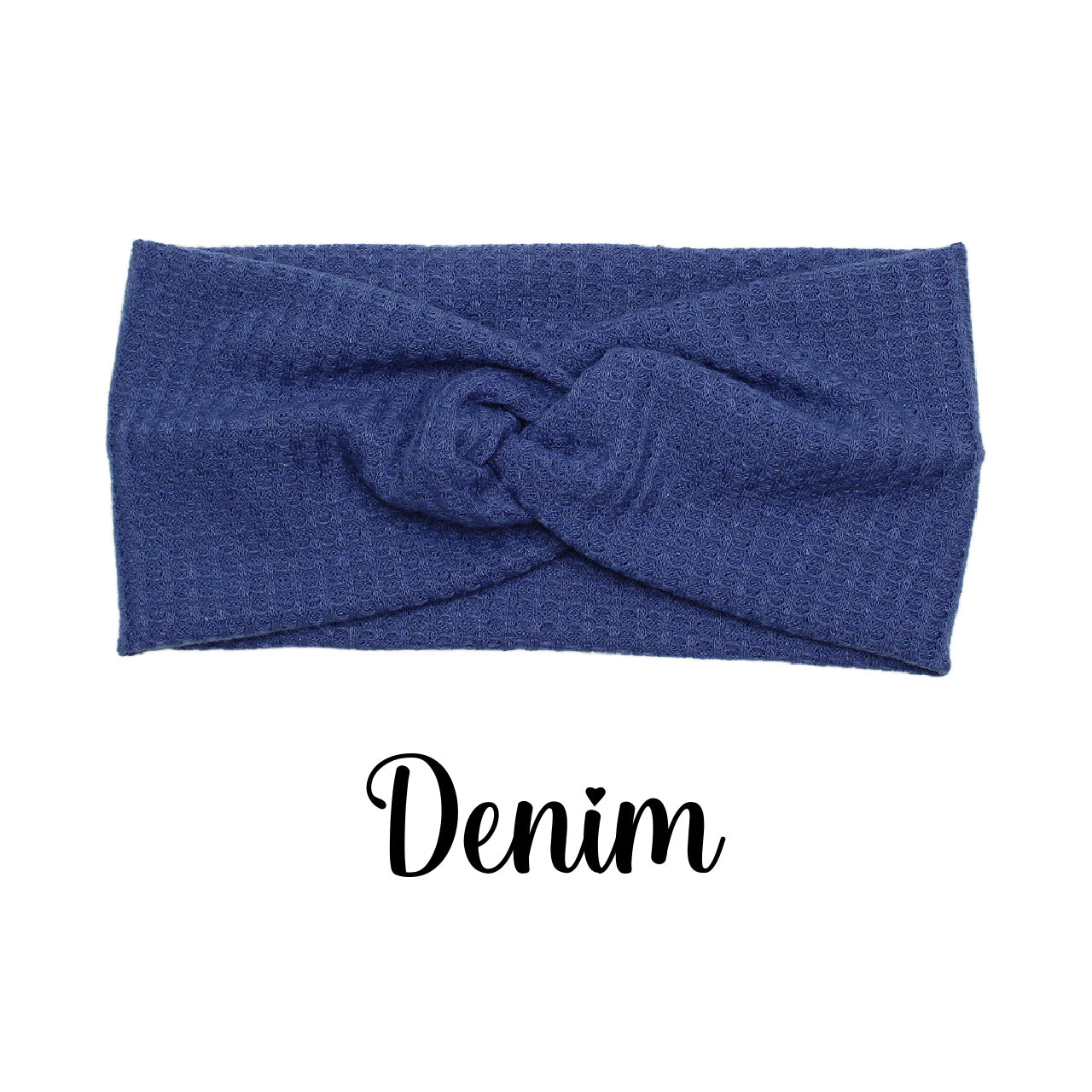 Waffle knit headbands with a cute, front twist detail. Handmade from soft, lightweight and comfortable fabric for every day, all day, headache-free wear. Makes a great gift! Perfect material for fall and winter. These are a little wider than my regular headbands, so they would make the perfect ear-warmers! Choose from four different shades of blue: Navy-Blue, Light Blue, Denim, or Misty Blue.