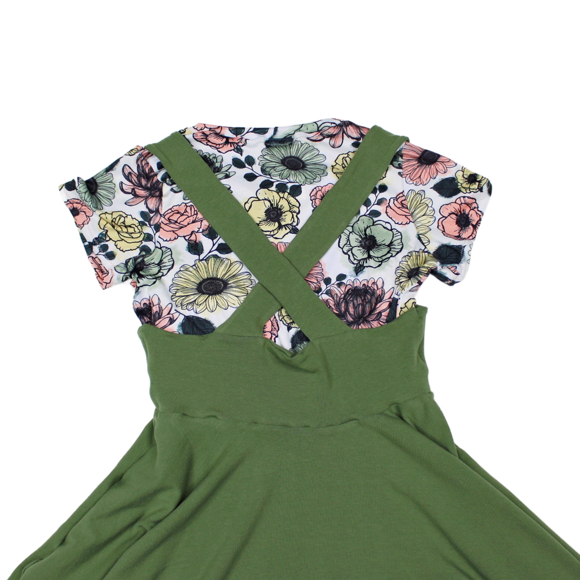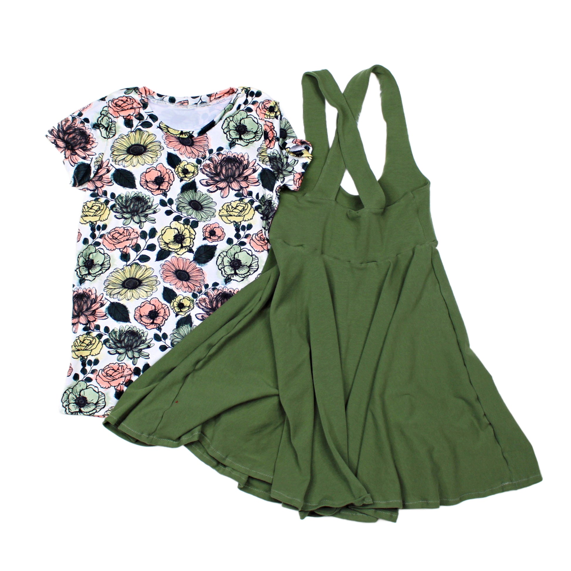 Boho Floral Tee & Olive Green Suspender Dress Set, TAT 1-2 weeks