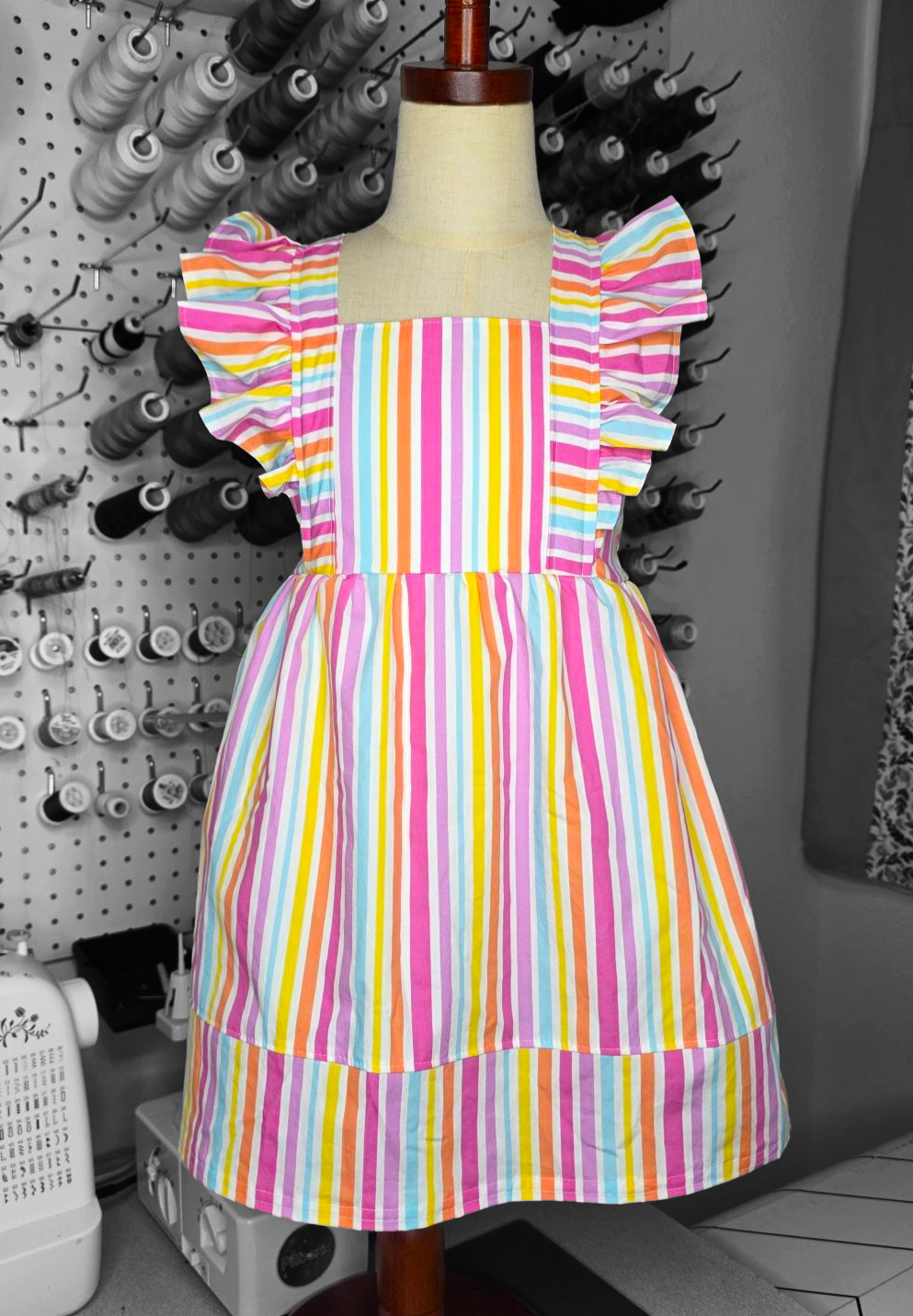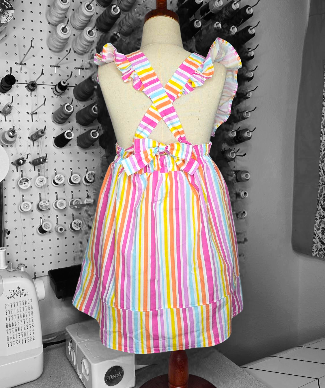Brighten up your little one’s wardrobe with this adorable Candy Stripe Ruffle Dress! Handmade from soft, breathable cotton, this playful piece features vibrant vertical stripes in pink, purple, yellow, blue, and orange — just like your favorite candy shop!