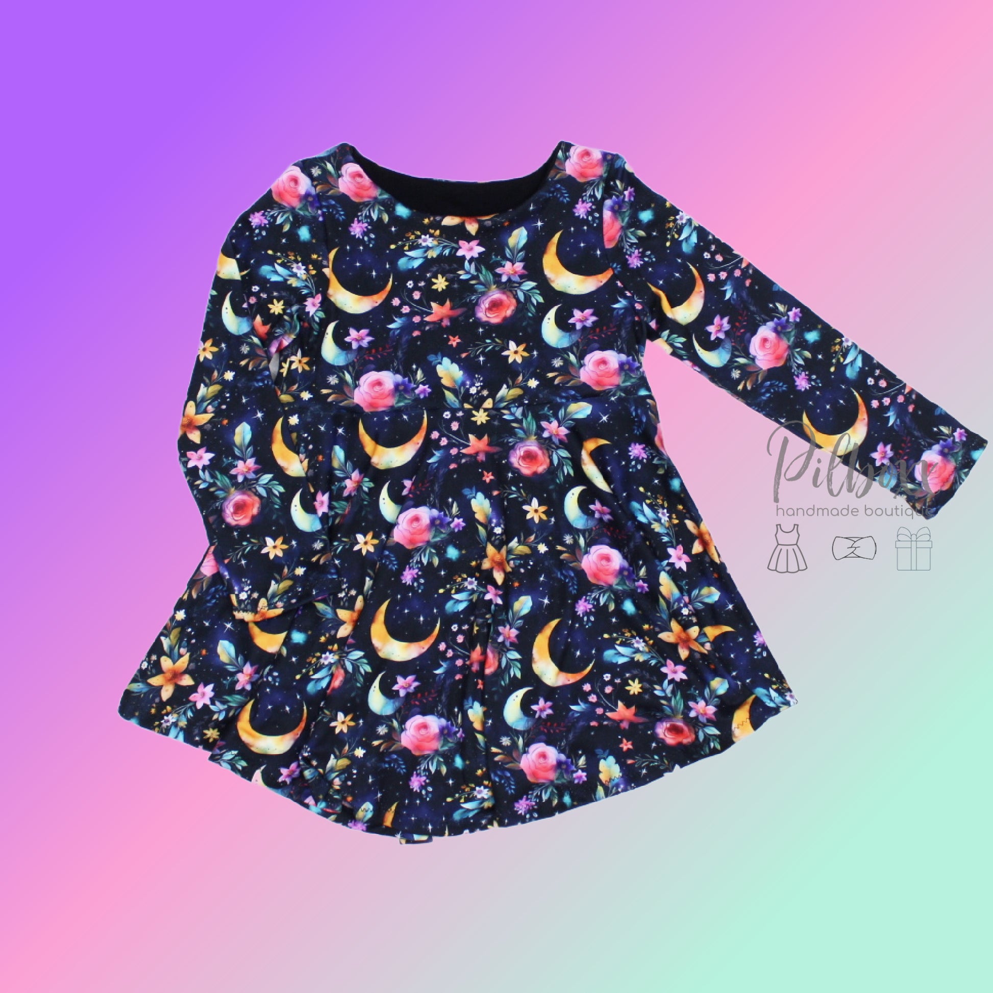 Magical celestial print dress with roses, moons and stars on black, handmade from super soft and comfortable stretch fabric, your little one will be feeling so pretty in this dress. The bodice is lined, so there are two layers of fabric on top. Three sleeve styles to choose from. The skirt of the dress is longer in the front and back and shorter on both sides. Pair this beauty with some comfy leggings and cute boots and you're good to go! Pullover style. No annoying tag in the back. I use a tag-less size label that sits flush with the fabric.