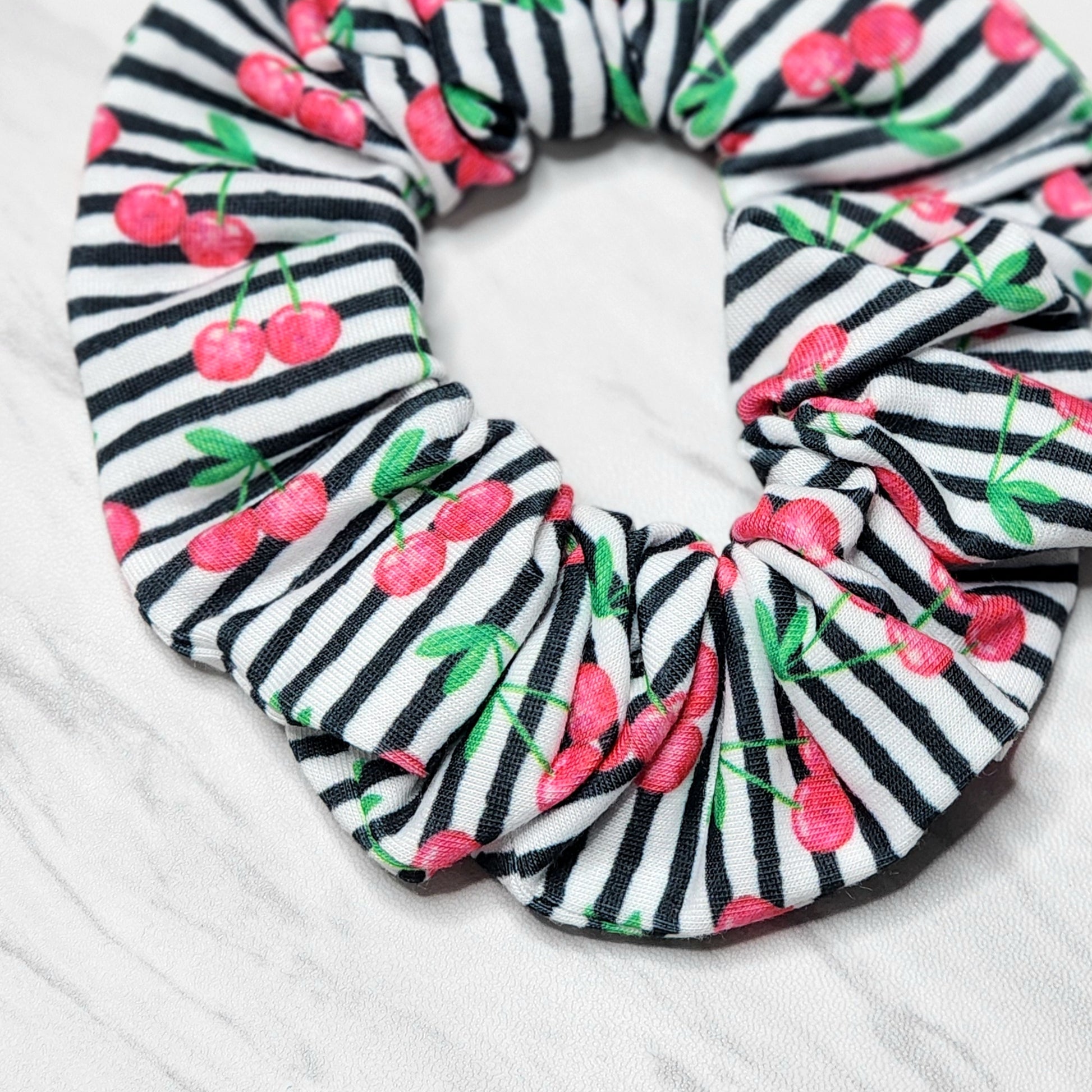 Red cherry scrunchie, handmade from soft and stretchy jersey knit fabric. Wear your hair up with confidence that it won't break off your beautiful strands. The inside of my hair ties is made securely with flat, quality knit elastic sewn together inside, giving it a long life! These are all completely machine washable and can go in the drier, so throw it in with your regular clothing. They won't stretch, fade or lose their shape. And when you're not wearing it in your hair, it looks great on your wrist.