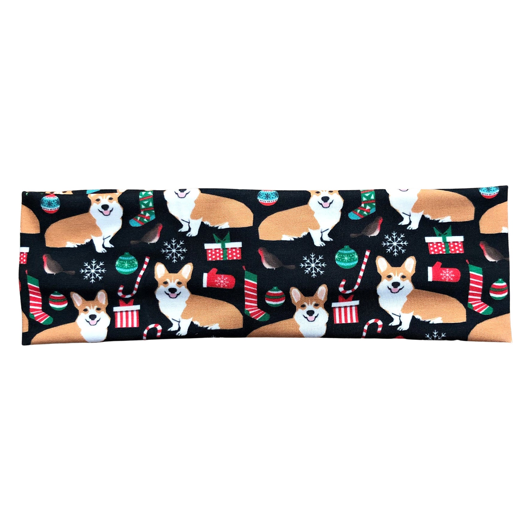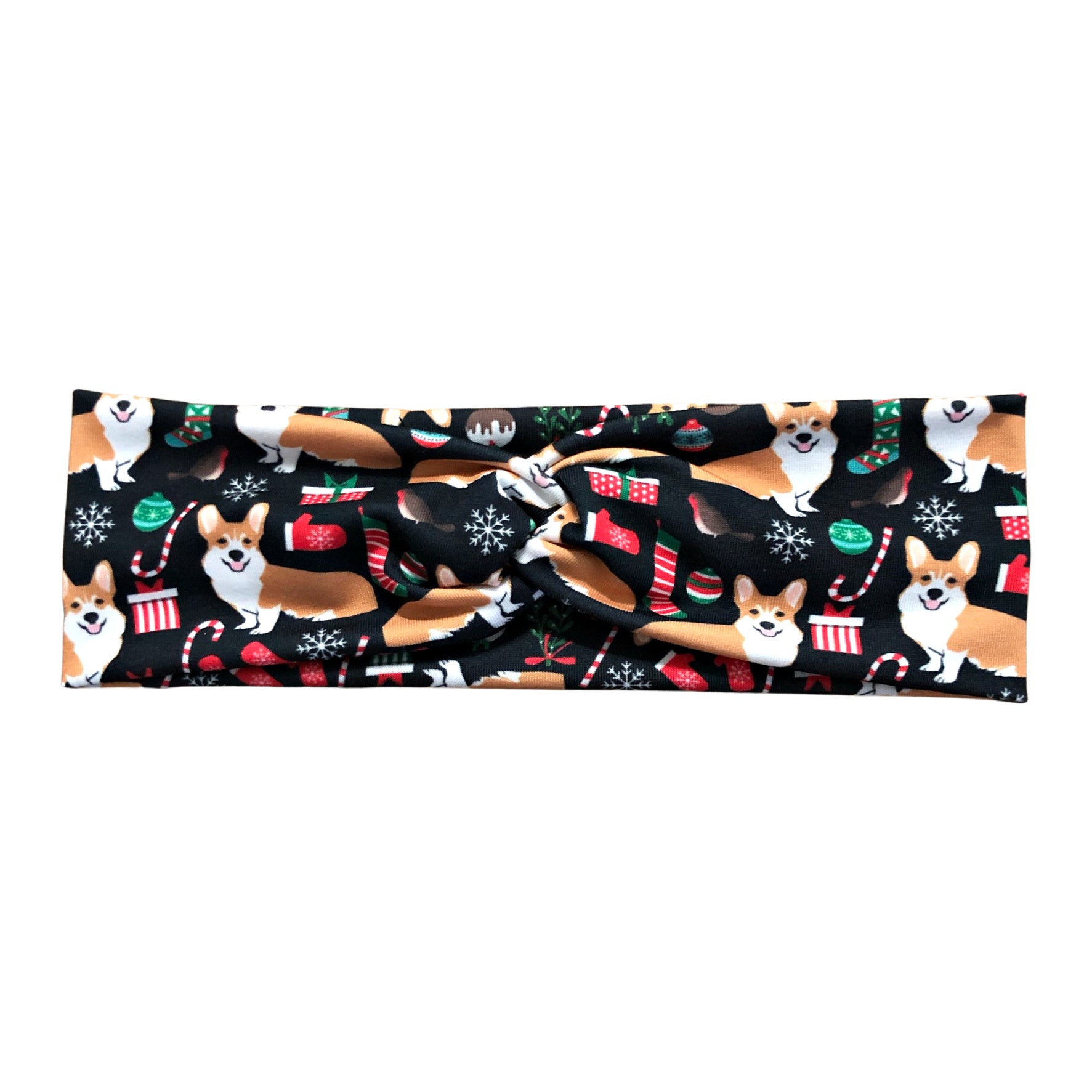 Christmas corgi dog print headband with front twist detail*. Handmade from lightweight and comfortable jersey knit fabric for everyday wear.