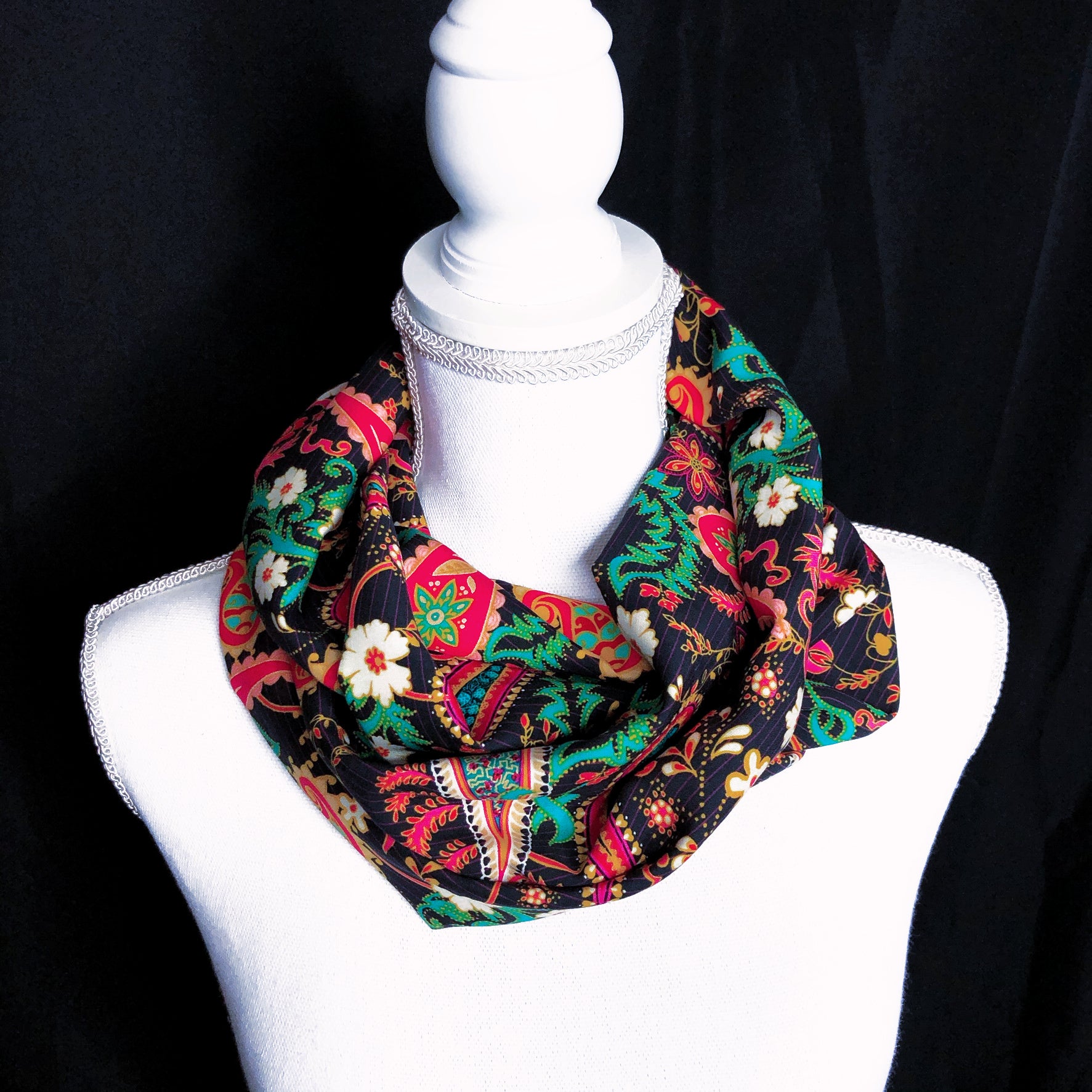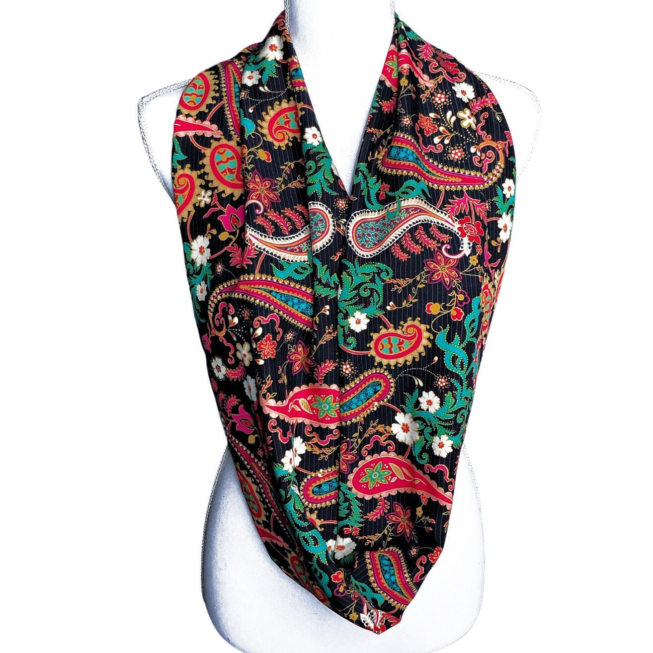 Lightweight and silky, this boho paisley print infinity scarf is long enough to wrap around twist. The perfect, earthy, hippie accessory.