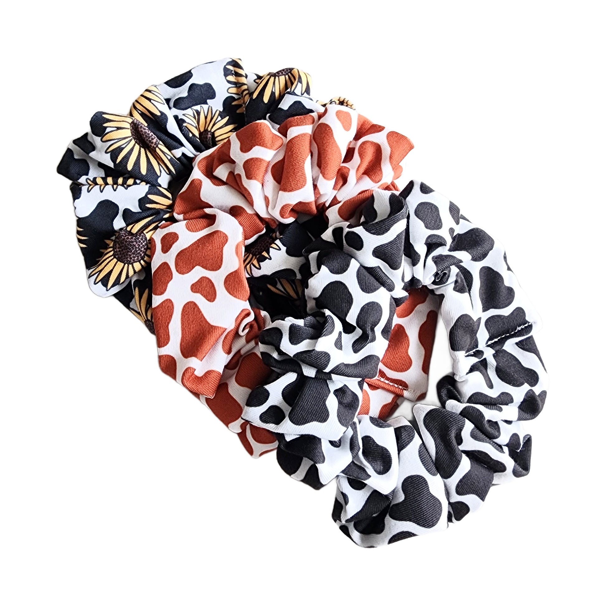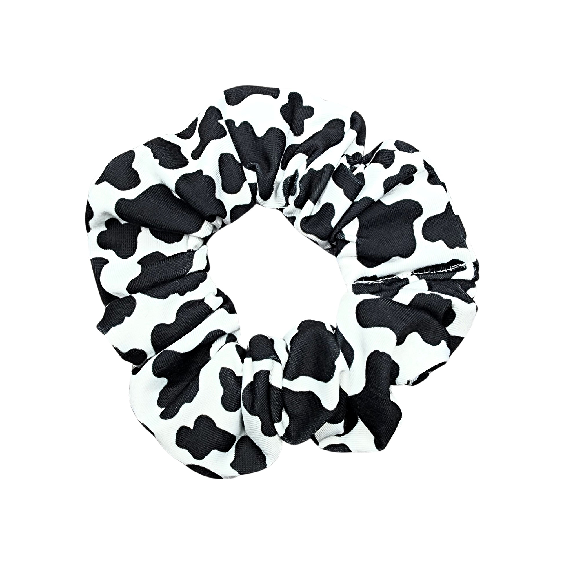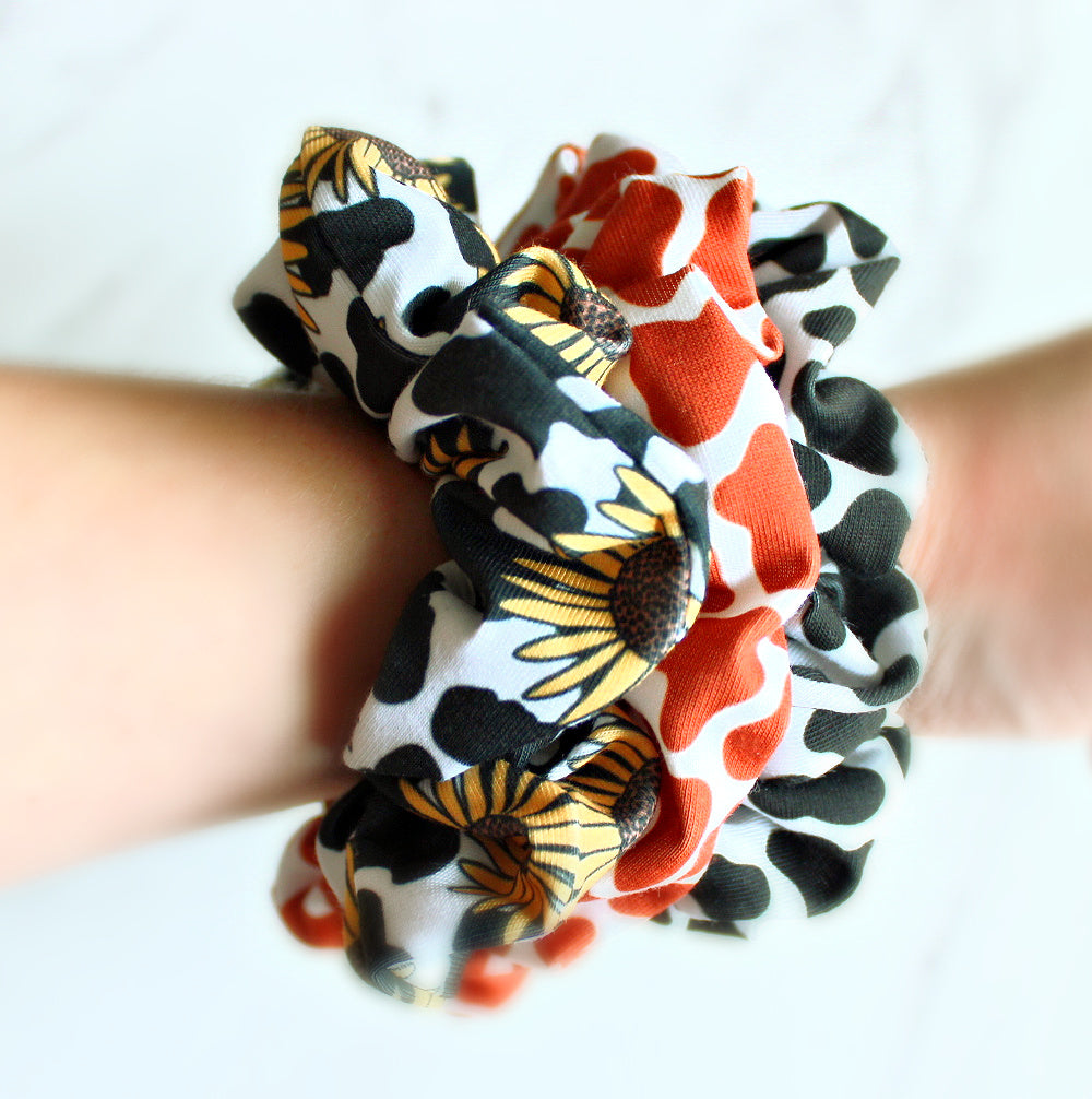 Cow print scrunchie made from soft jersey knit fabric. Choose your favorite! Black and white, brown and white or sunflower. Better for your hair than standard hair ties and looks cute on your wrist when you're not using it! Machine washable. Matching headbands available, sold separately.