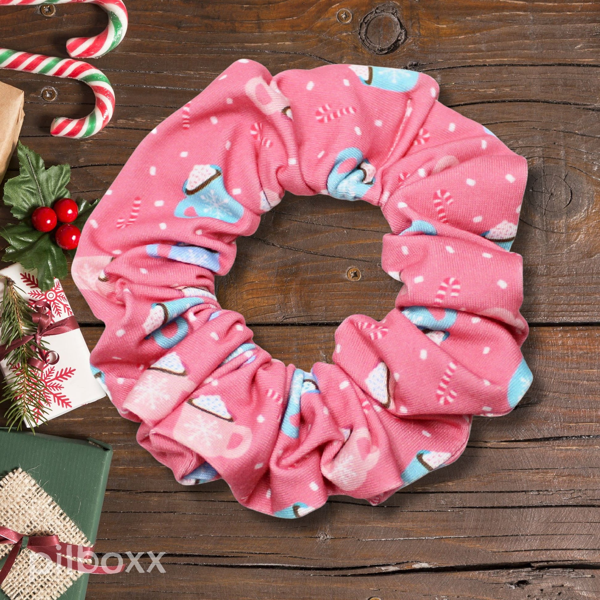 Cutesy Christmas scrunchies in your choice of pattern, handmade from soft and stretchy knit fabric. Choose from blue gnomes, pink hot cocoa mugs and candy canes or gray snowflakes.