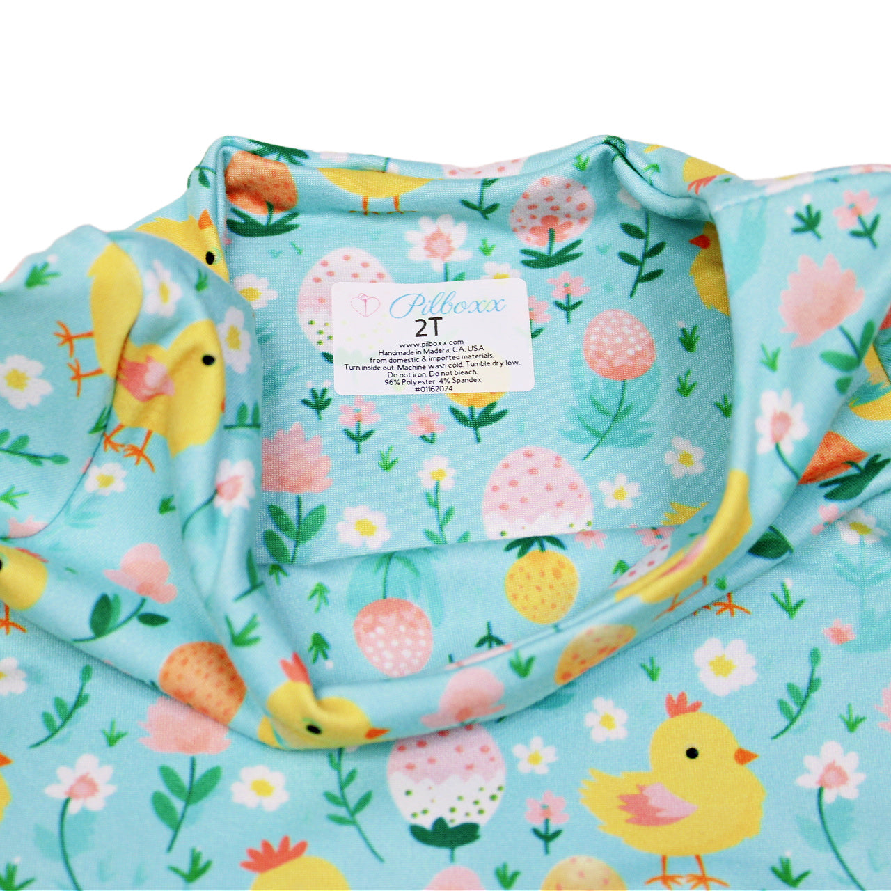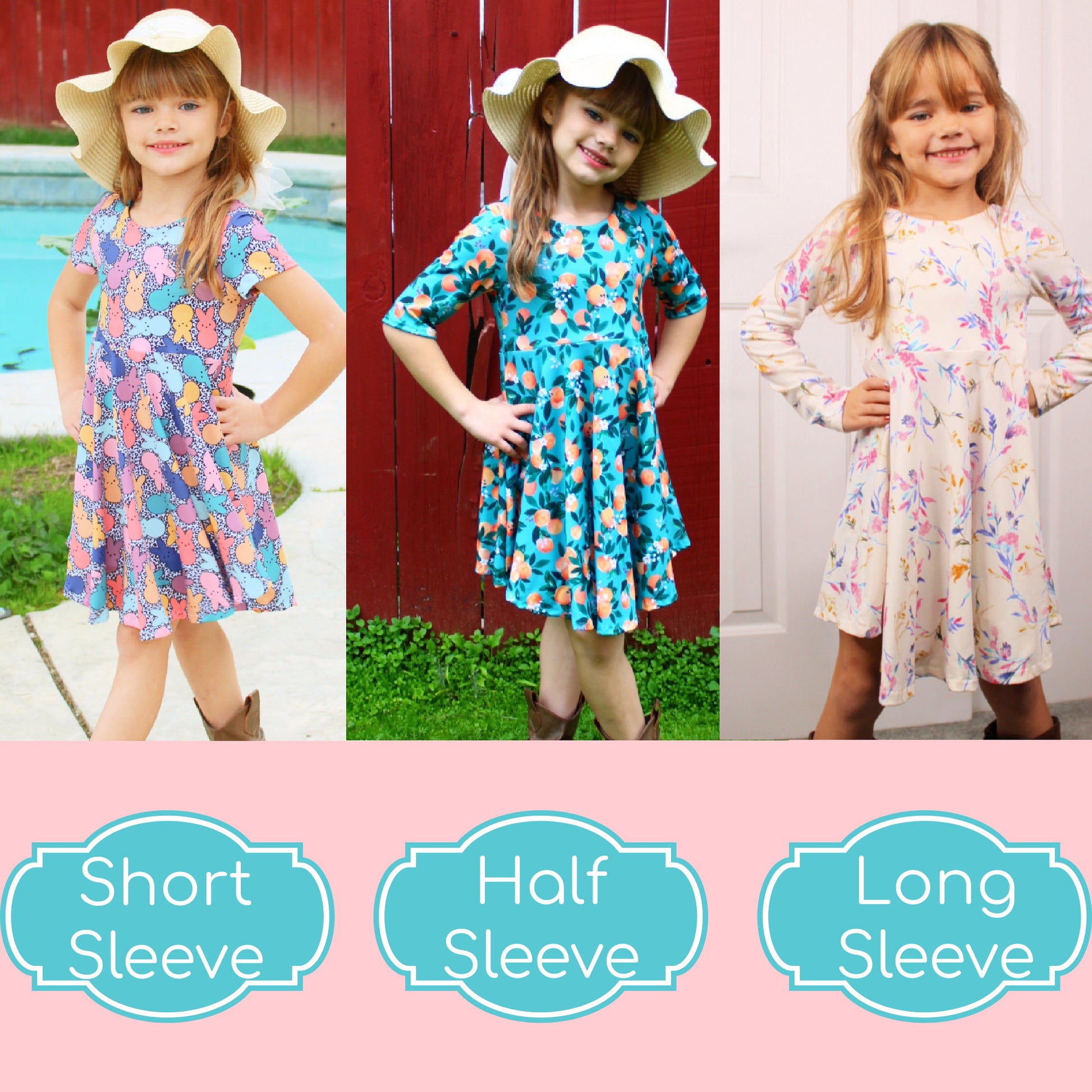 Easter twirly dress for girls, handmade from super soft and comfortable stretch fabric, your little one will be feeling so pretty in this dress. The bodice is lined, so there are two layers of fabric on top. Three sleeve styles to choose from. The skirt of the dress is longer in the front and back and shorter on both sides. Pullover style and tag-less.