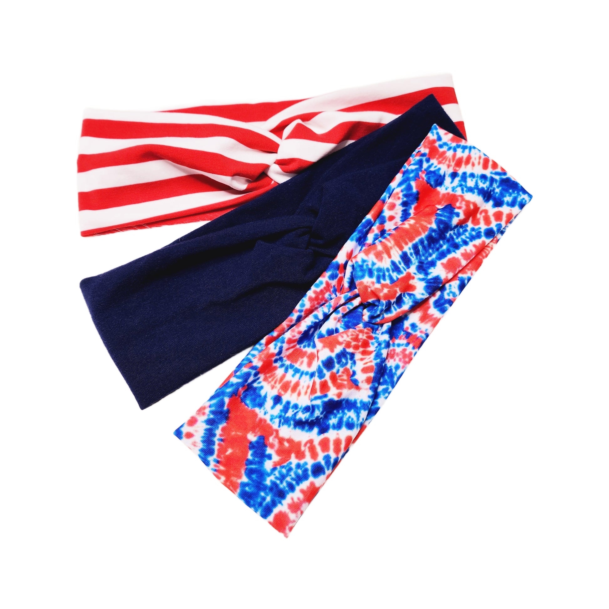 Celebrate Independence Day in style with this three-headband bundle. Red, white and blue tie dye, red and white stripes and a solid navy blue.