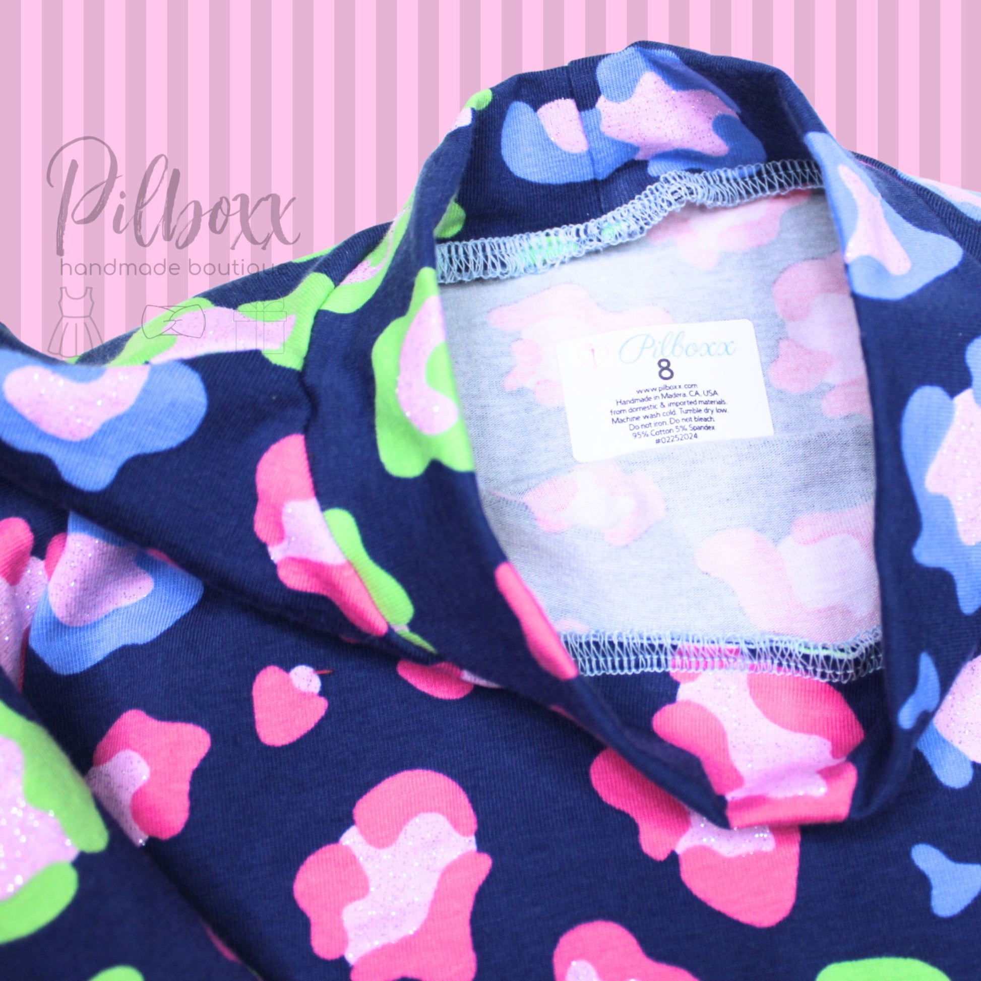 Colorful, glittery cheetah print shirt for girls! Handmade from soft stretch fabric that's comfortable and breathable against their skin. I made this shirt with a mock turtleneck and puffy bishop sleeves for that vintage / retro style. Pair with my cotton leggings (sold separately). Colors that match: Periwinkle (shown), Lime green and Pink.