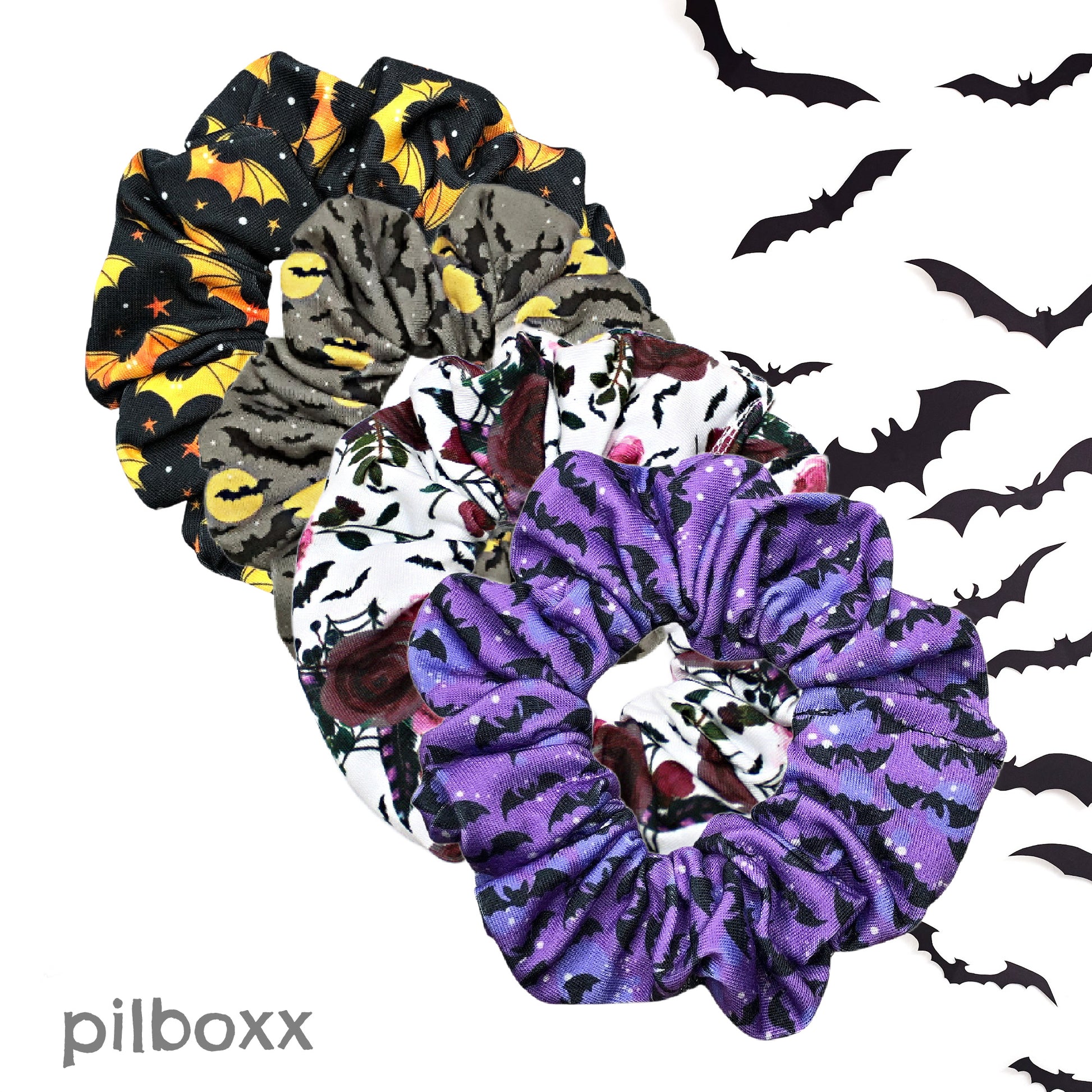 Bat Scrunchies for Women, handmade from soft and stretchy jersey knit fabric. Wear your hair up with confidence that it won't break off your beautiful strands. The inside of my hair ties is made securely with flat, quality knit elastic sewn together inside, giving it a long life! These are all completely machine washable and can go in the drier, so throw it in with your regular clothing. They won't stretch, fade or lose its shape. And when you're not wearing it in your hair, it looks great on your wrist.