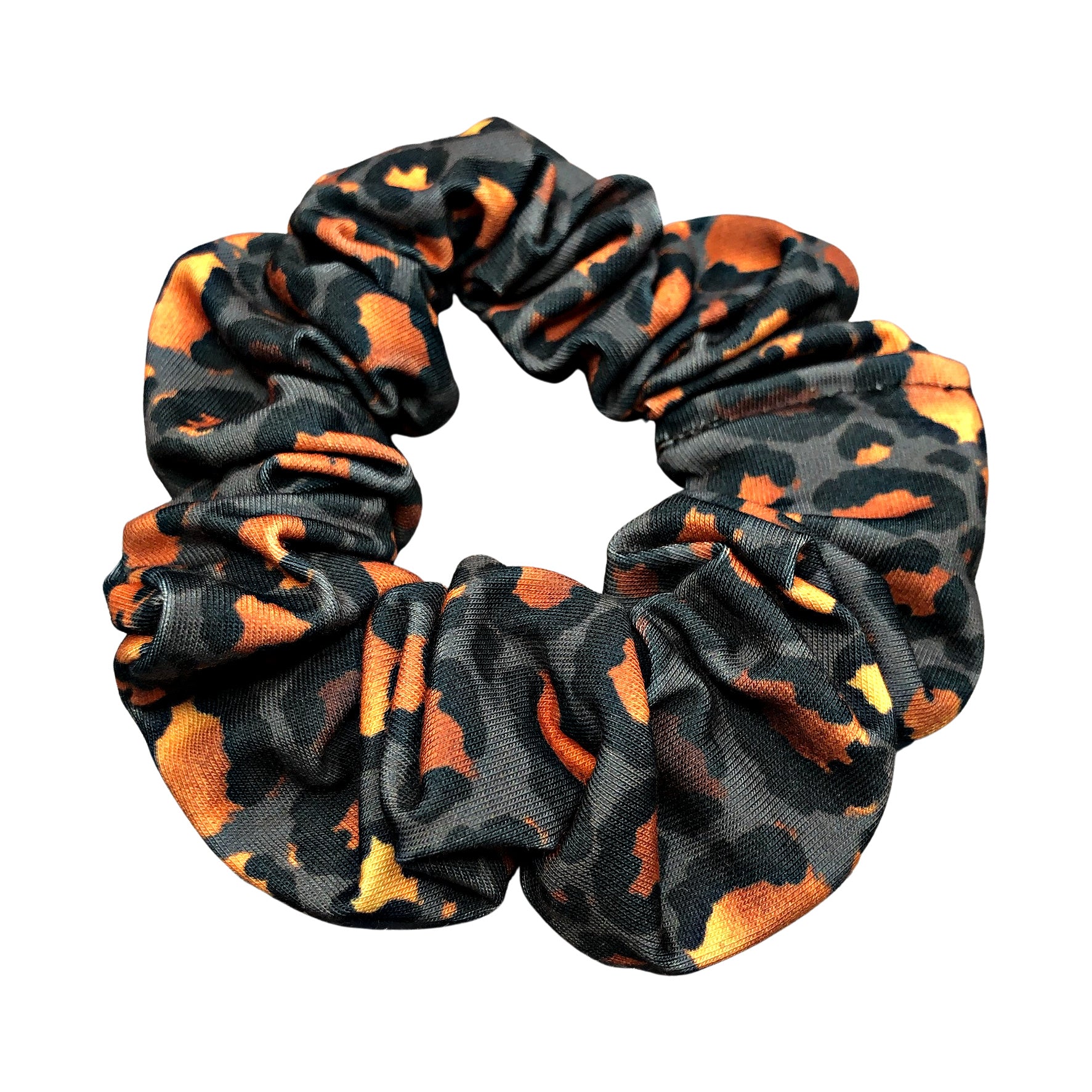 Charcoal gray and orange leopard print scrunchie, handmade from soft and stretchy knit fabric. Wear your hair up with confidence that it won't break off your beautiful strands. The inside of my hair ties is made securely with flat, quality knit elastic sewn together inside, giving it a long life! These are all completely machine washable and can go in the drier, so throw it in with your regular clothing. They won't stretch, fade or lose their shape. And when you're not wearing it in your hair, it looks great on your wrist.