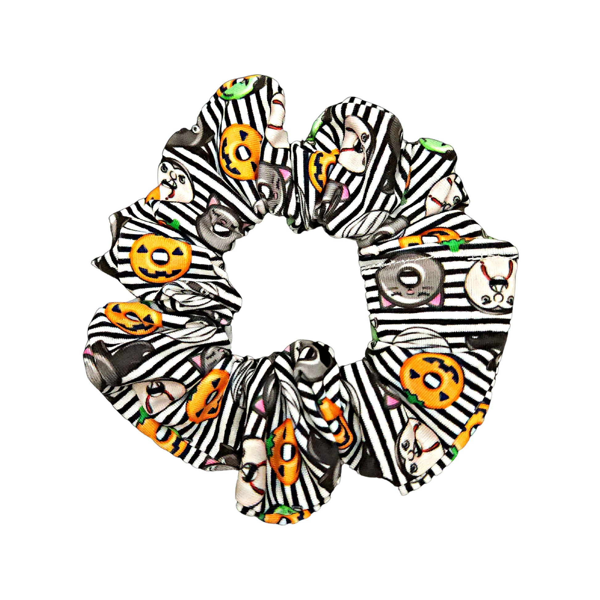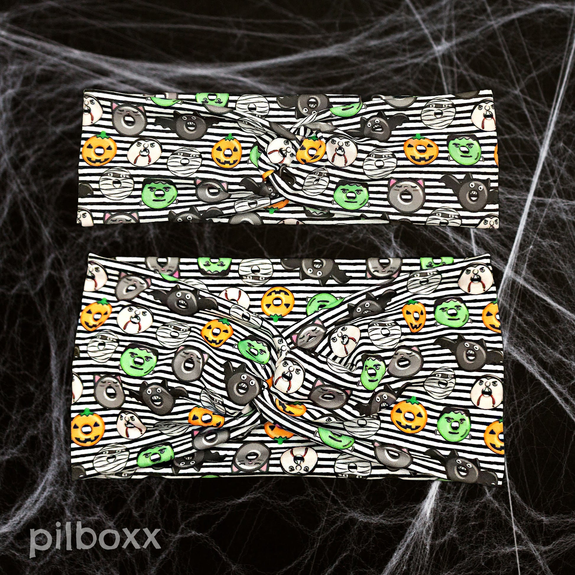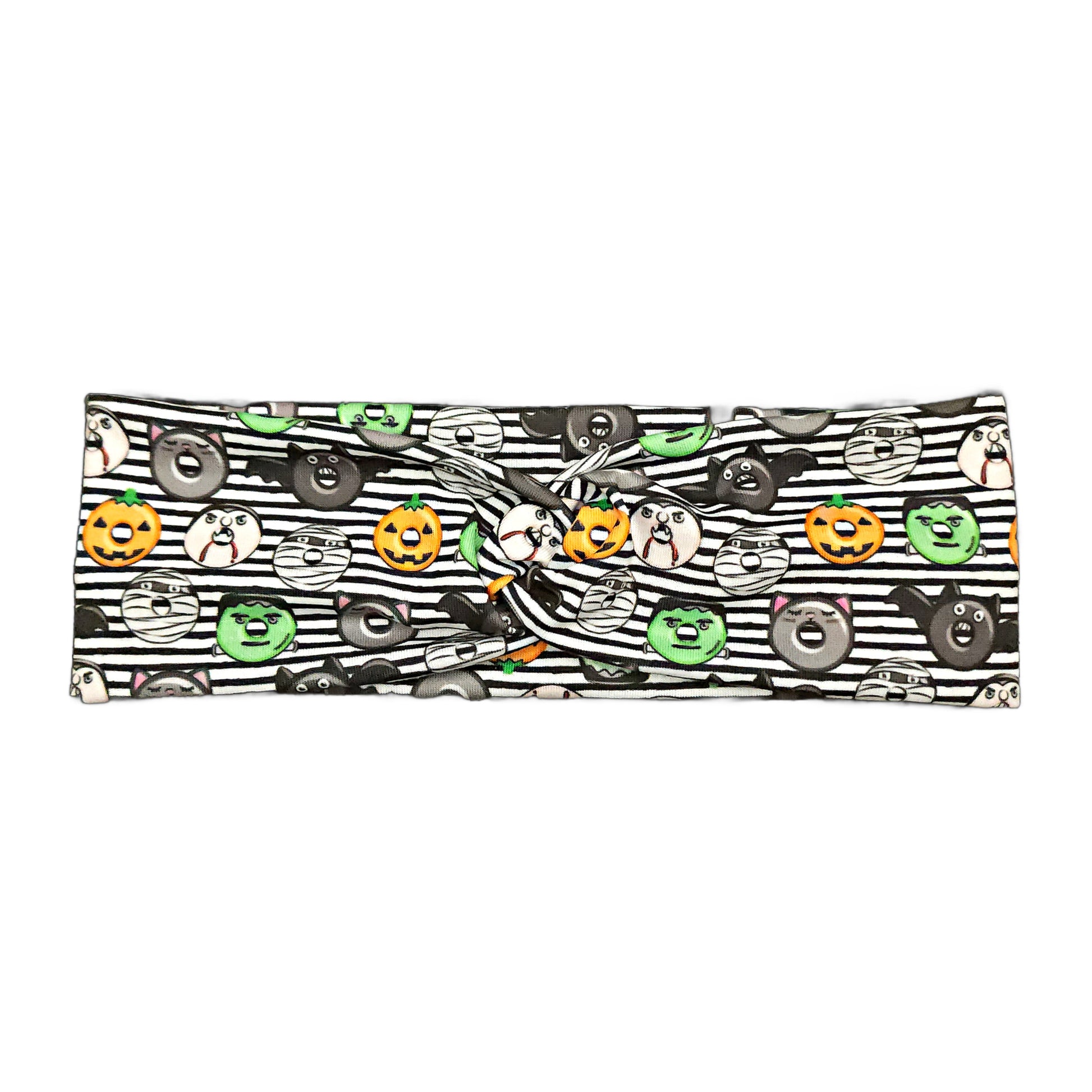 Halloween monster donuts headband. Black and white striped background with adorable festive donuts - pumpkins, bats, monsters, and vampires. Handmade from lightweight and comfortable jersey knit fabric for everyday wear.