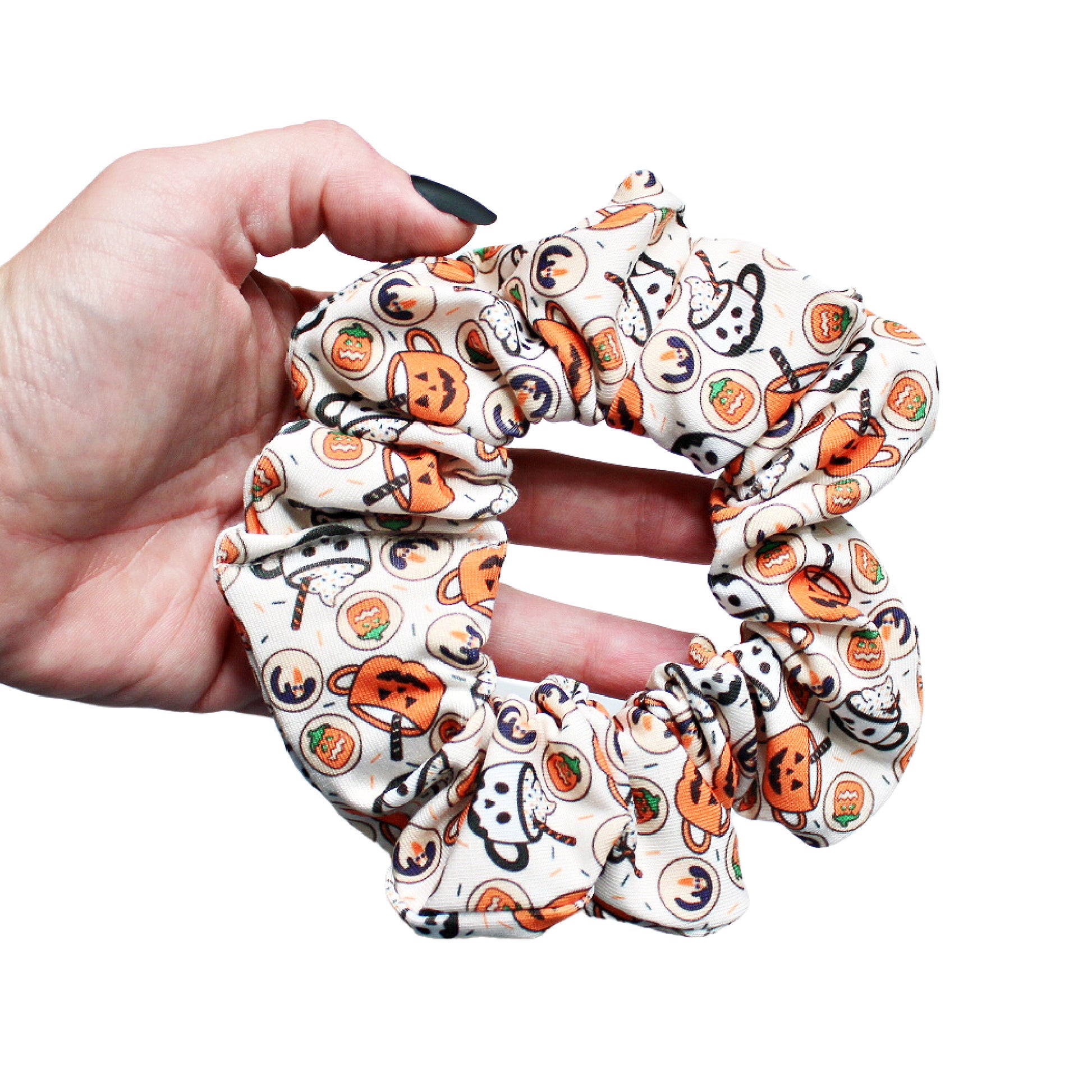 Halloween treats scrunchie with cookies, milk, hot cocoa and sprinkles, handmade from soft and stretchy jersey knit fabric. Wear your hair up with confidence that it won't break off your beautiful strands. The inside of my hair ties is made securely with flat, quality knit elastic sewn together inside, giving it a long life! These are all completely machine washable and can go in the drier, so throw it in with your regular clothing. They won't stretch, fade or lose their shape. And when you're not wearing it in your hair, it looks great on your wrist.