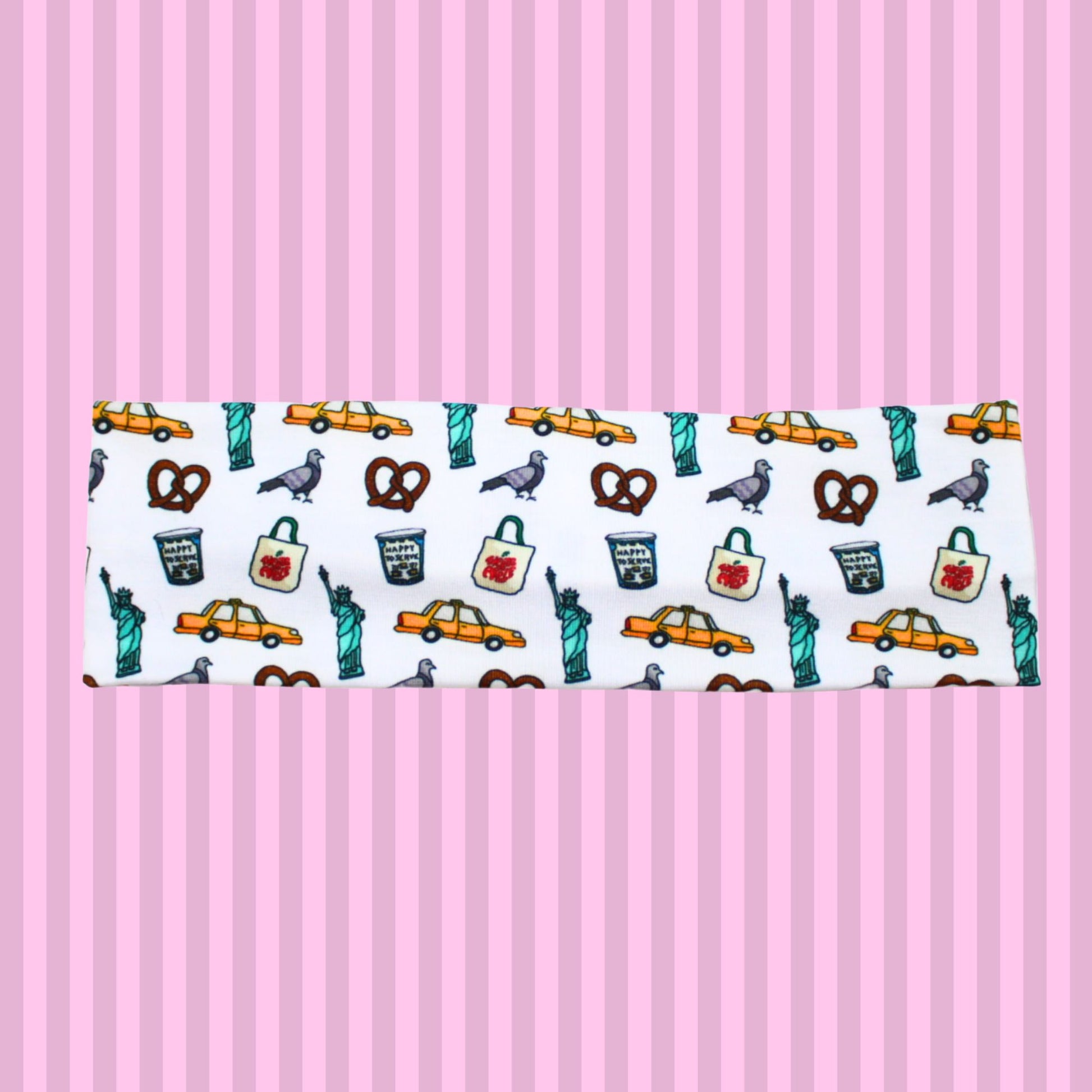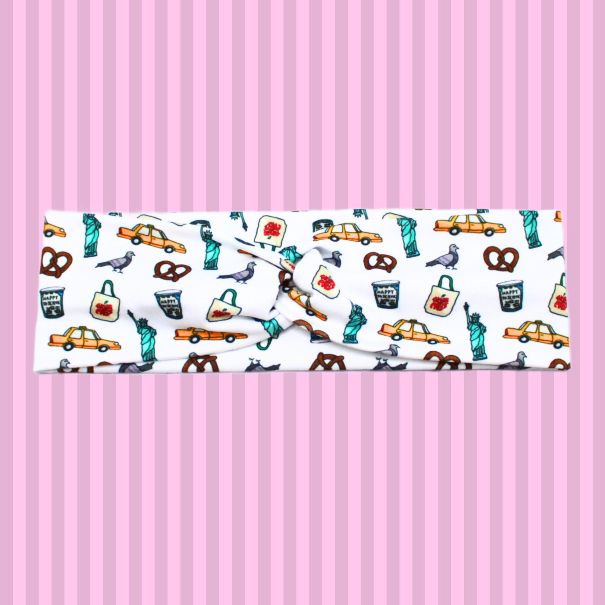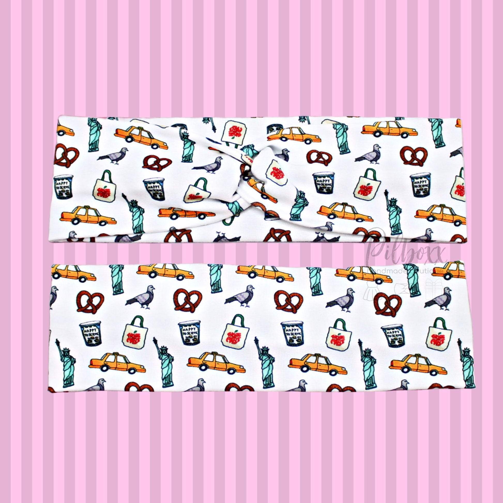 "I love New York" headband with a cute front twist*. There's pretzels, taxi cabs, Lady Liberty and more NYC icons. Handmade from soft fabric with the perfect amount of stretch.