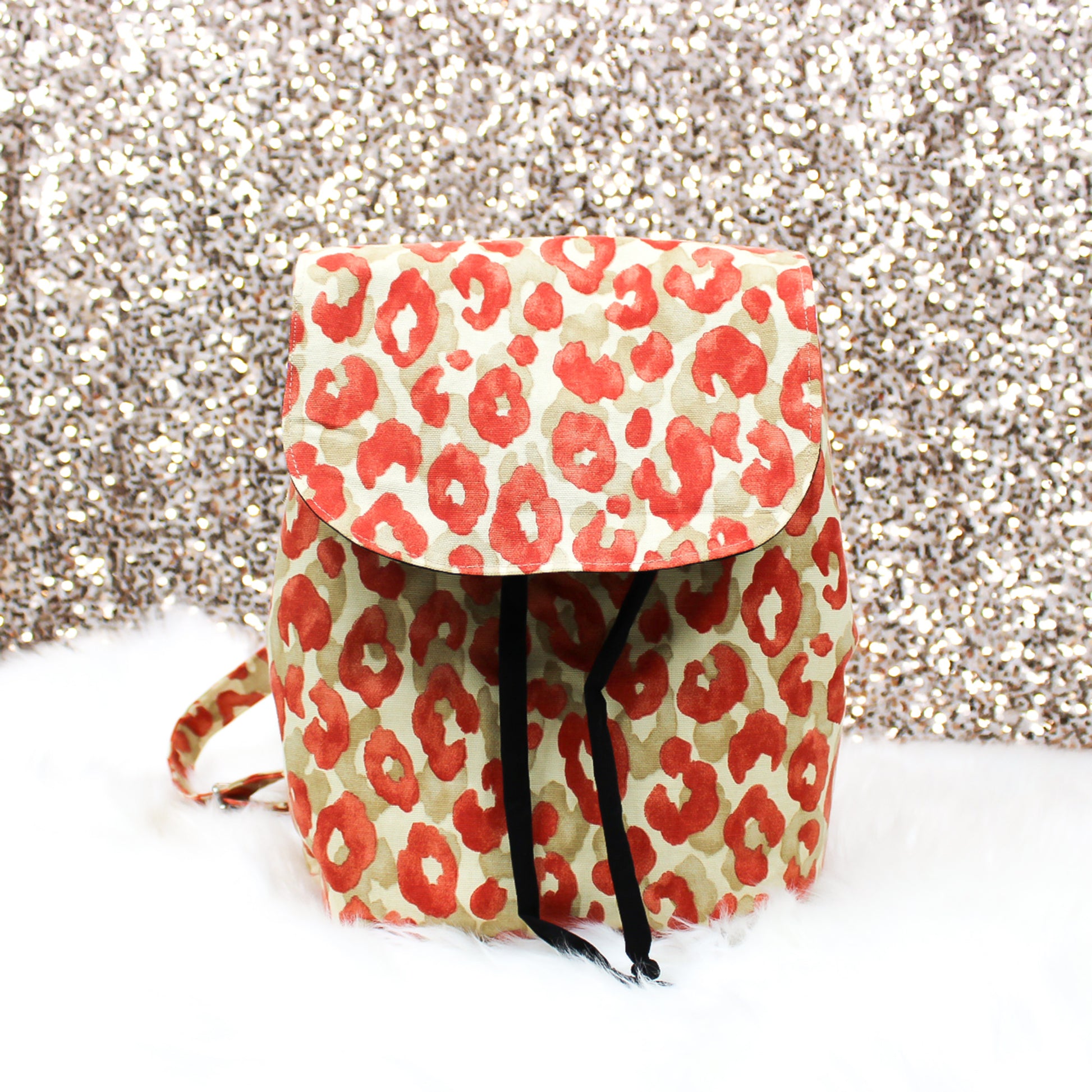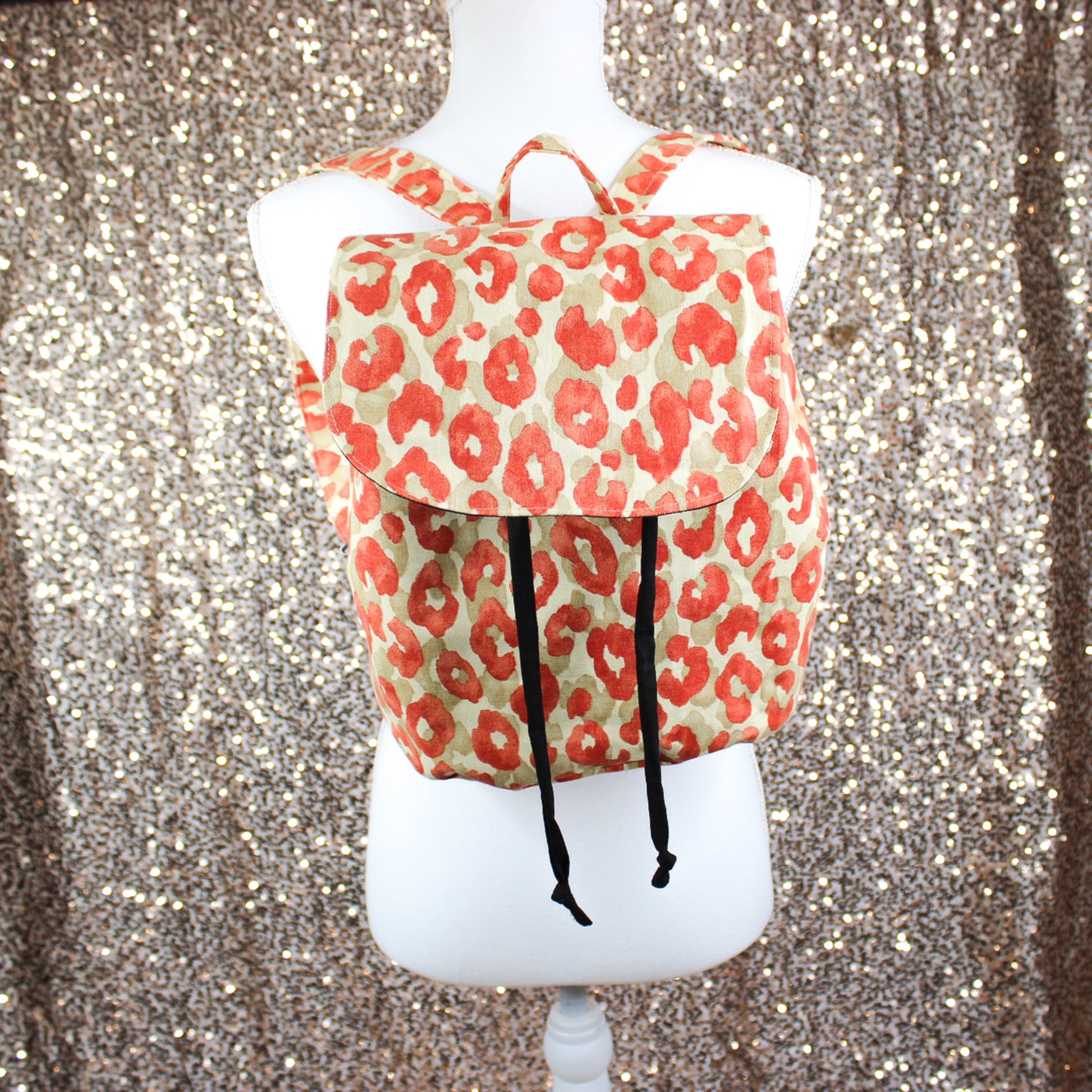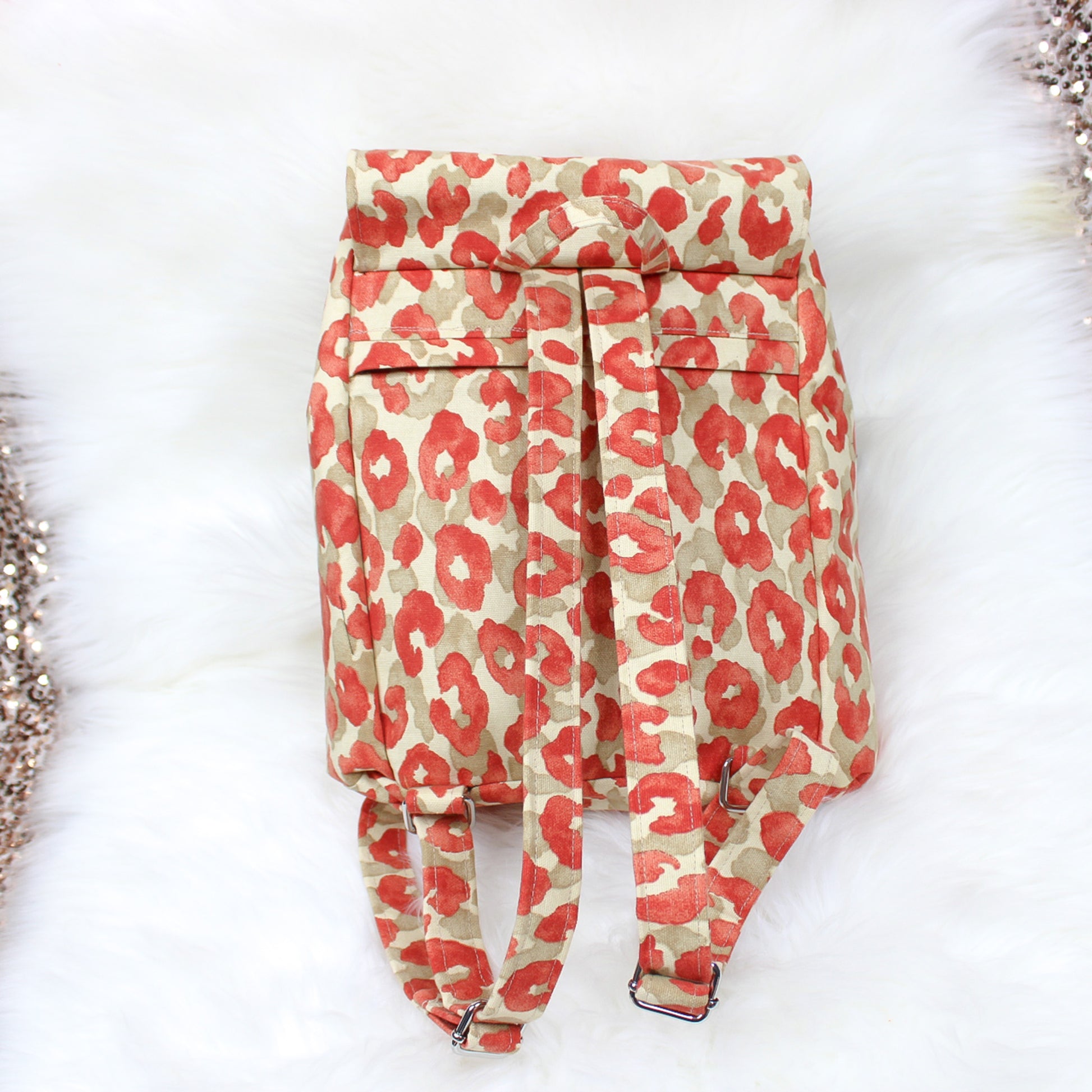 Beige and red, earthy leopard print canvas backpack. Not only can you cinch it closed with a drawstring and magnetic clasp, but it's adjustable straps (plus one for hanging!) make it a cinch to tote around. It's even got an inner pocket with a zipper and a secret compartment at the back - making it easier than ever to keep your stuff safe and sound! Add this to your collection and you'll never need a purse again!