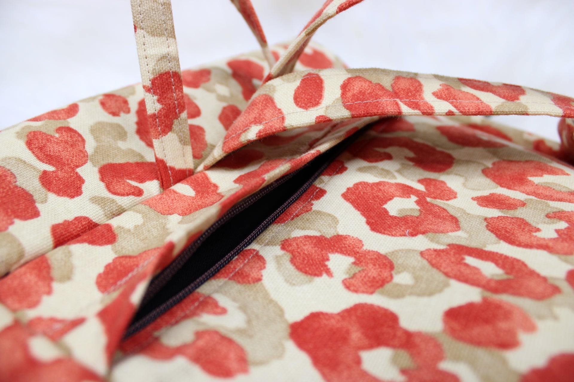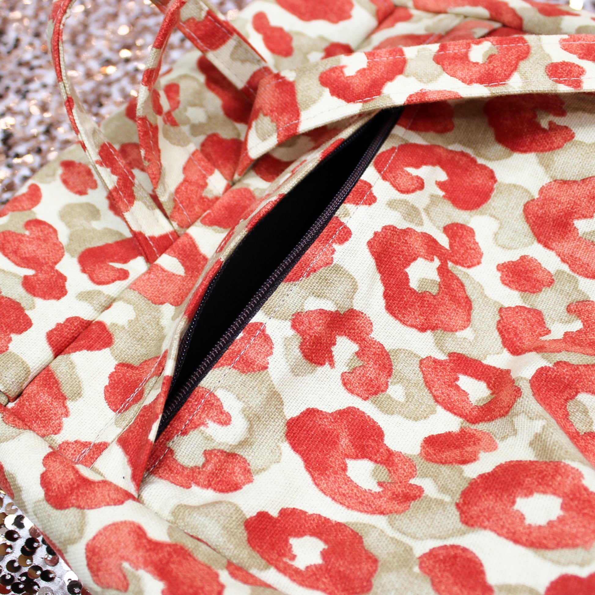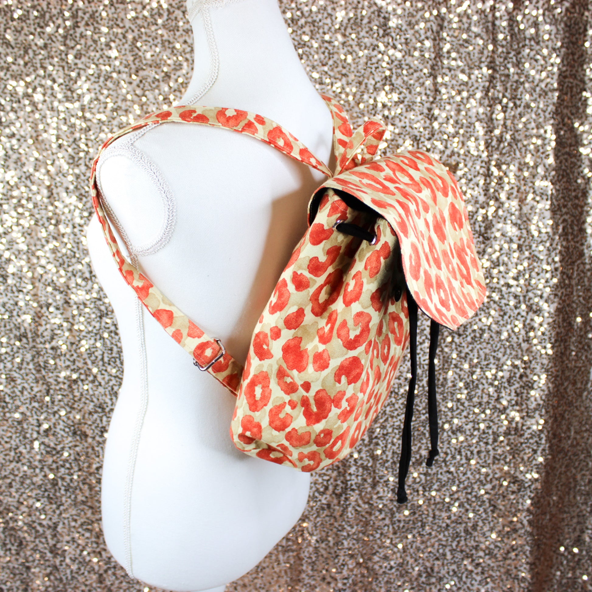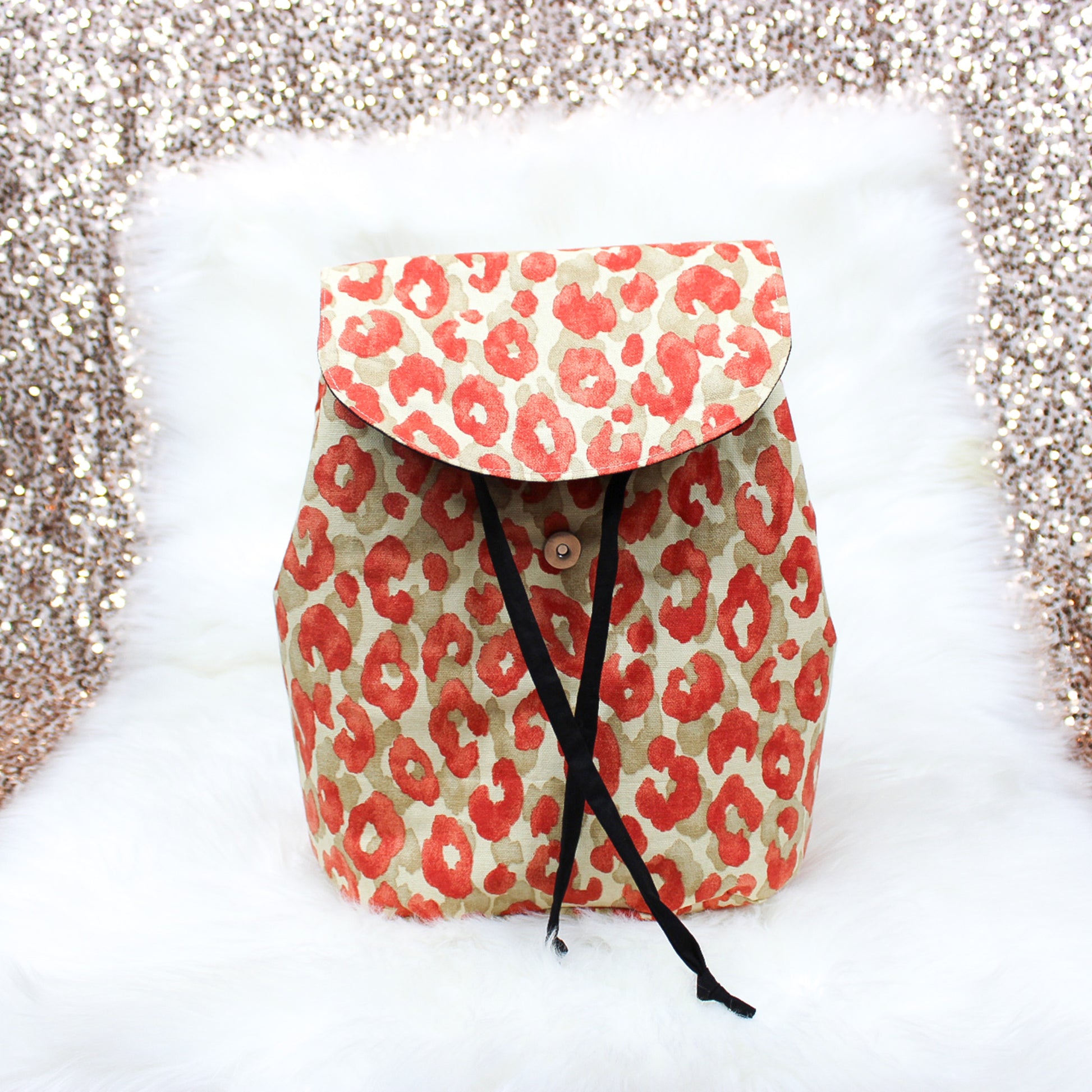 Beige and red, earthy leopard print canvas backpack. Not only can you cinch it closed with a drawstring and magnetic clasp, but it's adjustable straps (plus one for hanging!) make it a cinch to tote around. It's even got an inner pocket with a zipper and a secret compartment at the back - making it easier than ever to keep your stuff safe and sound! Add this to your collection and you'll never need a purse again!