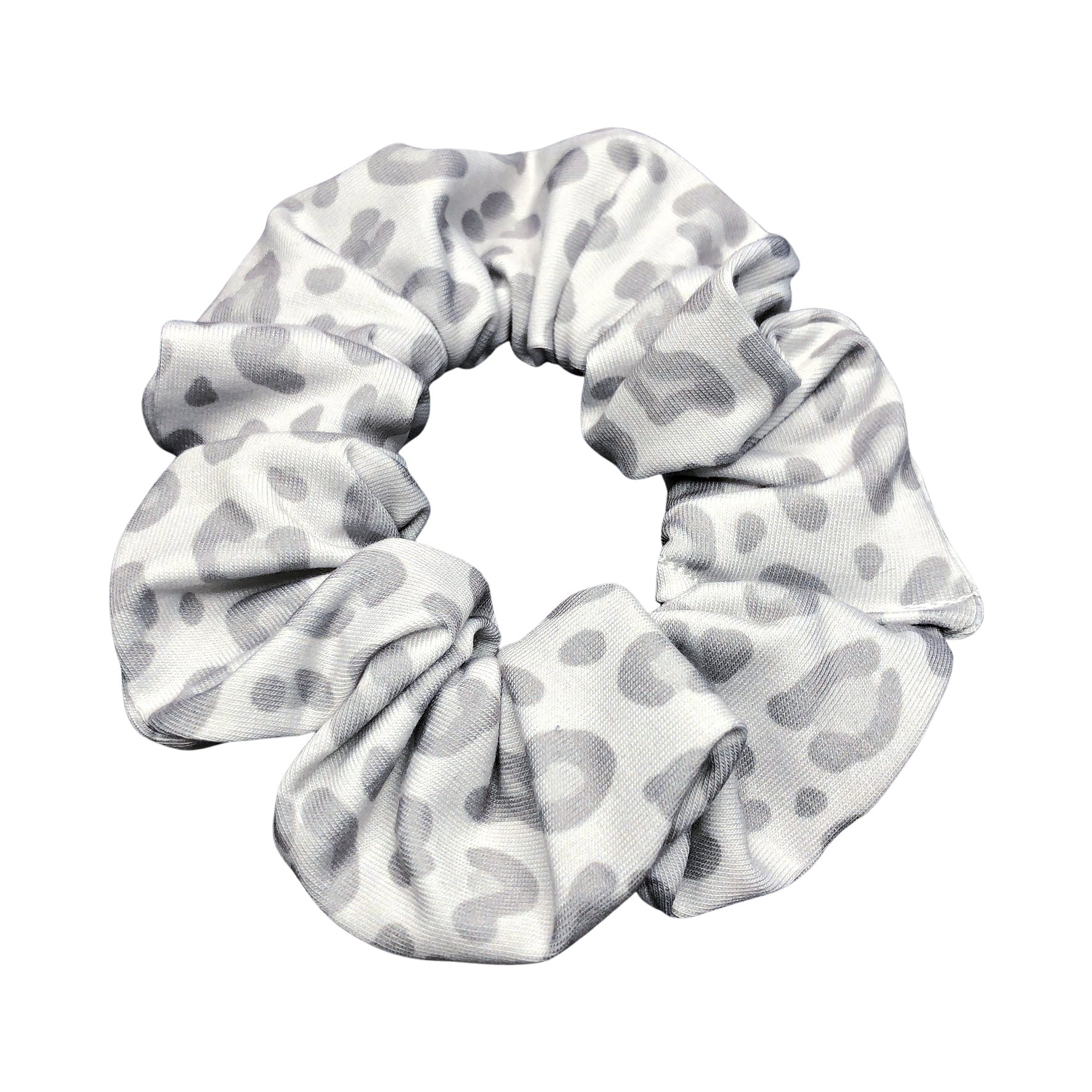 Light gray leopard print scrunchie, handmade from soft and stretchy knit fabric. Wear your hair up with confidence that it won't break off your beautiful strands. The inside of my hair ties is made securely with flat, quality knit elastic sewn together inside, giving it a long life! These are all completely machine washable and can go in the drier, so throw it in with your regular clothing. They won't stretch, fade or lose their shape. And when you're not wearing it in your hair, it looks great on your wrist.