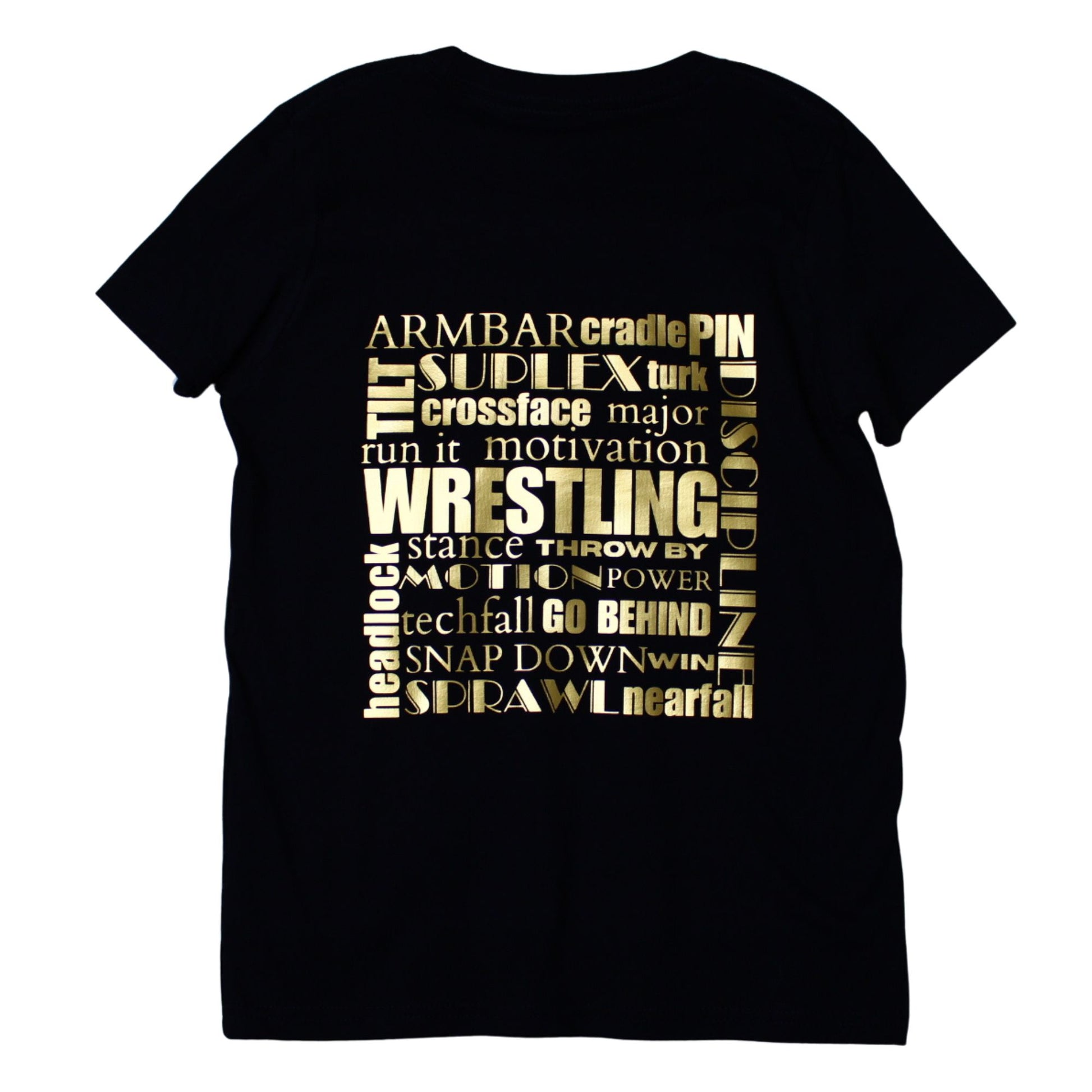 Metallic wrestling words t-shirt. Original design in pink or gold. Unisex sizing. Blank on the front. If you want to add a little something to the front shoulder, feel free to reach out!