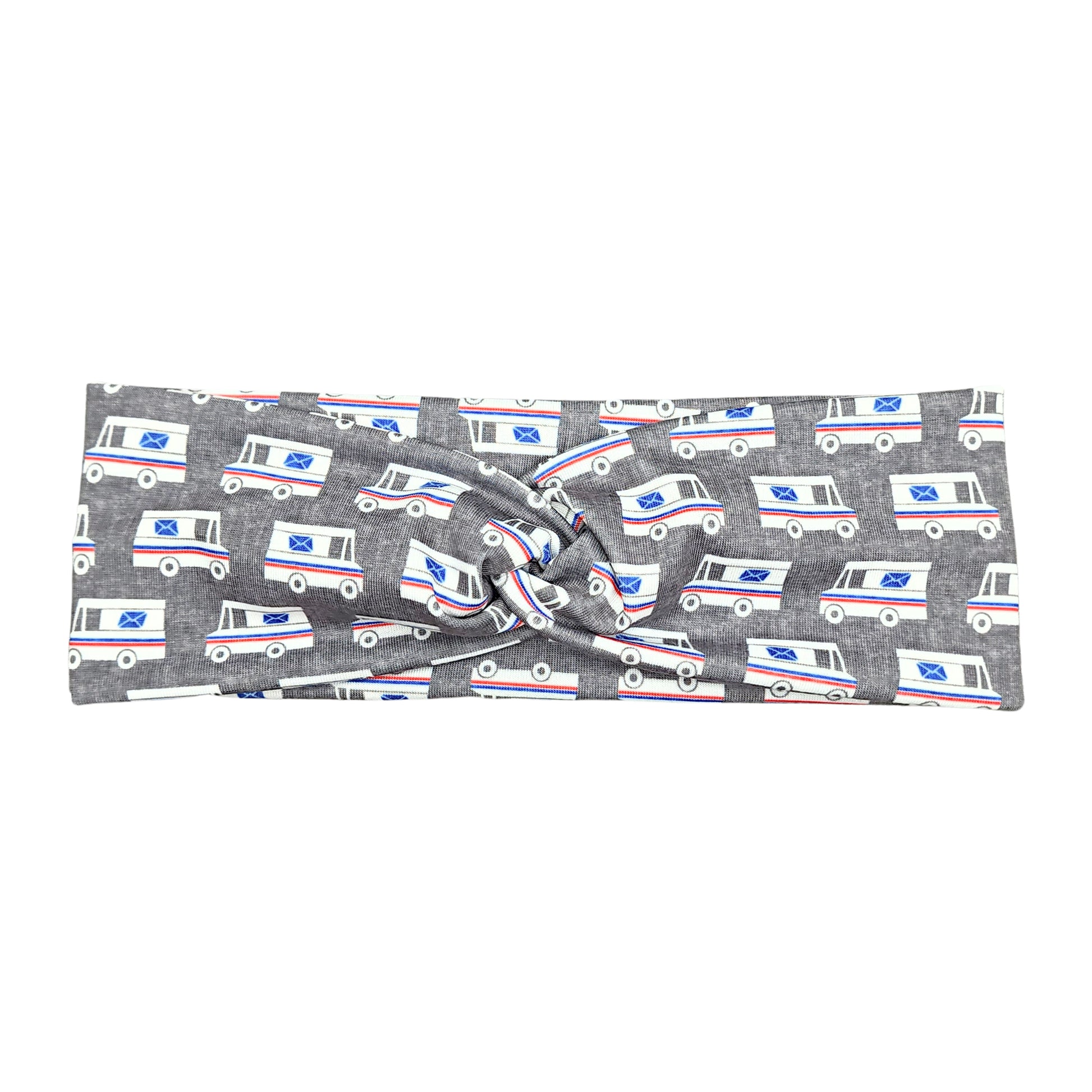 Colorful mail truck twist headbands for women, handmade from comfortable, stretchy fabric. These make great "thank you" gifts for your delivery woman!! If you deliver letters and packages for a living, you'll want to keep your hair out of your face, especially in the summer. Pull the hair band over your ears in winter, too, to keep them warm! Wide versions available separately as well.