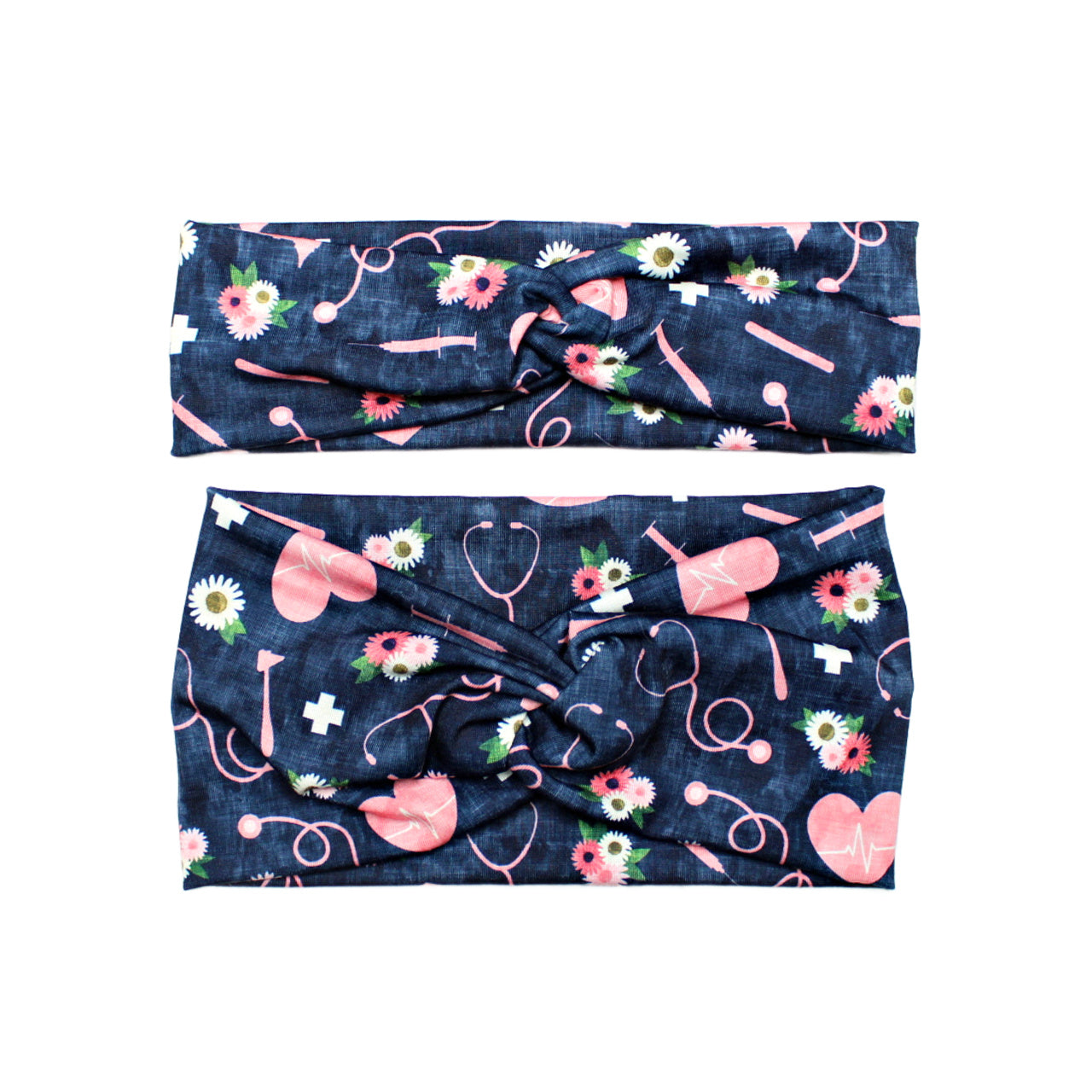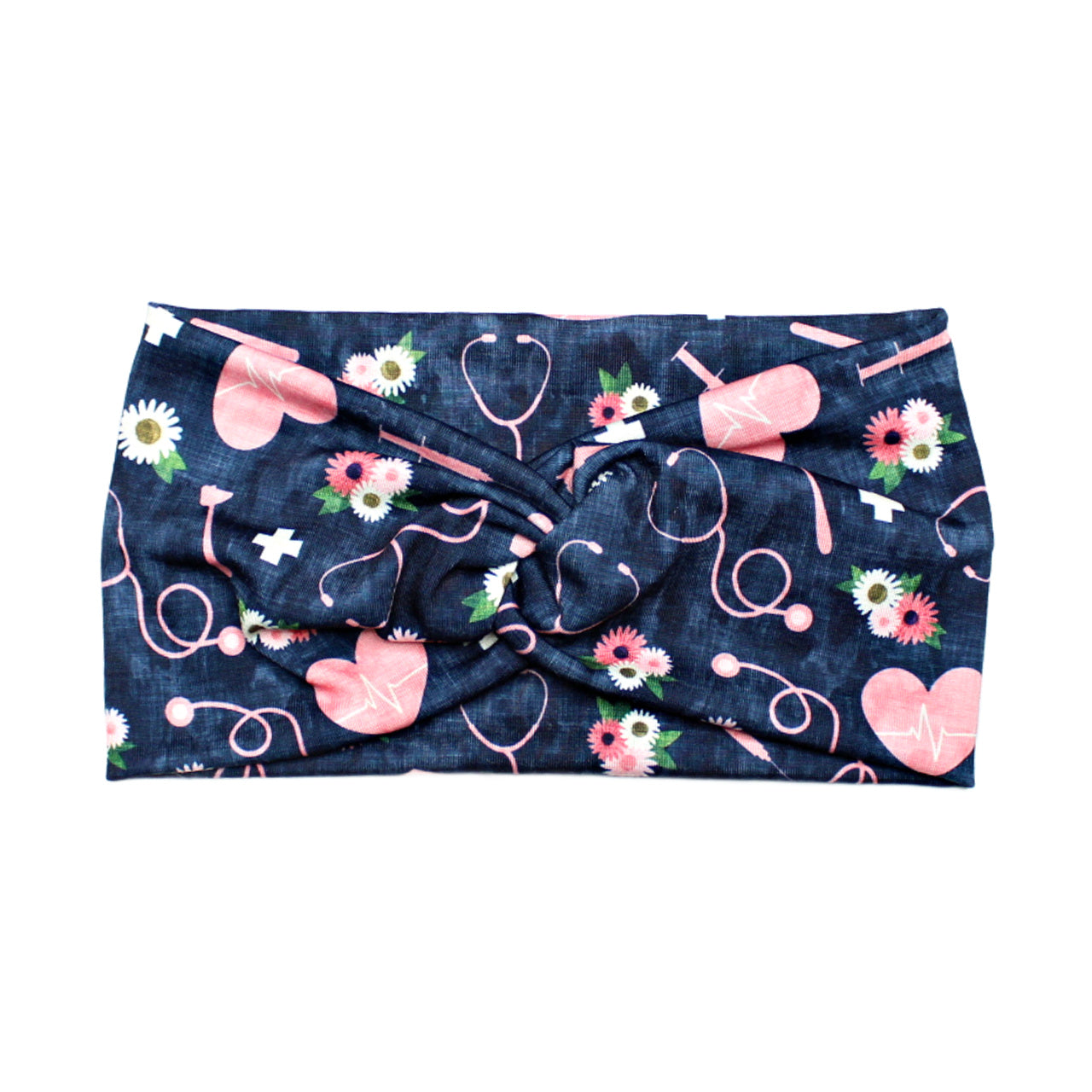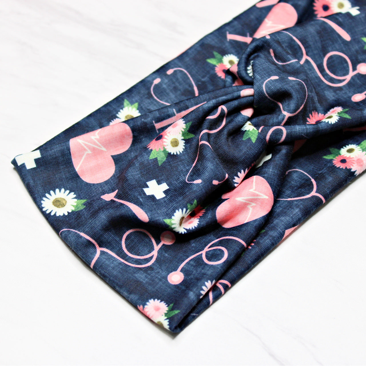 Wide Blue Floral Nurse Print Headband for Women with front twist detail. Handmade in the USA from lightweight, soft, stretchy and comfortable knit fabric for all day wear. Also available in a 3" width.