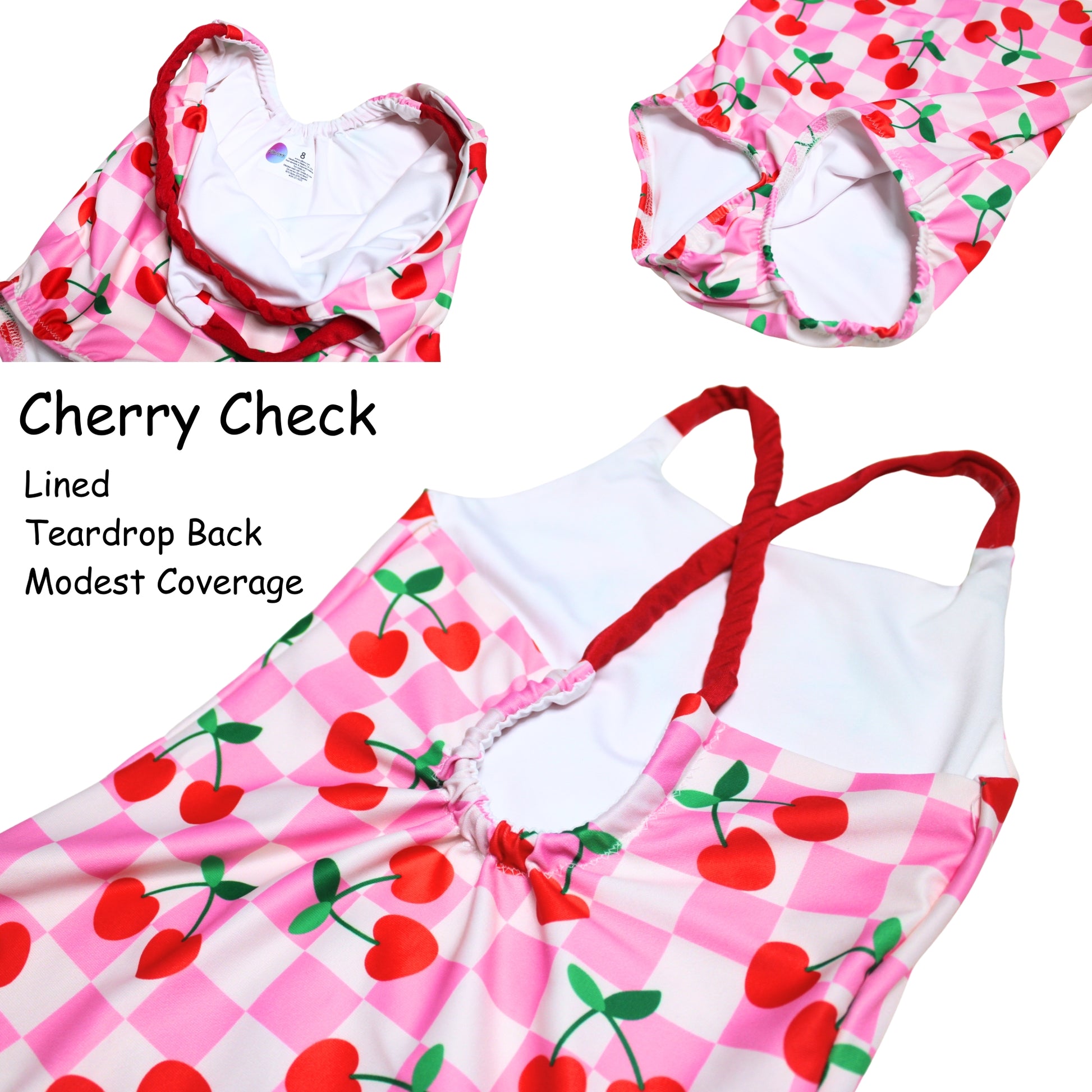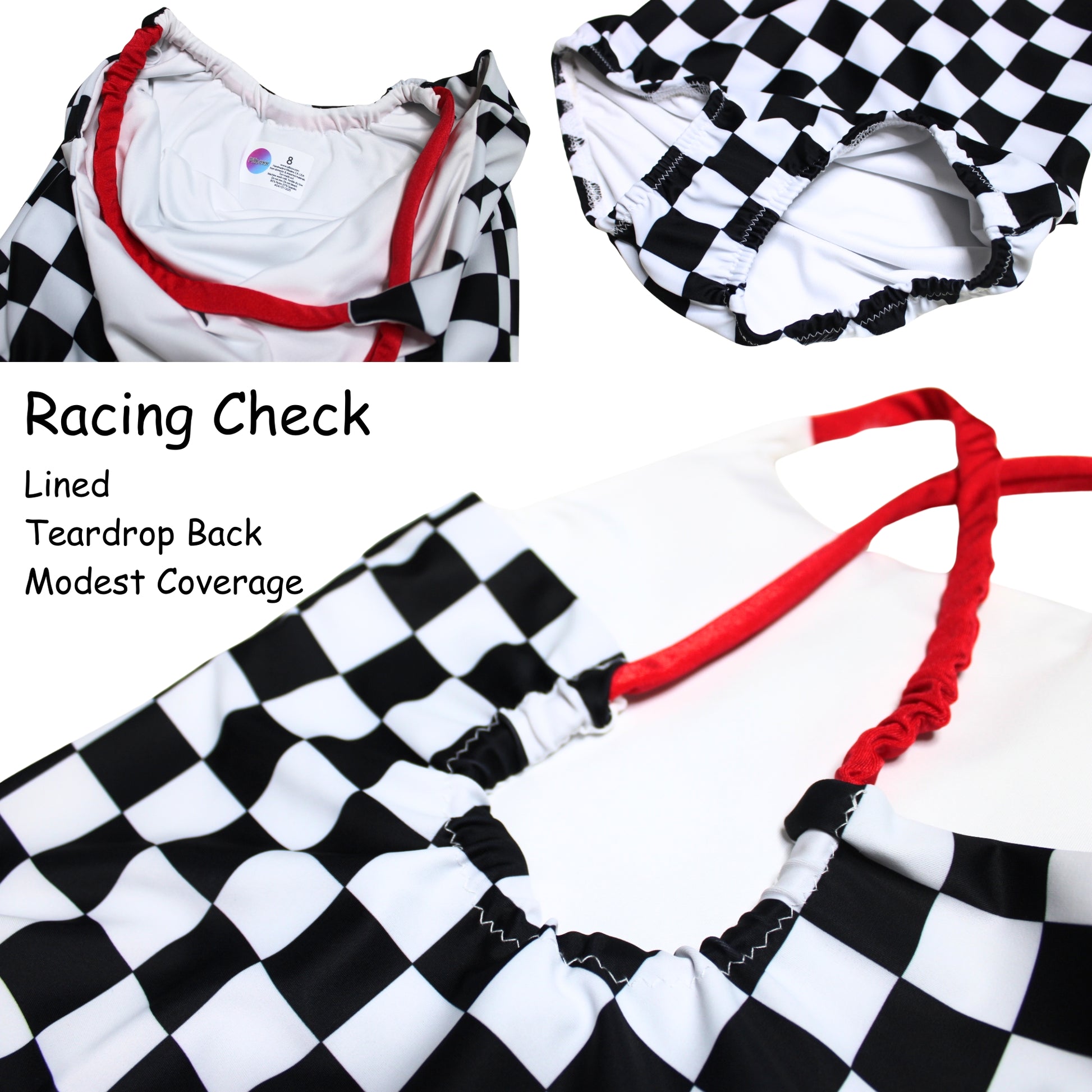 Girls' handmade one-piece modest swimsuits in black and white racing checker or pink cherry checker. The bathing suits have a teardrop back with red straps. They are fully lined - front and back. The straps are reinforced with elastic inside.