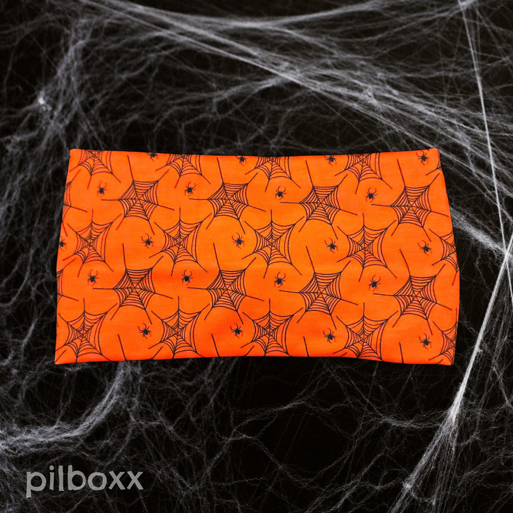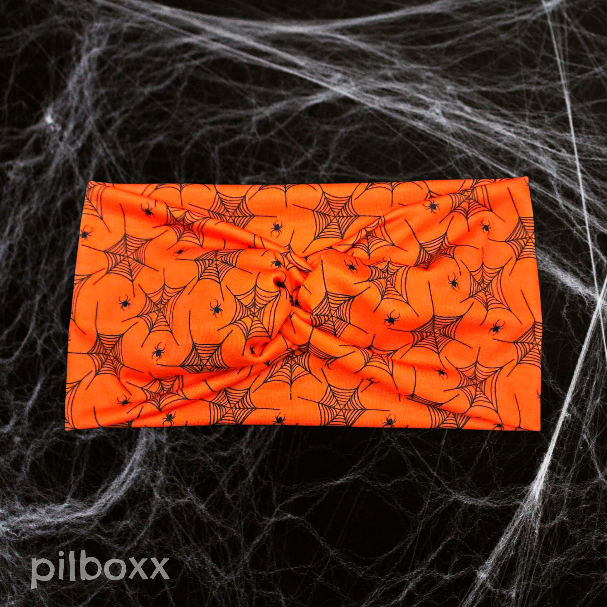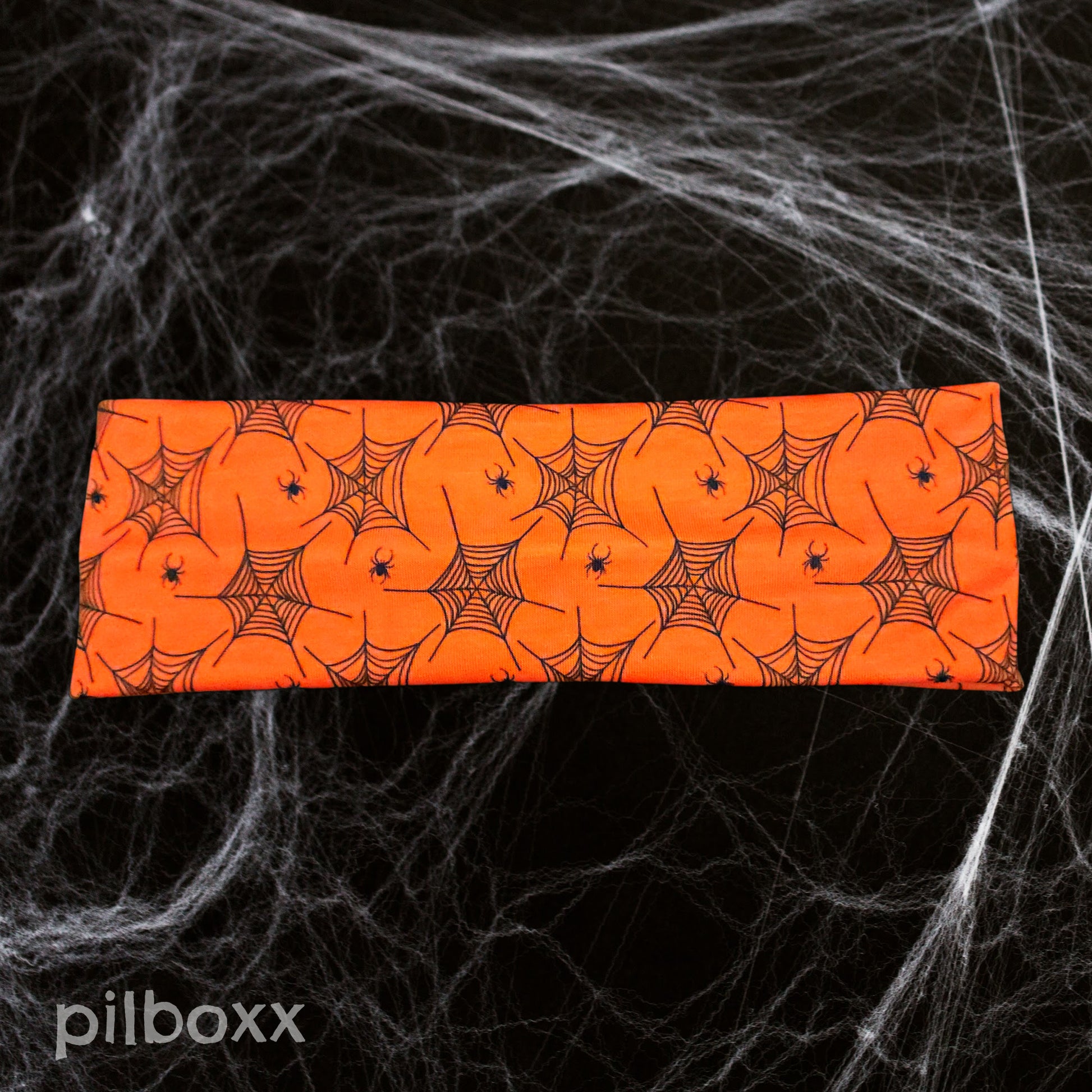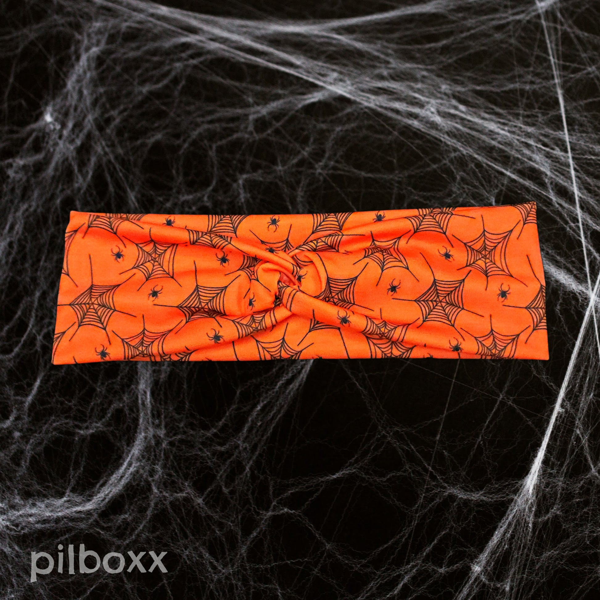 Orange Spooky Spiders and Webs Halloween Headband for Women with front twist. Perfect for lazy days and gym days! Handmade from lightweight, super soft stretch fabric. Gift your bestie the gift of compliments and confidence with these headbands. They're guaranteed to bring smiles and attention with all the different styles and unique prints.