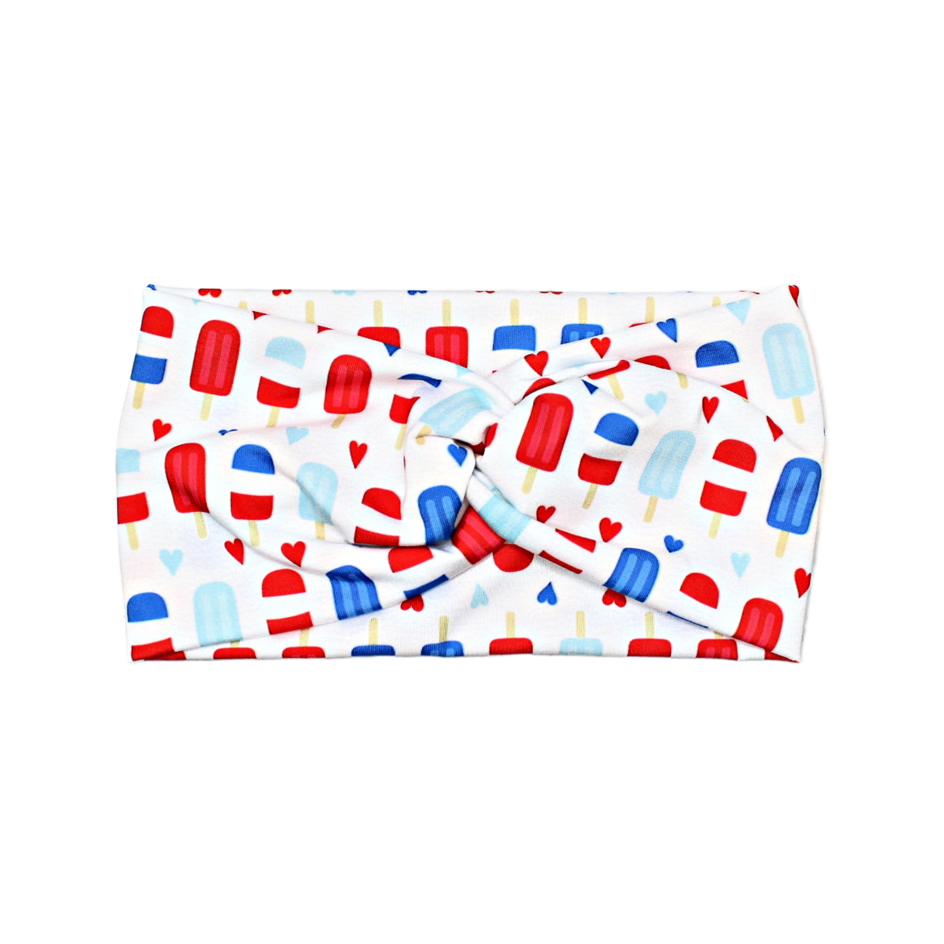 Red, white and blue popsicles and hearts fabric headband for women and girls with front twist. Perfect for the 4th of July! Handmade from lightweight, super soft stretch fabric. Gift your bestie the gift of compliments and confidence with these headbands. They're guaranteed to bring smiles and attention with all the different styles and unique prints.