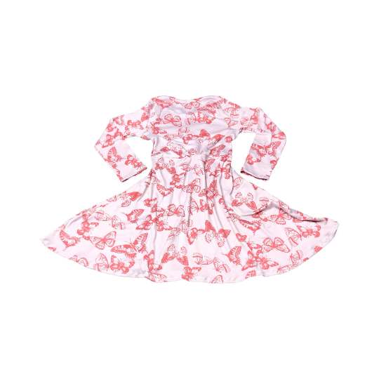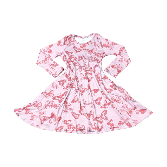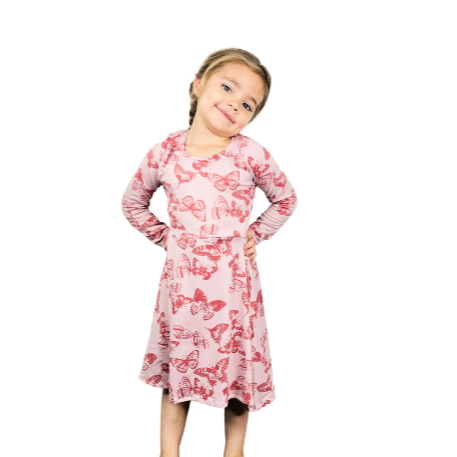 This pretty skater dress for girls features a beautiful pink butterfly print. Handmade from super soft and comfortable stretch fabric, your little one will be feeling so pretty in this dress. Long sleeves are perfect for fall and winter. Pair this beauty with some comfy leggings and cute boots and you're good to go! Pullover style and tagless.