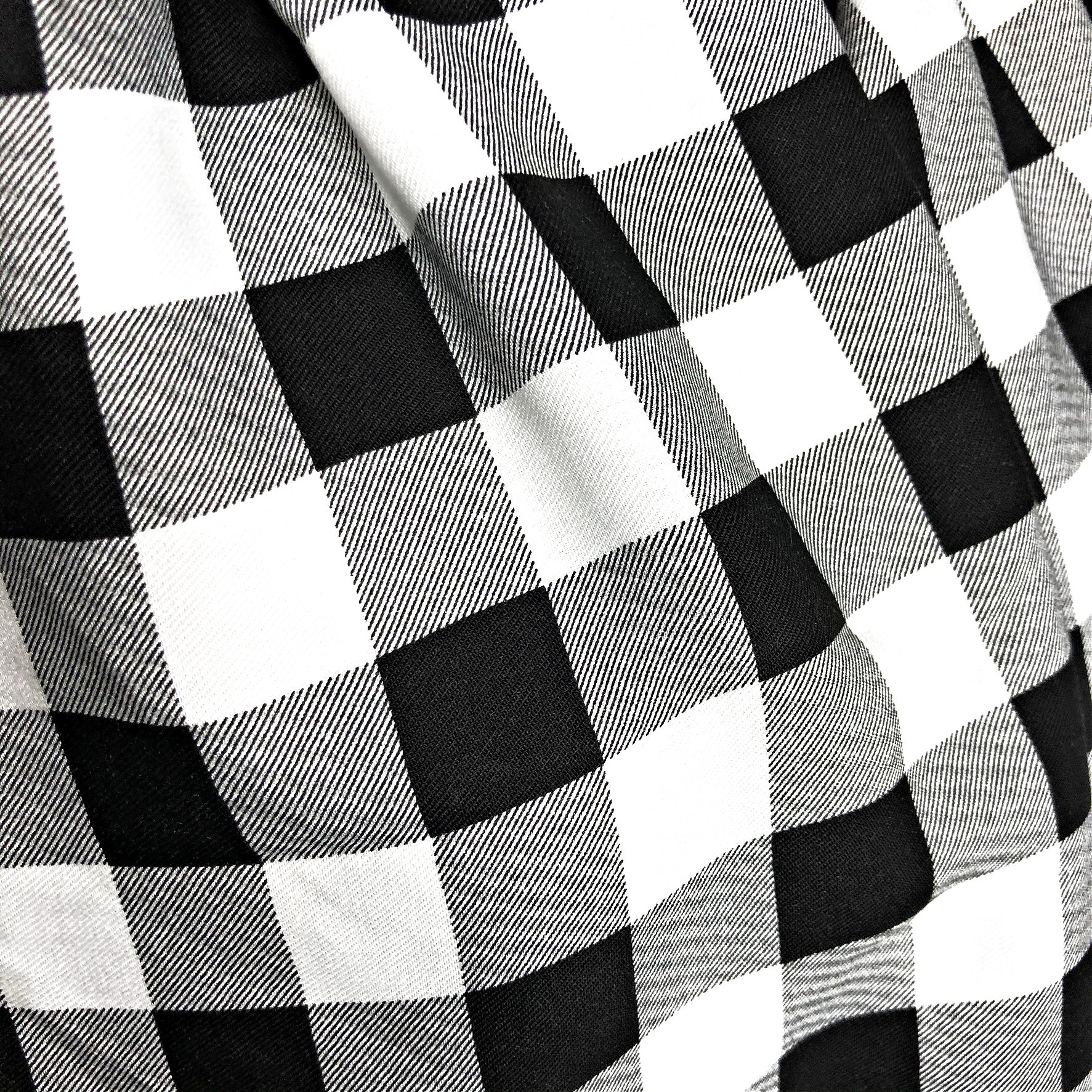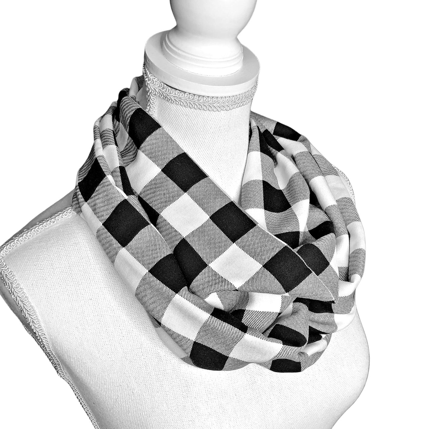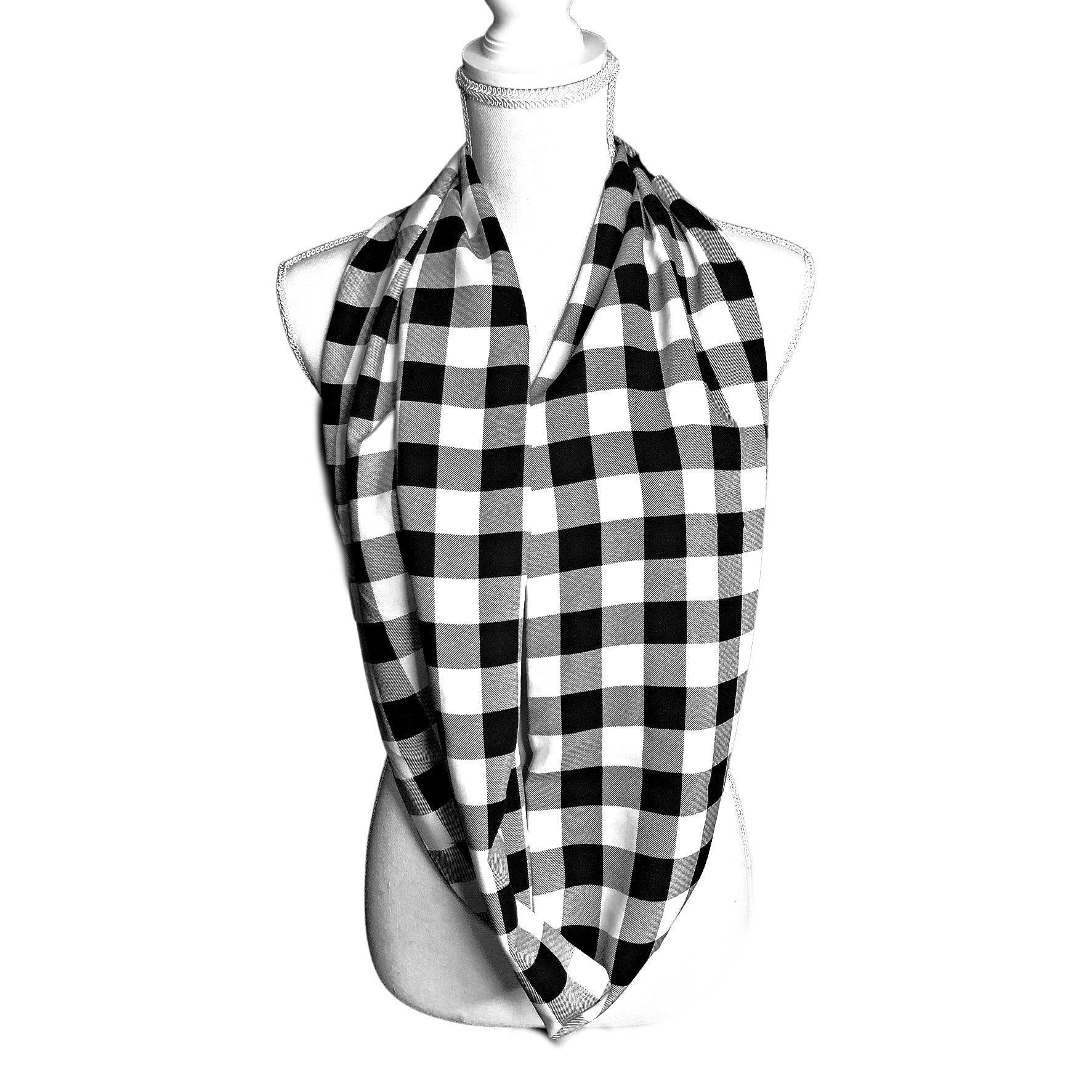 Lightweight and flowy, this infinity scarf is patterned with 1" blocks of black and white silky plaid. Wear it long or wrap it around twice. Perfect staple scarf in classic colors that go with absolutely everything.