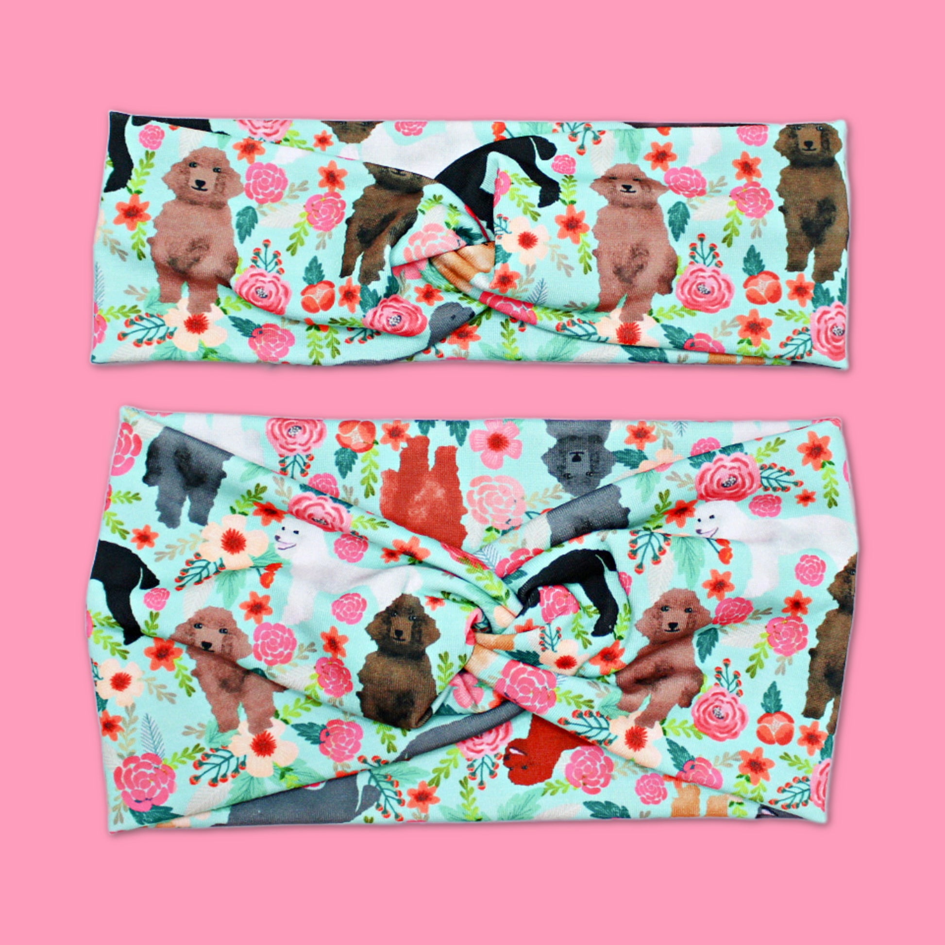 Poodle dogs print Headband with front twist. Perfect for lazy days and gym days! Handmade from lightweight, super soft stretch fabric. Gift your bestie the gift of compliments and confidence with these headbands. They're guaranteed to bring smiles and attention with all the different styles and unique prints.