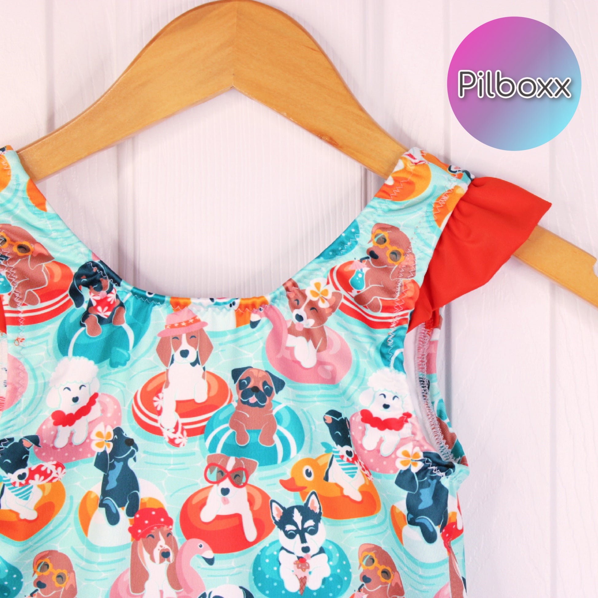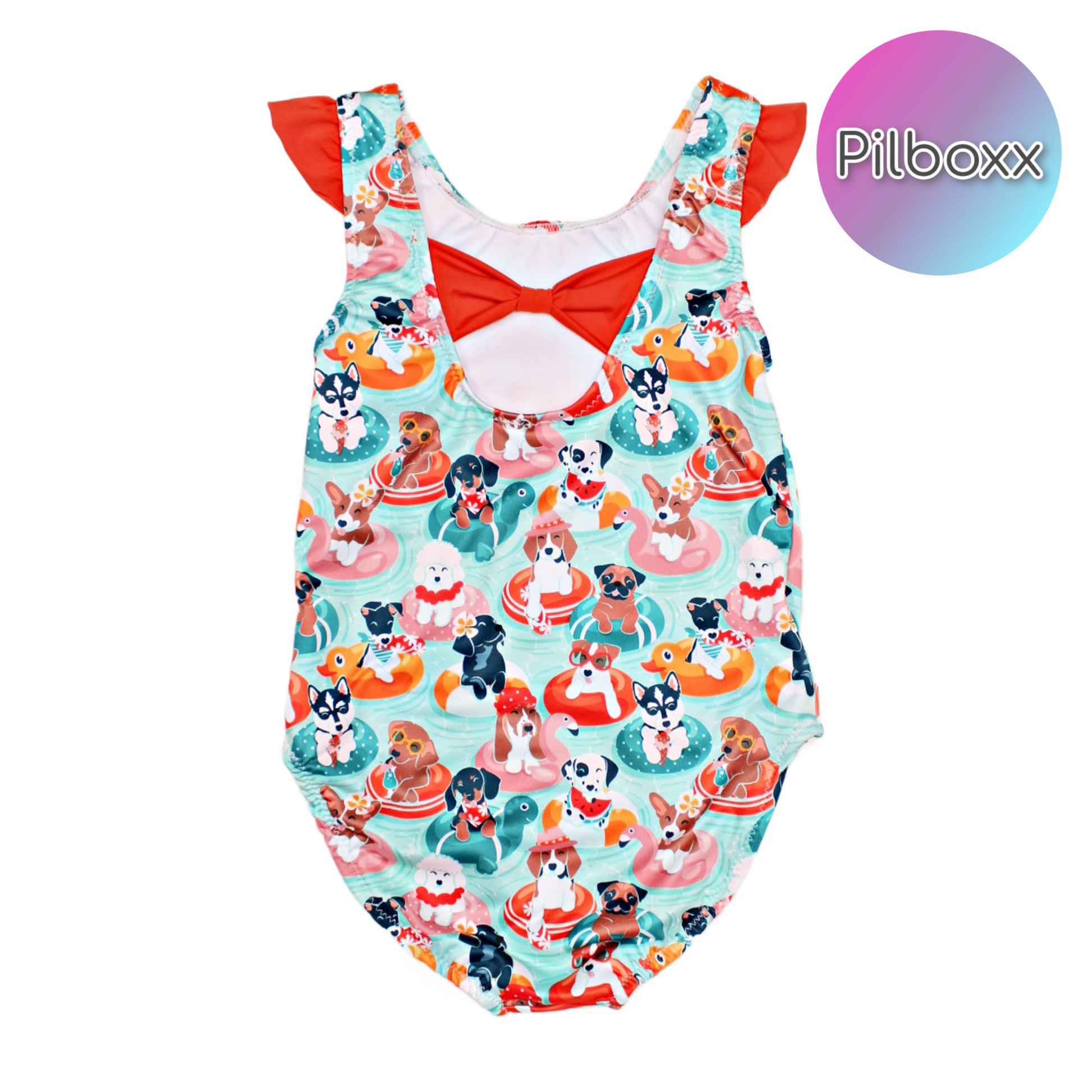 Handmade Bathing Suit for Girls Size 7 – One Piece Swim Suit with Swimming Dogs, Flutter Sleeve Ruffles & Bow Back
