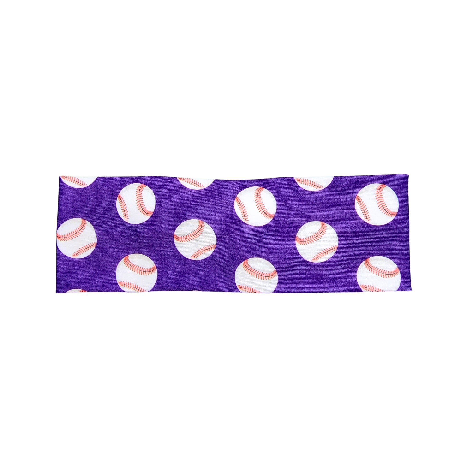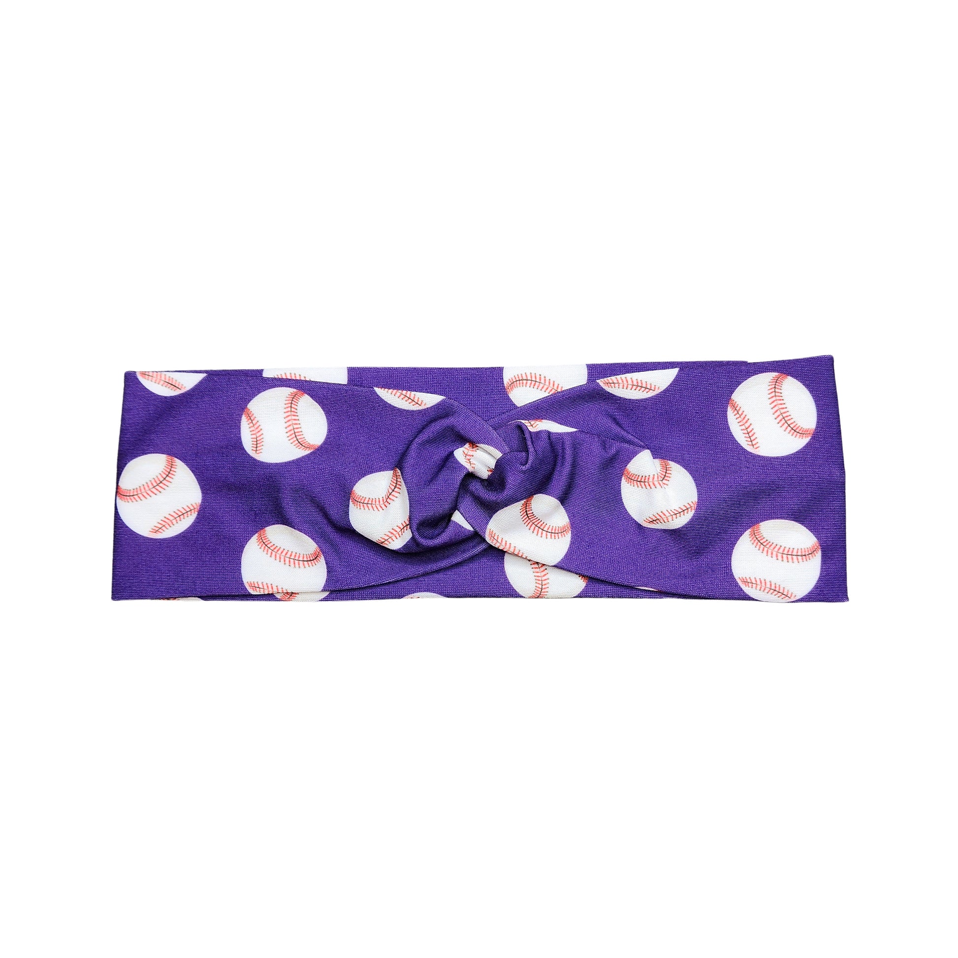 Royal purple baseball print headband with front twist detail. Handmade in the USA from lightweight, soft, stretchy and comfortable knit fabric for all day wear.