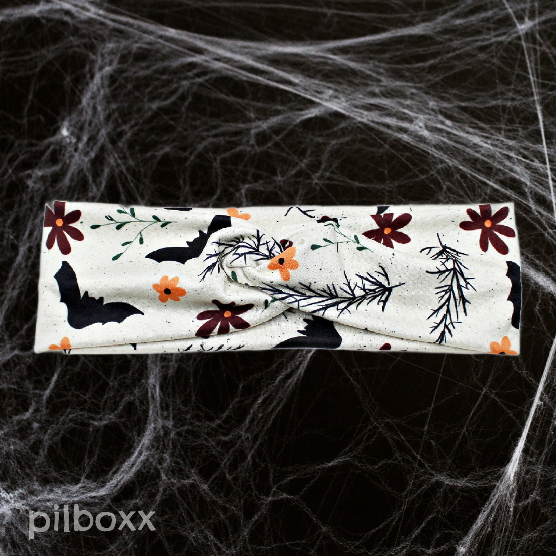 Sandy fall florals and bats headband with a front twist, handmade from soft and stretchy fabric.