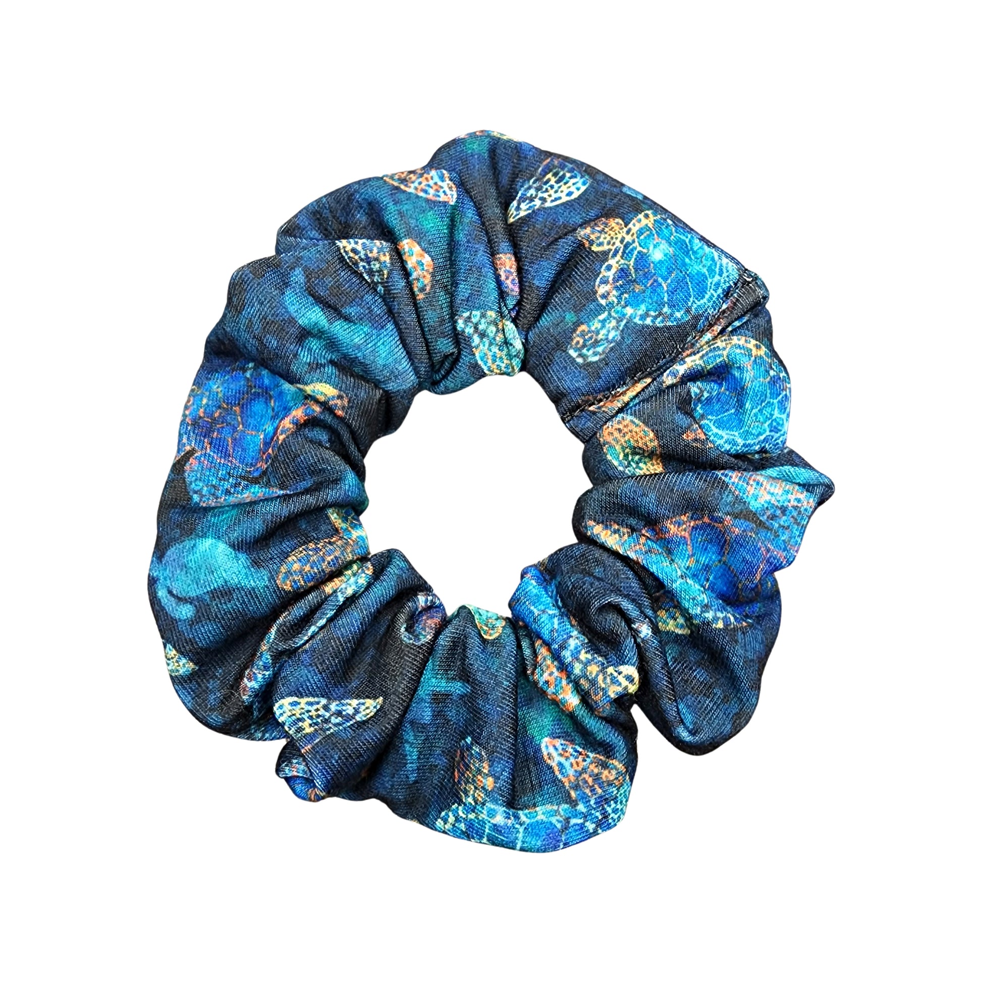 Sea turtle hair scrunchie, handmade from soft and stretchy jersey knit fabric. Wear your hair up with confidence that it won't break off your beautiful strands. The inside of my hair ties is made securely with flat, quality knit elastic sewn together inside, giving it a long life! These are all completely machine washable and can go in the drier, so throw it in with your regular clothing. They won't stretch, fade or lose their shape. And when you're not wearing it in your hair, it looks great on your wrist.