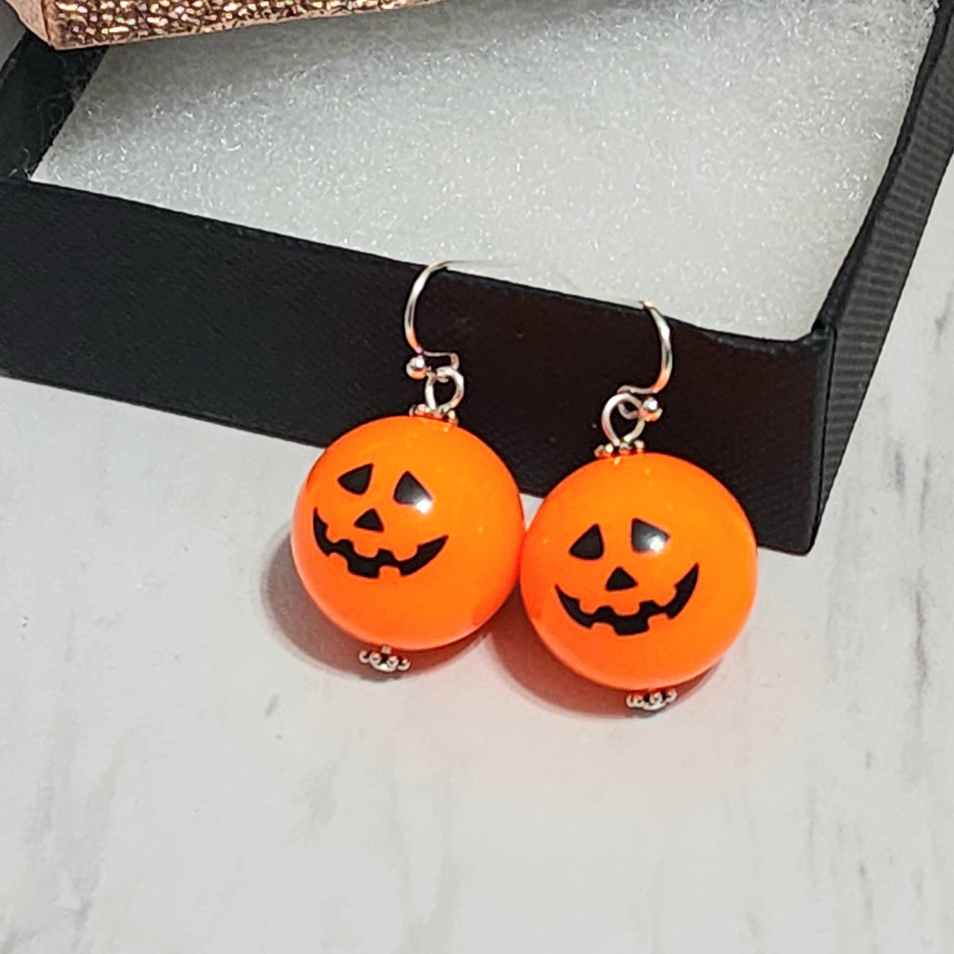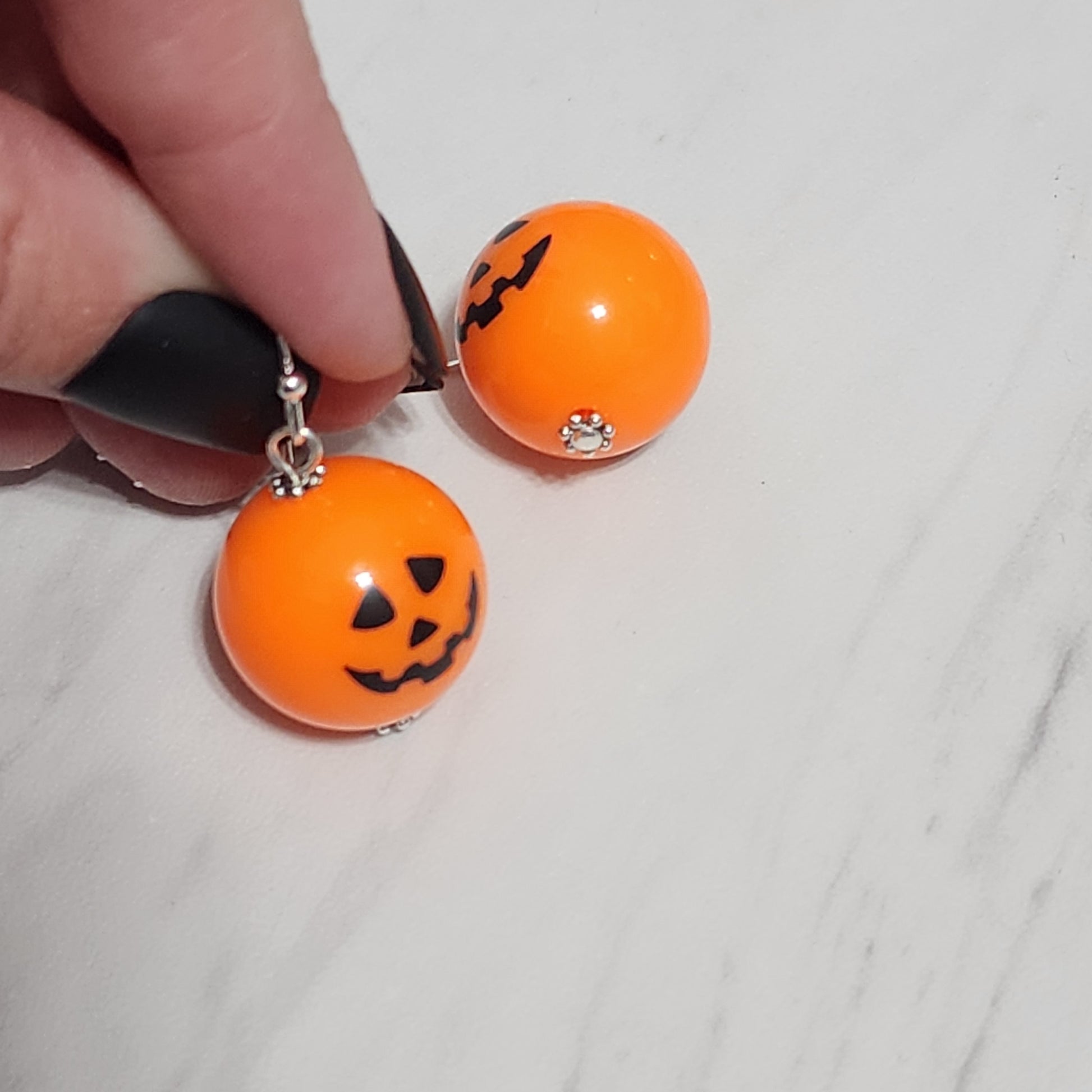 These spooky cute bauble earrings were made with bright orange, chunky, round Halloween jack-o-lantern gumball beads dangling from silver plated ear wires. Simple and sweet. Rubber earring backs are included so you don't lose them!!