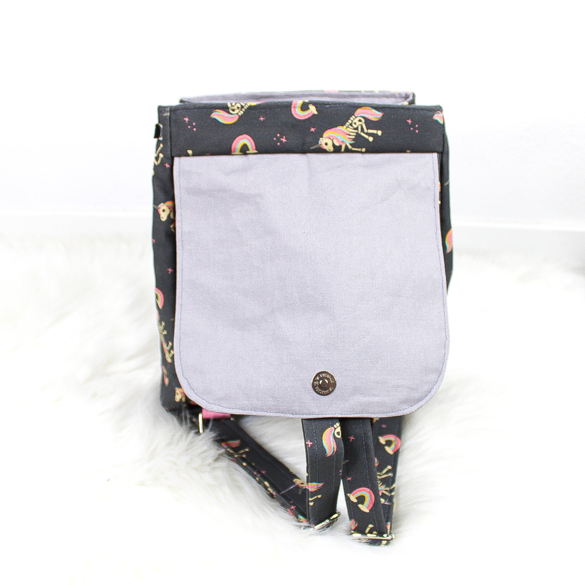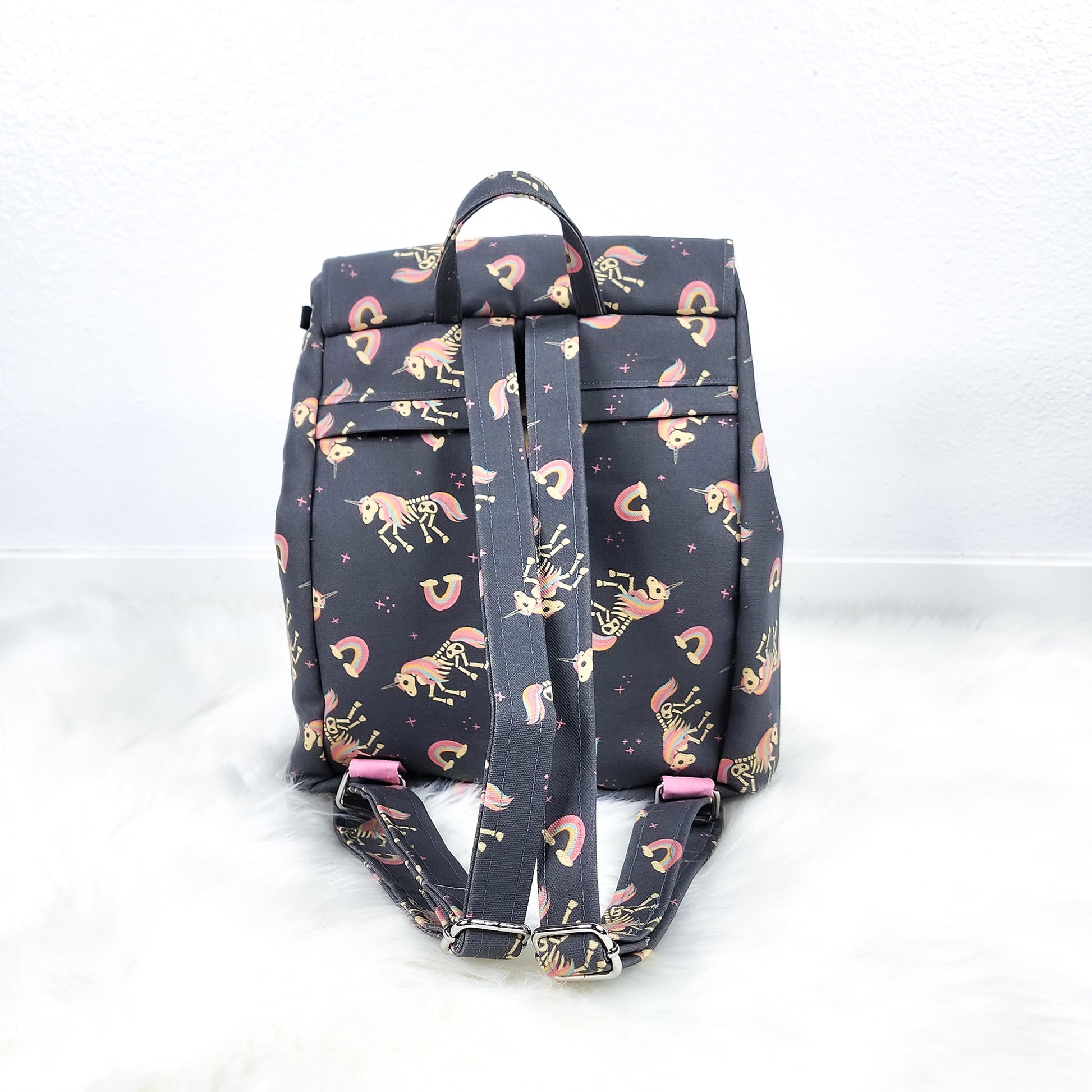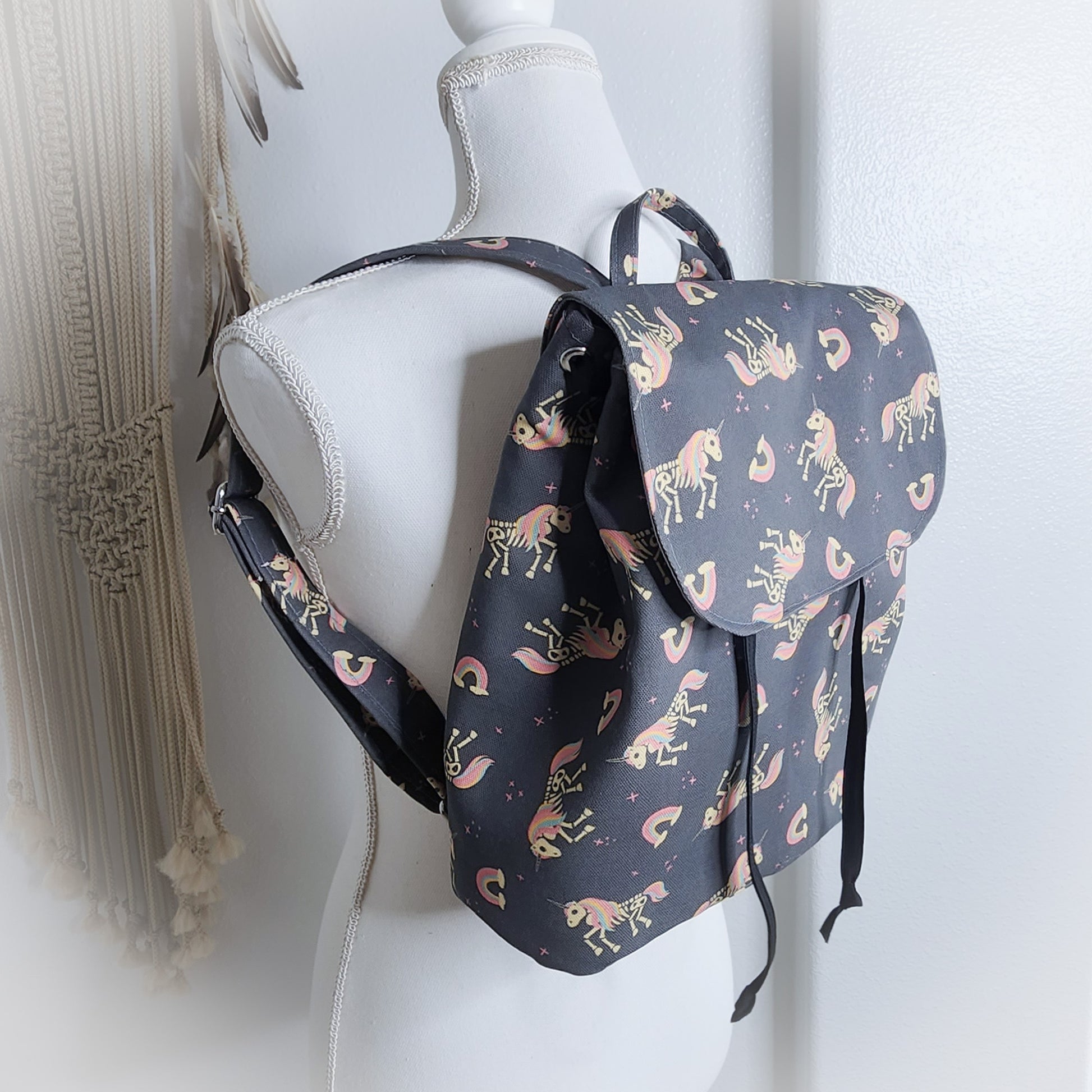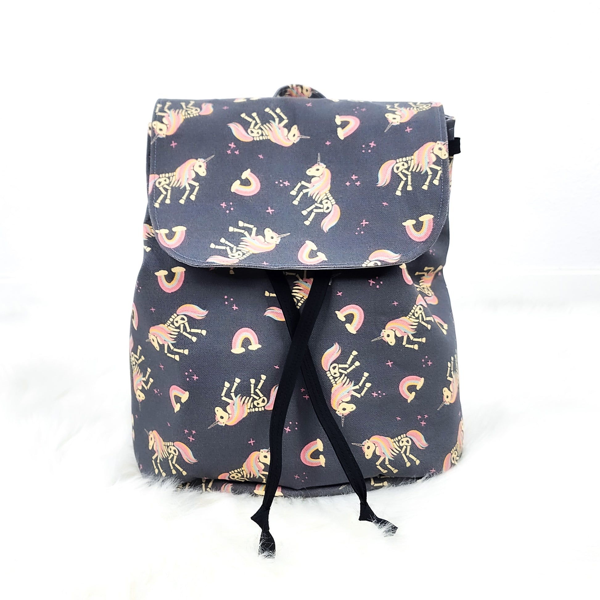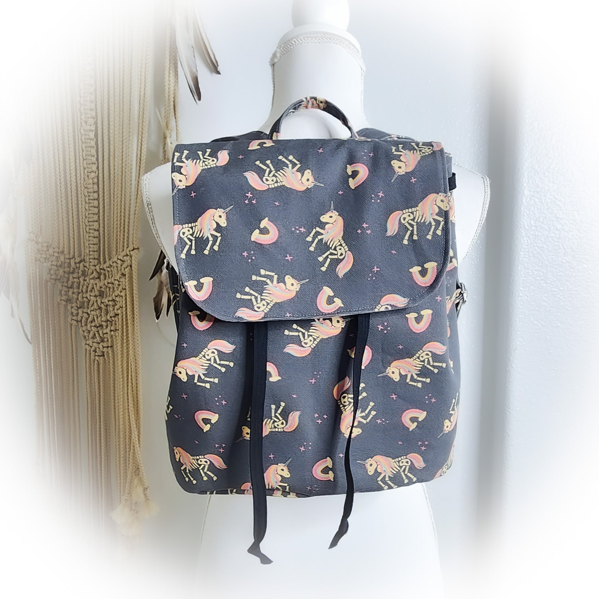 Spooky Skeleton Unicorn Backpack Purse, Handmade Gray Cinch Halloween Bag