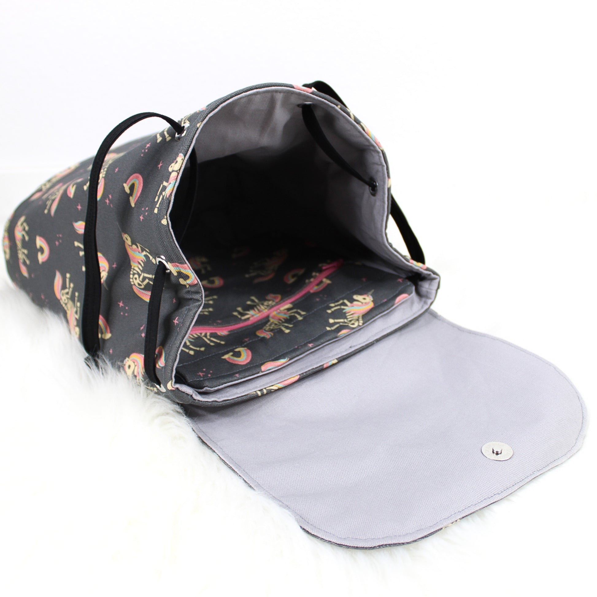 This enchanting bag is bewitched with spooky, but cute, skeleton unicorns with vibrant, neon rainbow mane. Gray, pastel pink, mint, yellow, orange and beige designs with matching interior pocket. Not only can you cinch it closed with a drawstring and magnetic clasp, but it's adjustable straps (plus one for hanging!) make it a cinch to tote around. It's even got an inner pocket with a zipper and a secret compartment at the back - making it easier than ever to keep your stuff safe and sound! Add this to your collection and you'll never need a purse again! Makes a super special gift for women, teenagers and kids!