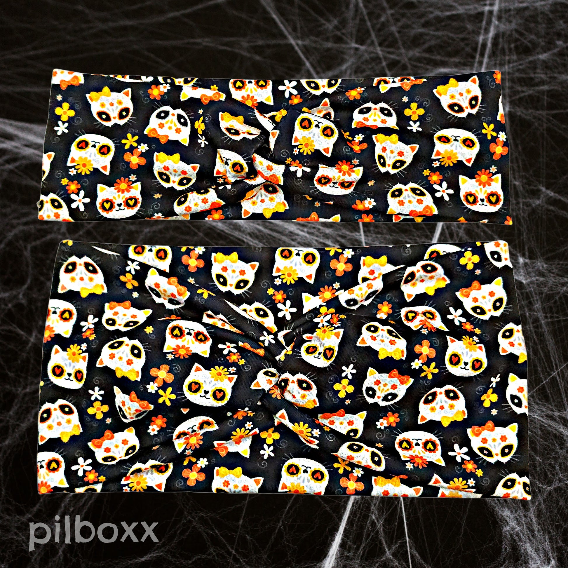 This headband features fall-themed sugar skull cats on a black background with cute, front twist detail (or not!) and is a great basic hair accessory to bump up that outfit of the day. Handmade from soft, lightweight and comfortable knit fabric for every day, all day, headache-free wear.