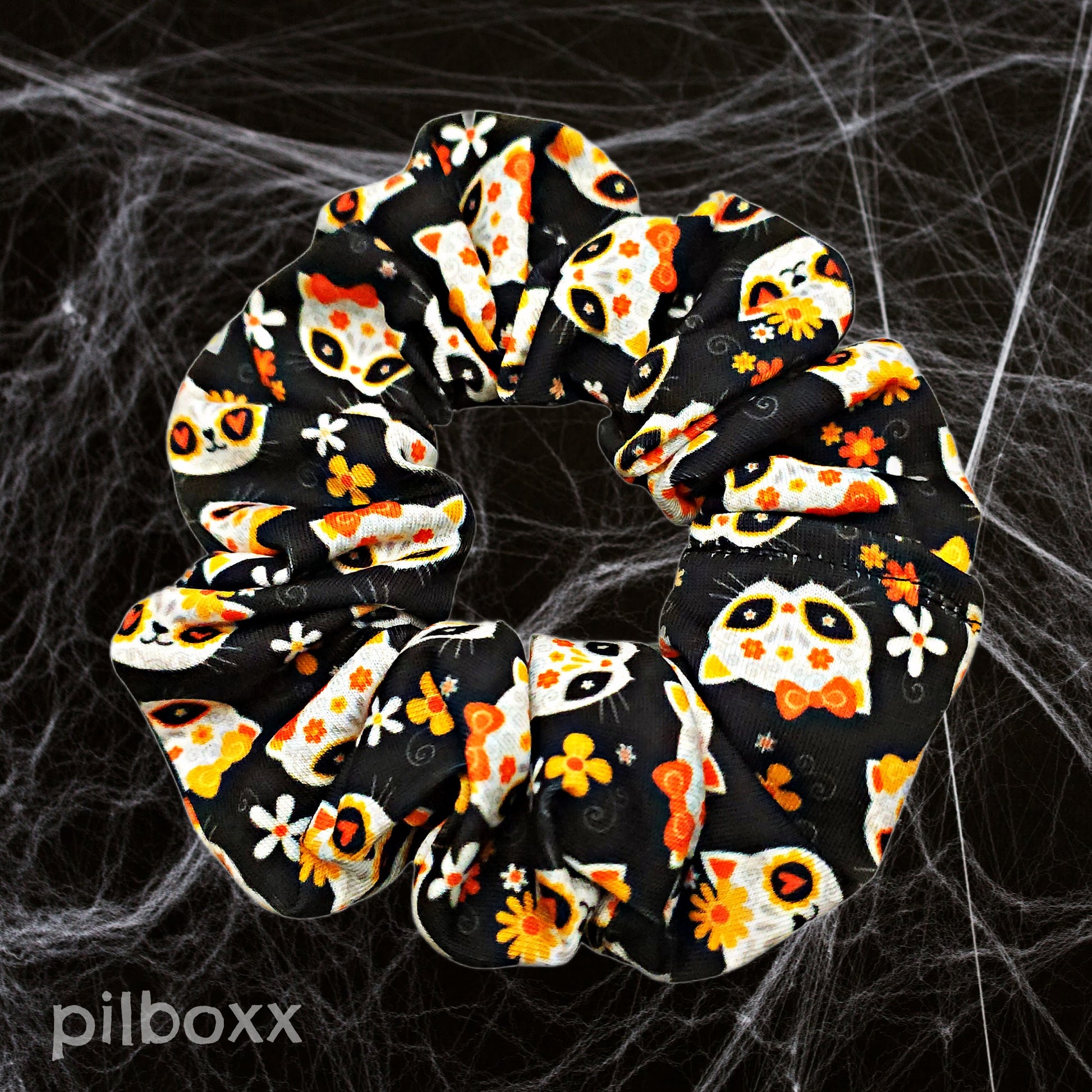 Sugar skull cats scrunchie, handmade from soft and stretchy jersey knit fabric. Wear your hair up with confidence that it won't break off your beautiful strands. The inside of my hair ties is made securely with flat, quality knit elastic sewn together inside, giving it a long life! These are all completely machine washable and can go in the drier, so throw it in with your regular clothing. They won't stretch, fade or lose their shape. And when you're not wearing it in your hair, it looks great on your wrist.