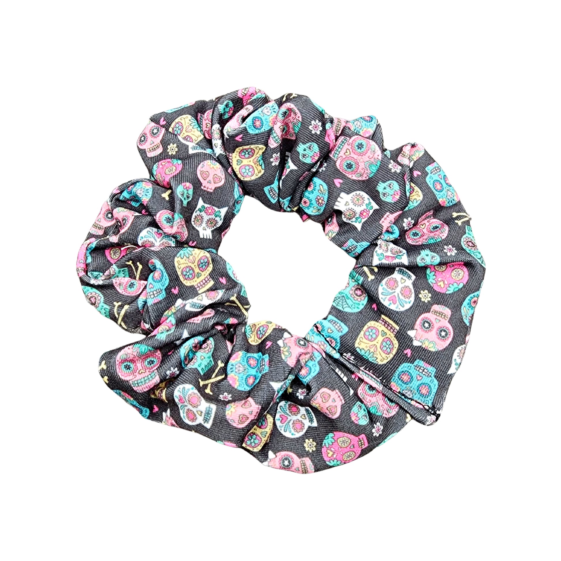 Sugar skull scrunchie, handmade from soft and stretchy jersey knit fabric. Wear your hair up with confidence that it won't break off your beautiful strands. The inside of my hair ties is made securely with flat, quality knit elastic sewn together inside, giving it a long life! These are all completely machine washable and can go in the drier, so throw it in with your regular clothing. They won't stretch, fade or lose their shape. And when you're not wearing it in your hair, it looks great on your wrist.