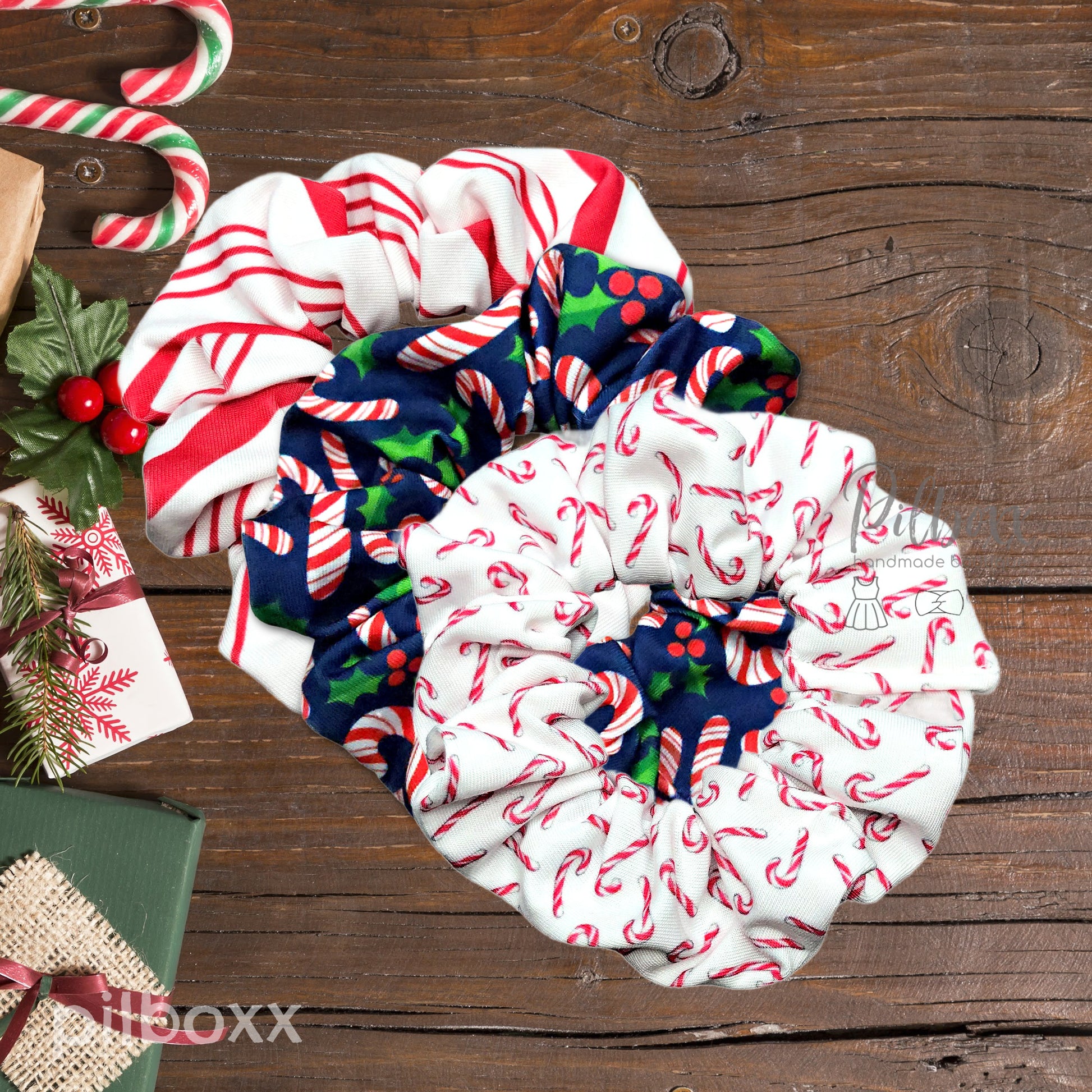 Candy cane themed hair scrunchies for women, teens and kids, perfect for the Christmas season. Handmade from soft and stretchy knit fabric that won't slip out of your hair. These make great stocking stuffers! The inside of my hair ties is made securely with flat, quality knit elastic sewn together inside, making them last. They won't stretch, fade or lose its shape. And when you're not wearing it in your hair, it looks great on your wrist.
