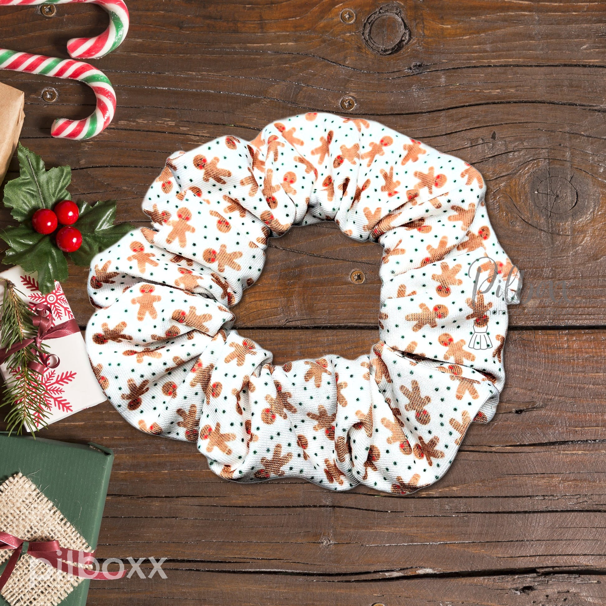 Gingerbread cookie scrunchie in white or blue, handmade from soft and stretchy jersey knit fabric. Wear your hair up with confidence that it won't break off your beautiful strands. The inside of my hair ties is made securely with flat, quality knit elastic sewn together inside, giving it a long life! These are all completely machine washable and can go in the drier, so throw it in with your regular clothing. They won't stretch, fade or lose its shape. And when you're not wearing it in your hair, it looks great on your wrist.