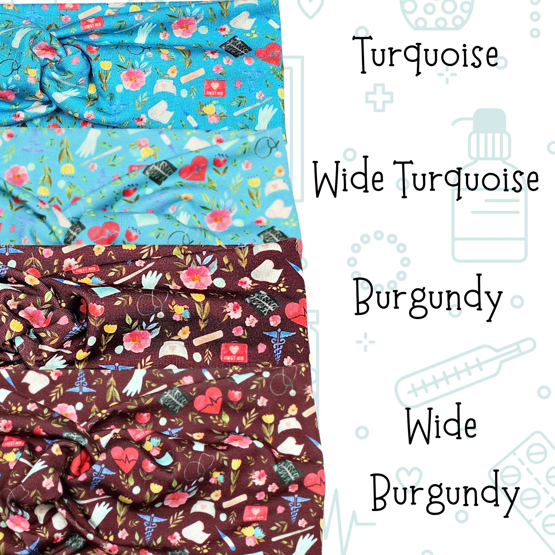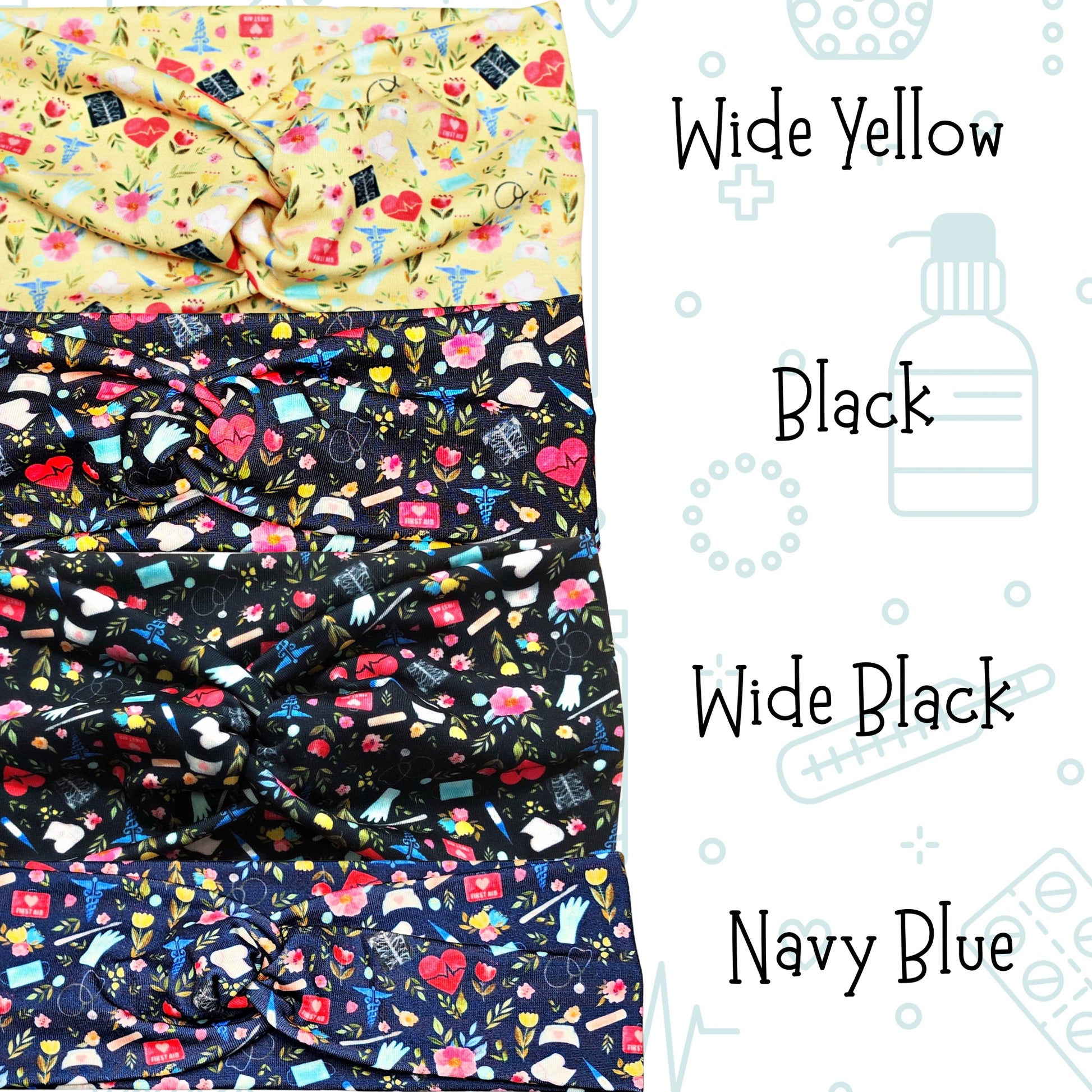 Stretchy medical supplies nurse print headbands. Choose your favorite. * if you don't want a twist in your headband, leave me a note in the cart saying "no twist". If ordering more than 1 headband, please specify for each.
