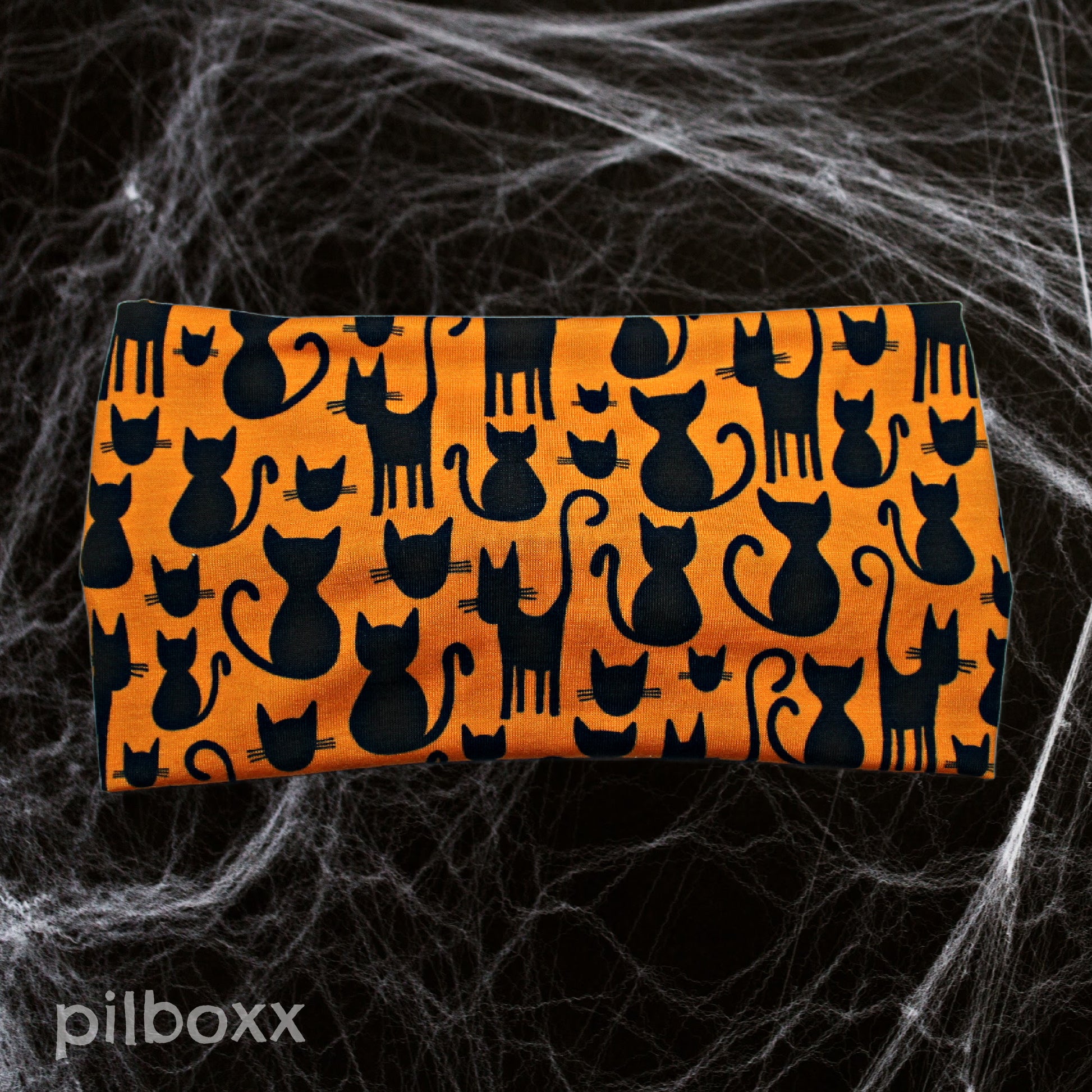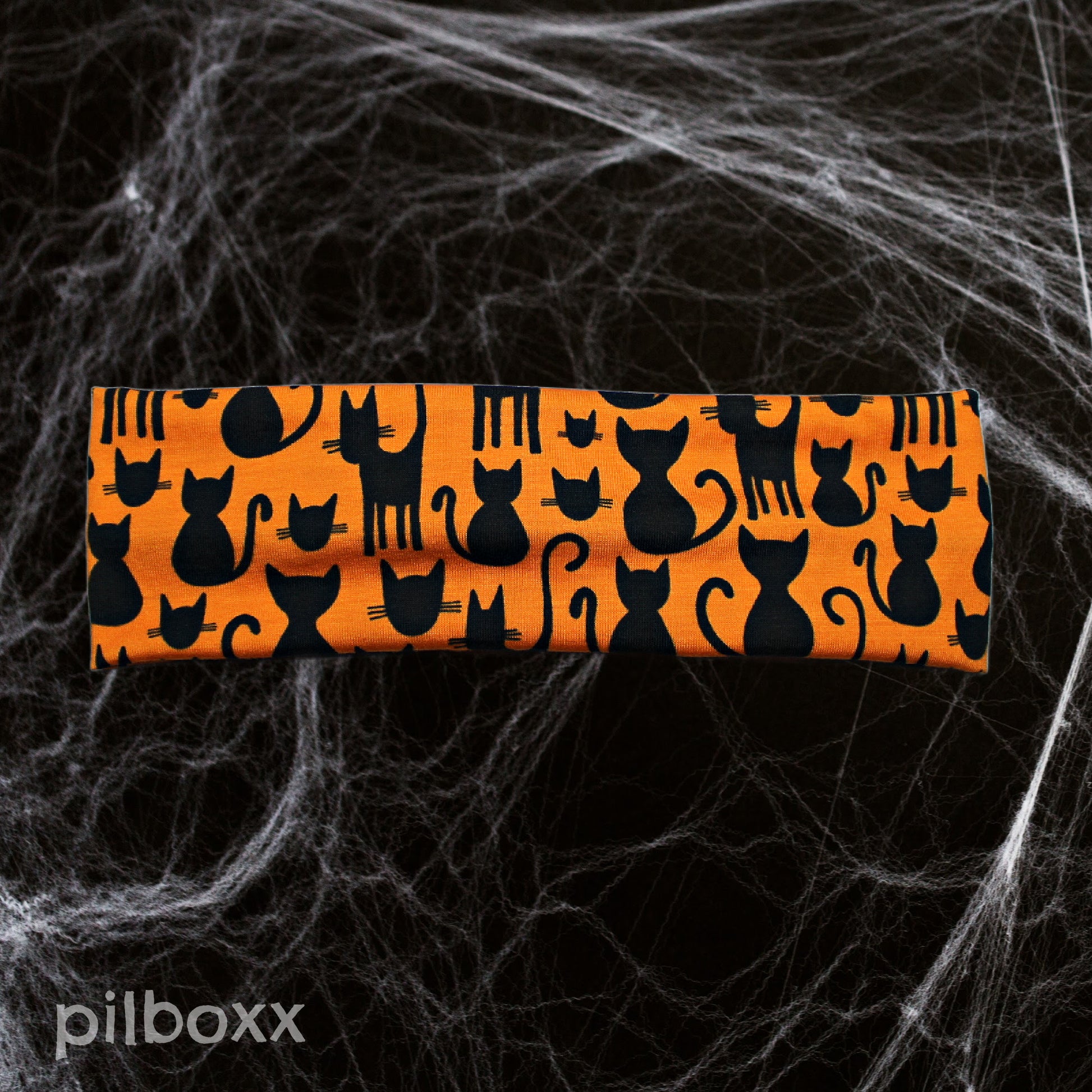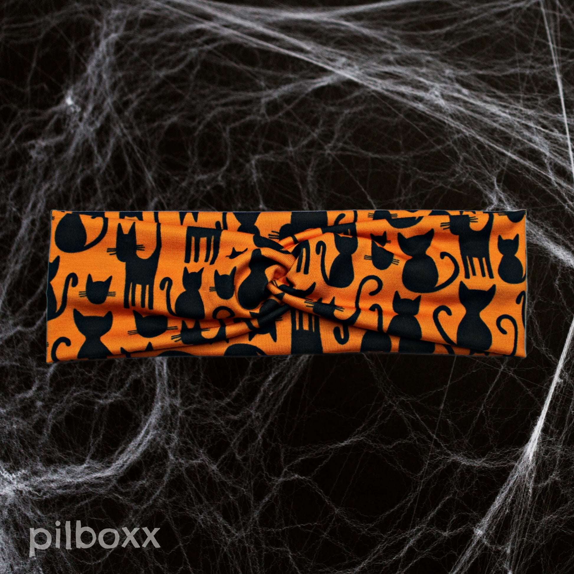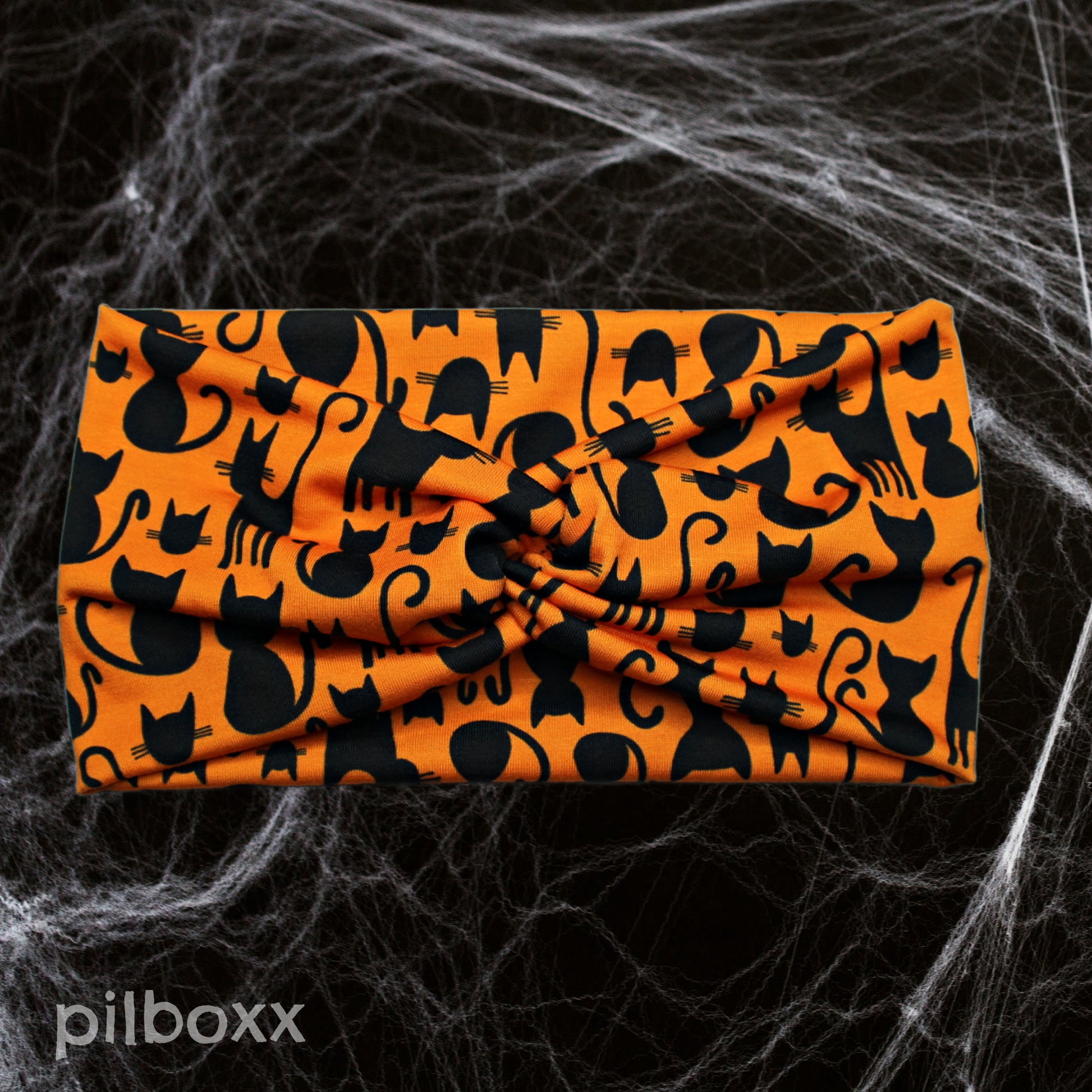 Orange black cat Halloween headband with front twist detail*. Handmade from lightweight and comfortable jersey knit fabric for everyday wear.