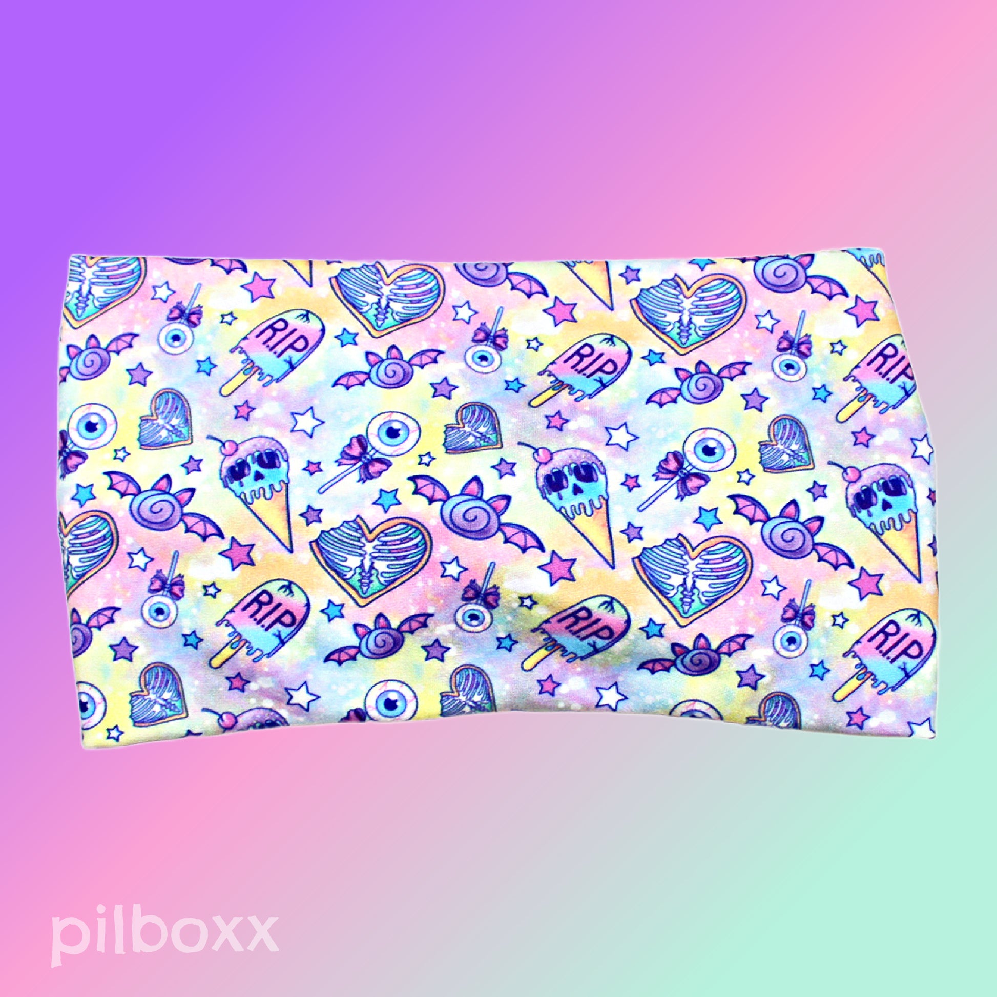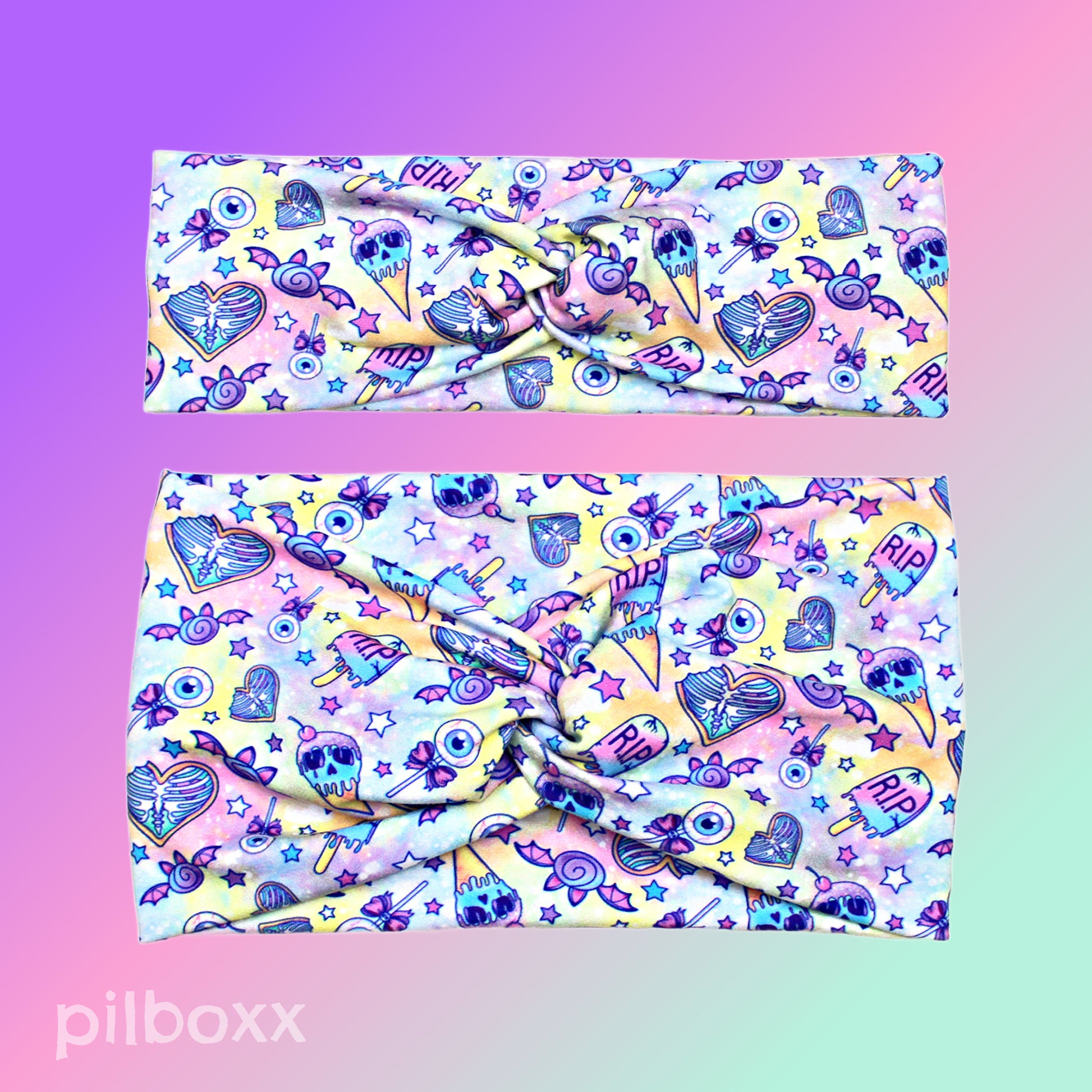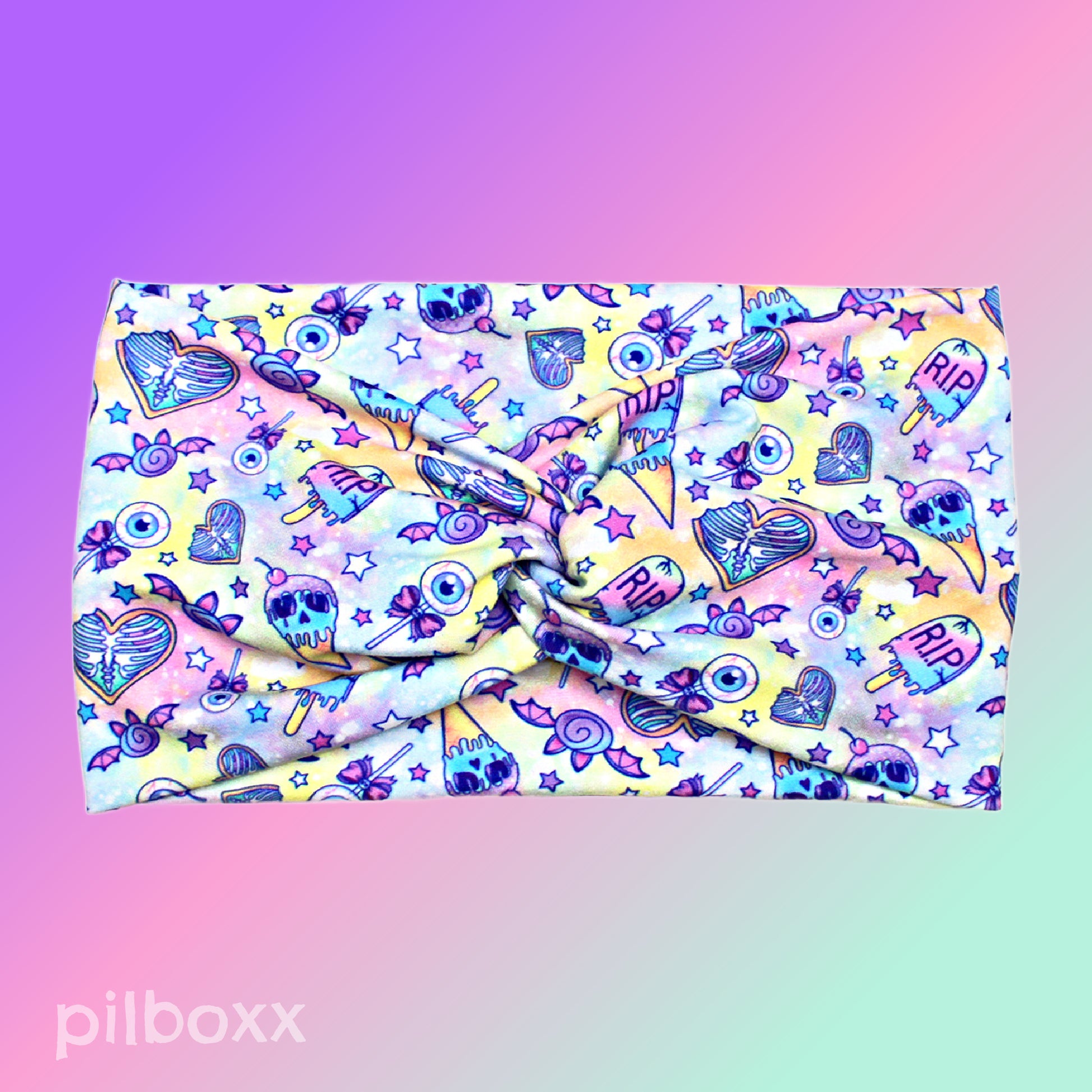 Pastel Halloween Candy Print Headband with front twist detail. Eyeball lollipops, candy bats, stars and heart ribcages on a swirly pastel pink, purple and yellow background. Handmade from super soft, lightweight and comfortable jersey knit fabric for everyday wear. You'll probably forget you're wearing it. ;)