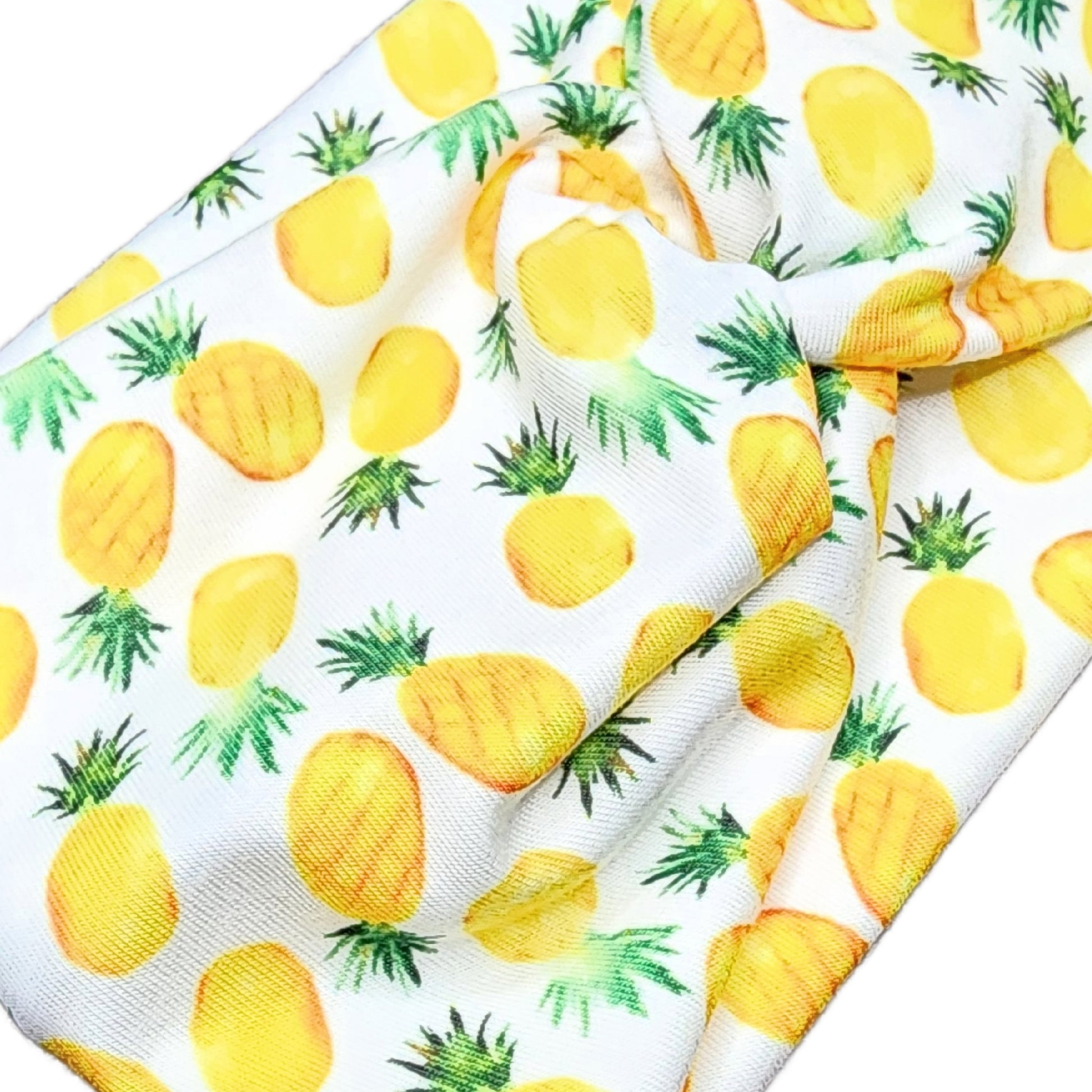 This wide, turban twist headband features yellow watercolor pineapples on a white background with cute, front twist detail (or not!) and is a great basic hair accessory to bump up that outfit of the day. Because it's stretchy, these hair bands fit adults and kids! Handmade from soft, lightweight and comfortable knit fabric for every day, all day, headache-free wear. Makes a great gift!