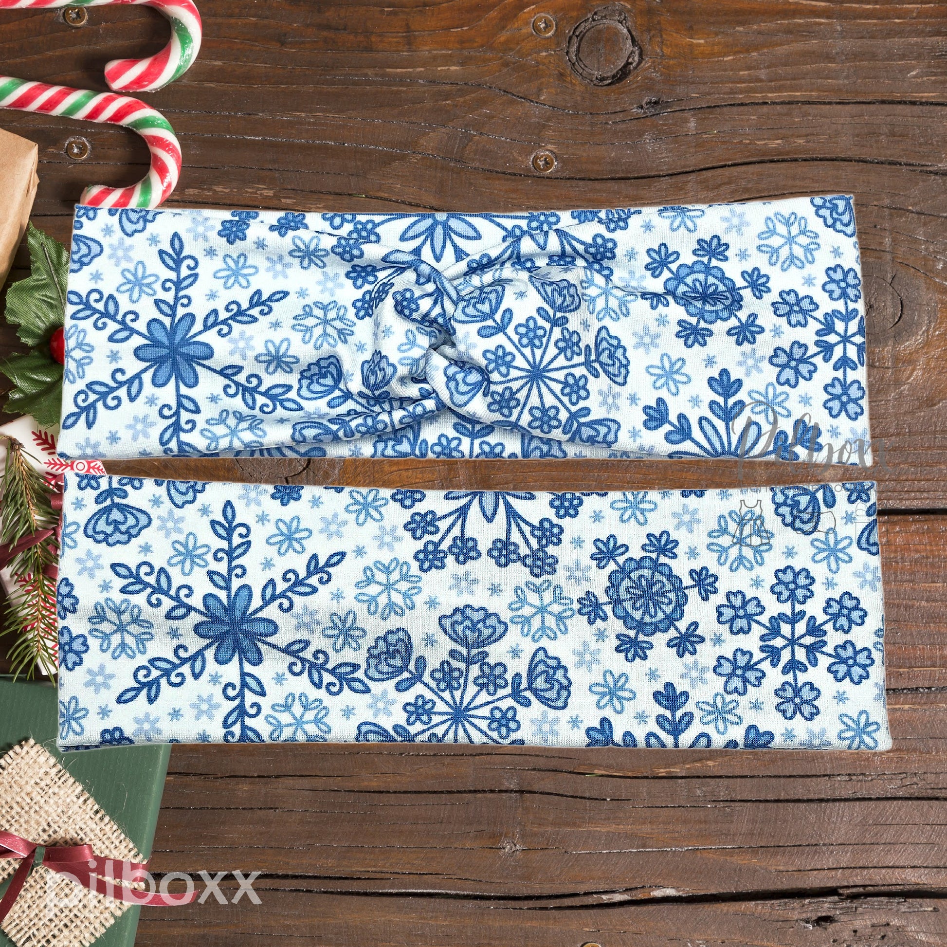 Blue winter floral snowflake headband for women with front twist*. Perfect for lazy days and gym days! Handmade from lightweight, super soft stretch fabric. Gift your bestie the gift of compliments and confidence with these headbands. They're guaranteed to bring smiles and attention with all the different styles and unique prints.