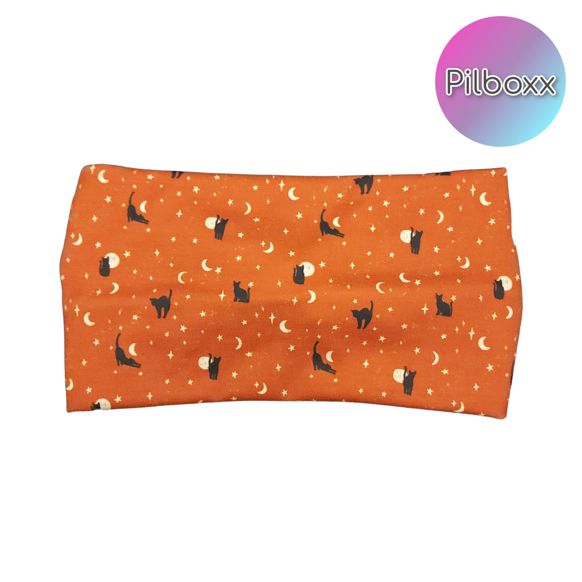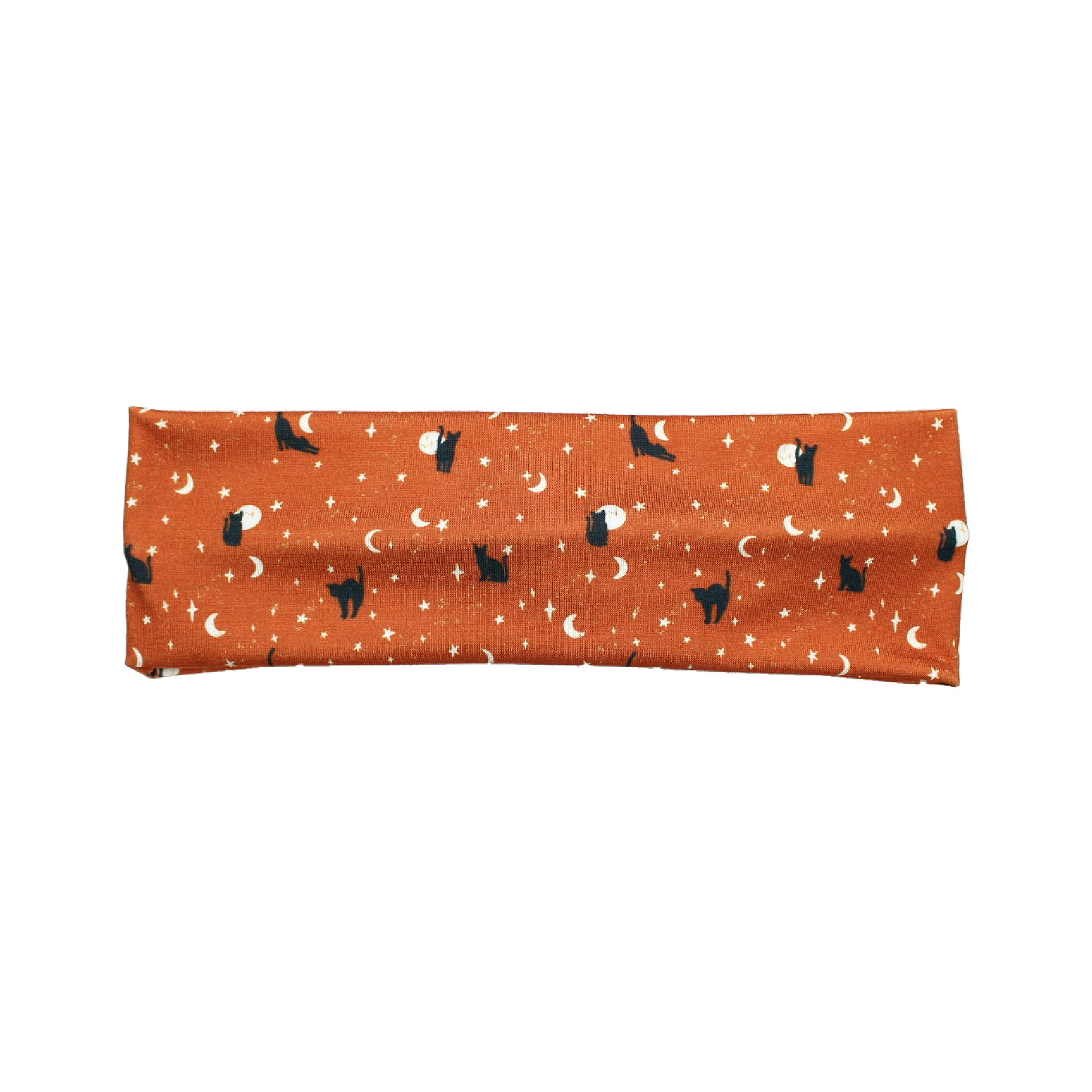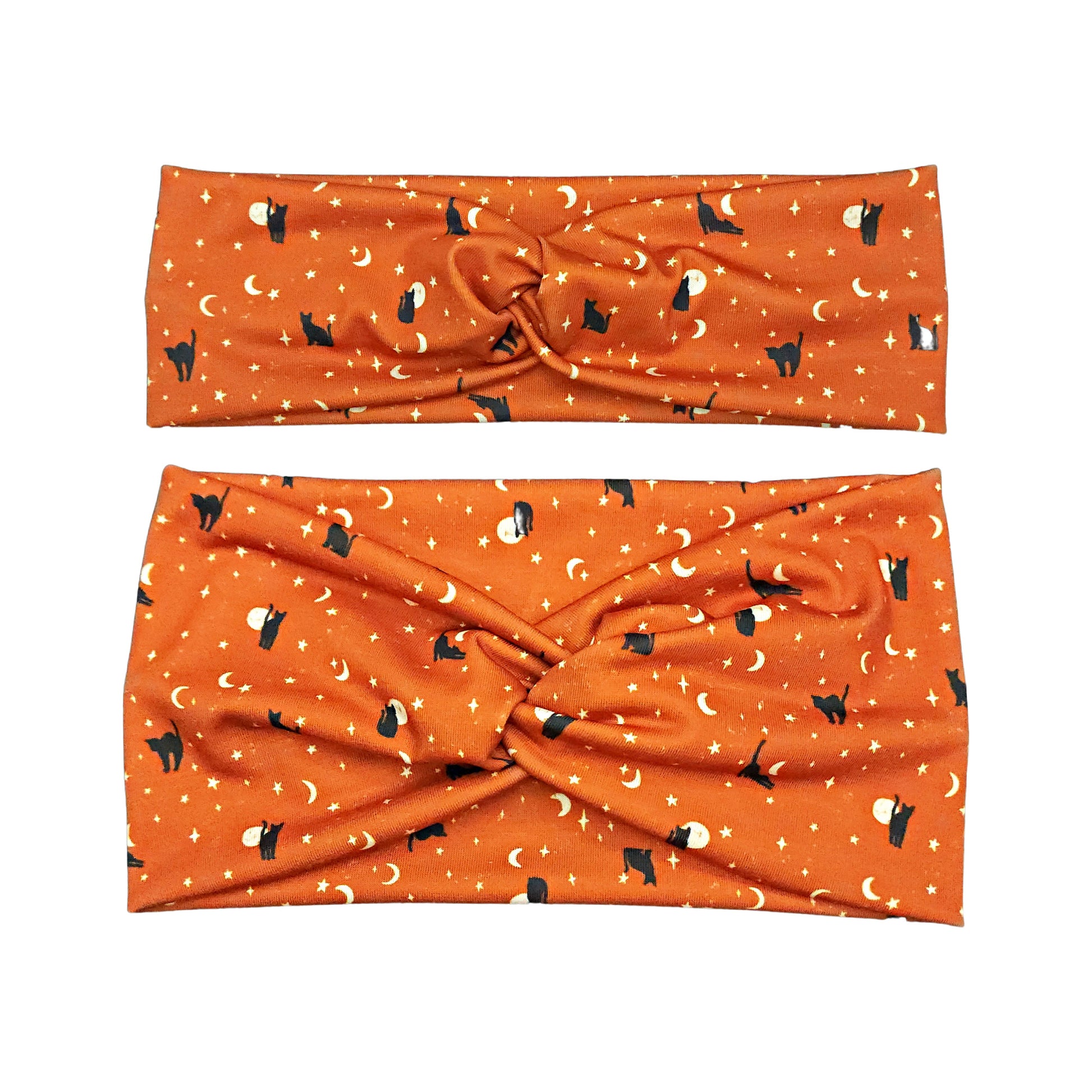 Celestial cat headband for women and girls with front twist detail in pumpkin orange. Handmade in the USA from lightweight, soft, stretchy and comfortable knit fabric for all day wear. Available in matching scrunchies.